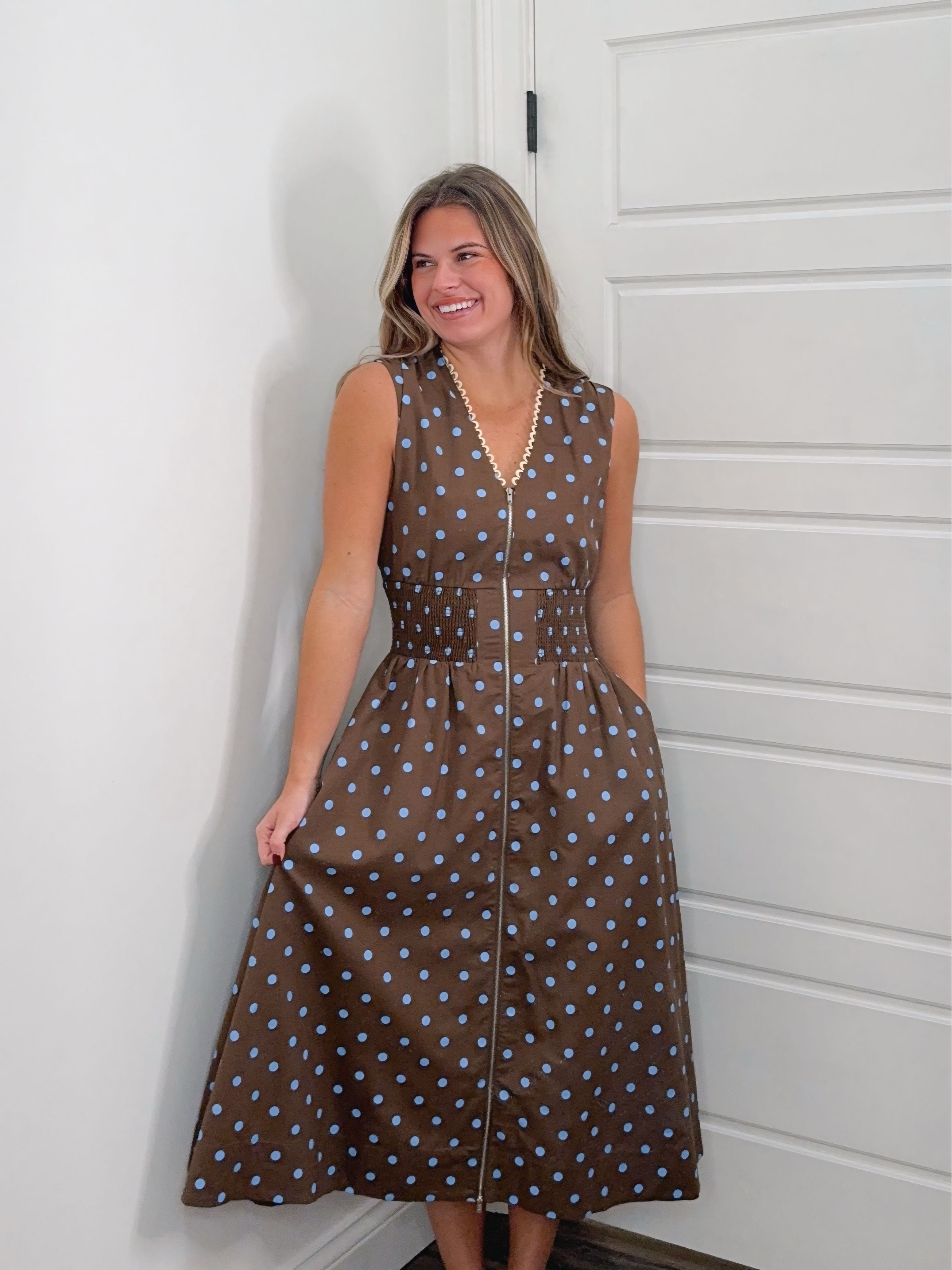 Slip into effortless style with The Blueberry Mocha Midi, a charming brown dress that celebrates the perfect pairing of rich, warm tones and cheerful blue polka dots. This midi-length beauty strikes the ideal balance between casual and put-together, making it your go-to for everything from coffee dates to weekend adventures. The playful dot pattern adds personality without overwhelming the classic silhouette, while the versatile brown base pairs beautifully with nearly everything in your closet. Whether you're dressing it up with heels or keeping it cozy with sneakers, this dress delivers comfort and style in one delightful package.