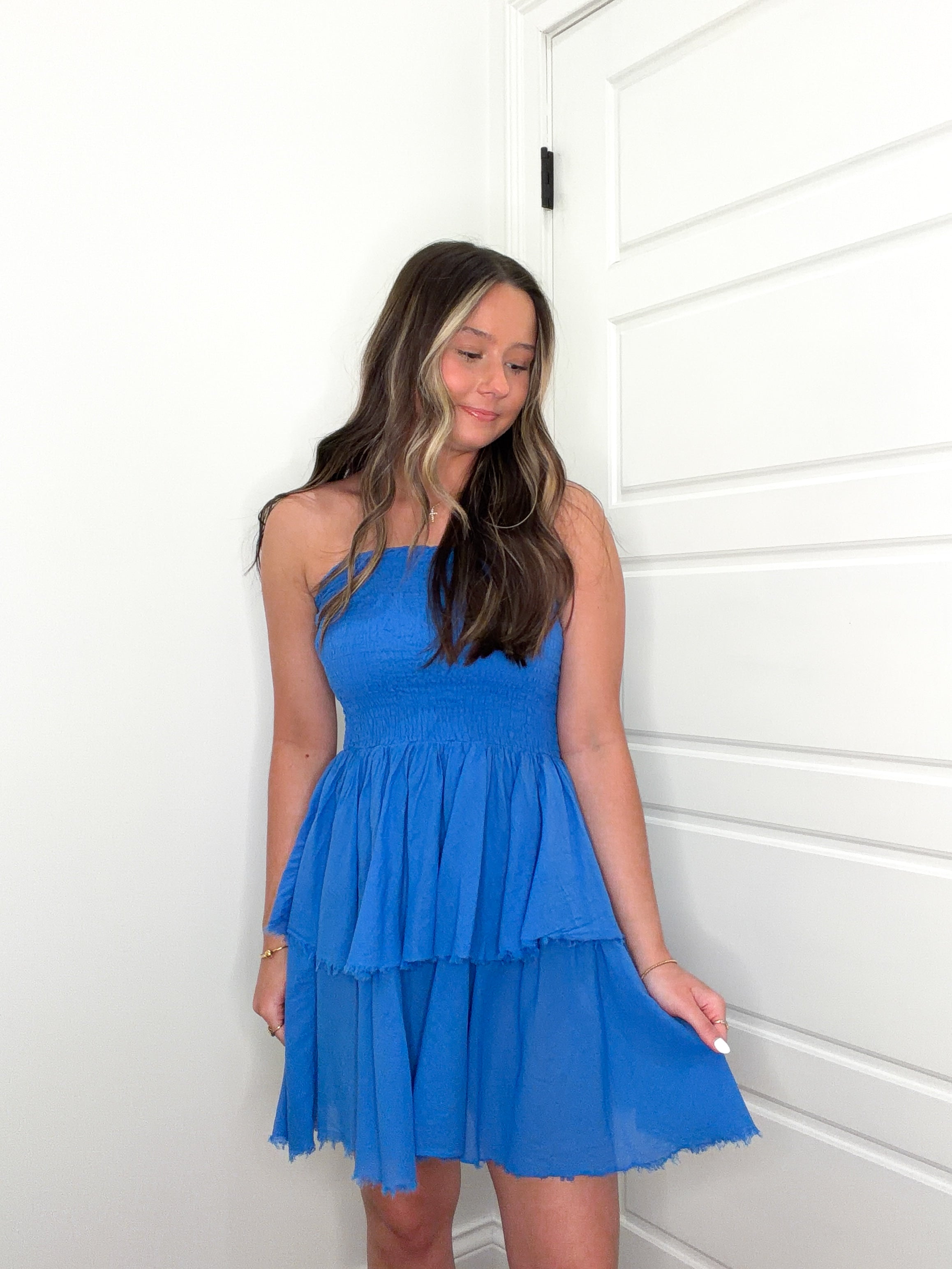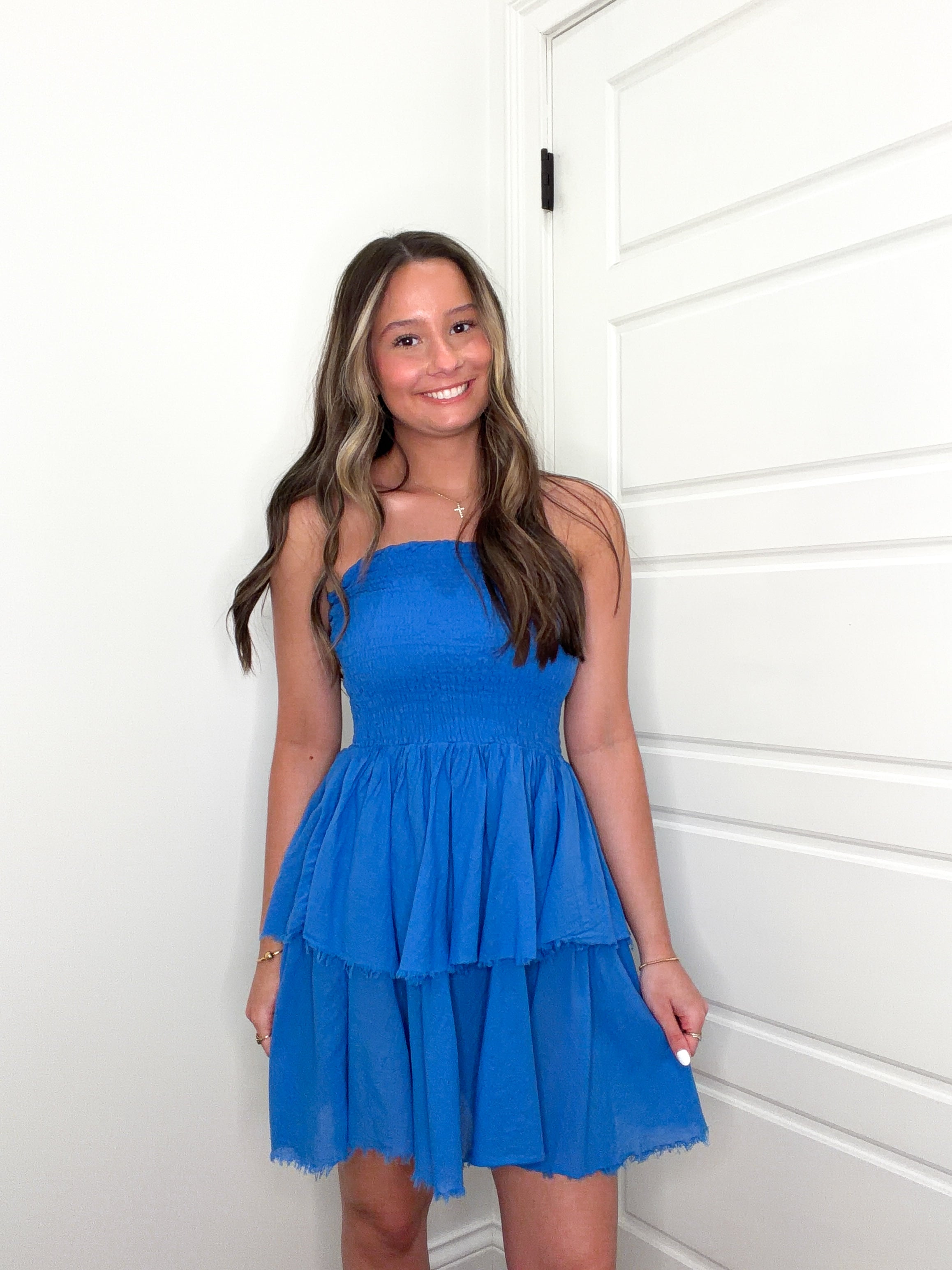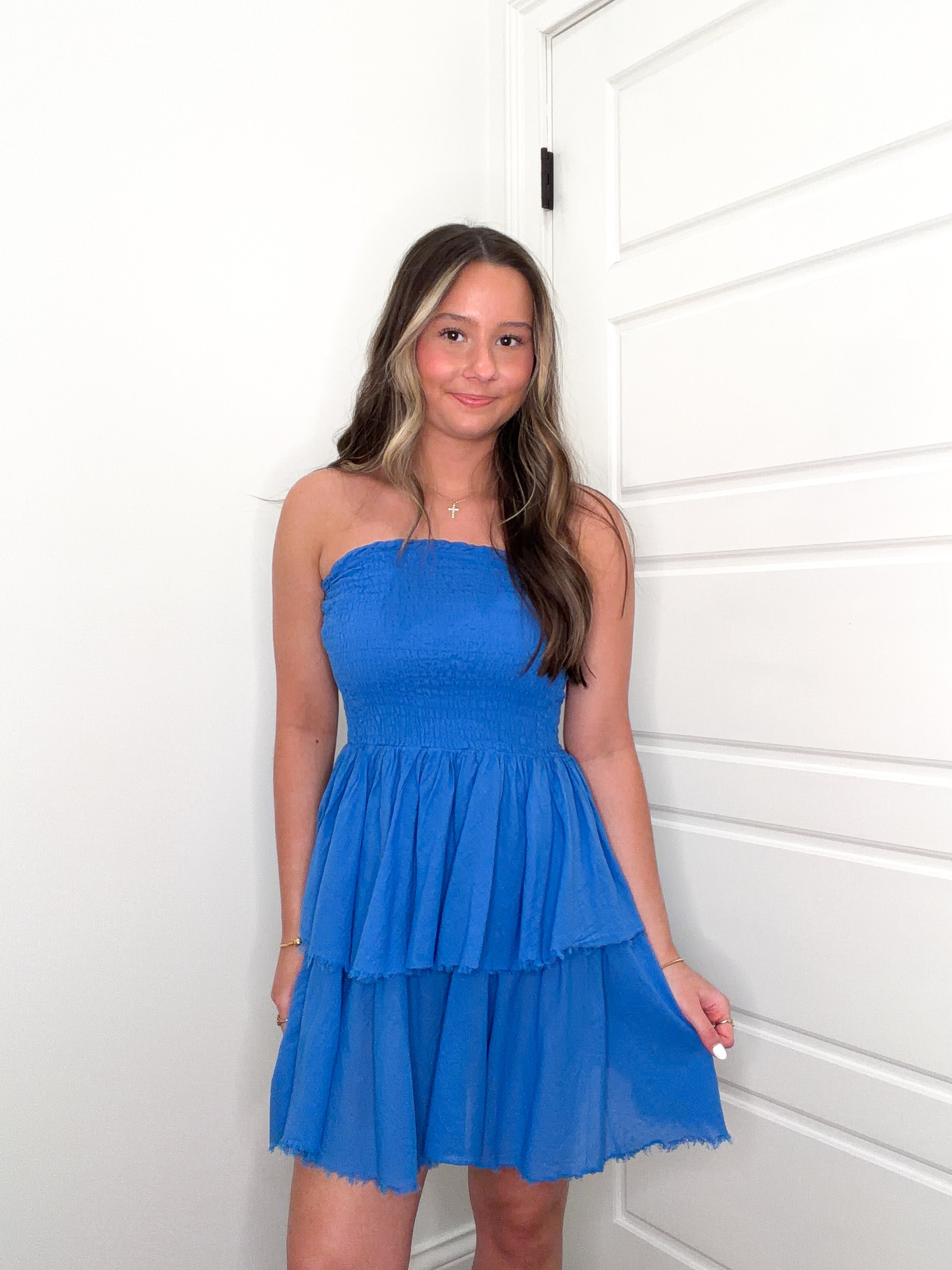 Make waves in this stunning cobalt blue mini dress that commands attention from every angle. The Tidal Twist features a flirty strapless neckline and eye-catching frayed tiered layers that create movement and dimension with every step. Perfect for nights out, beach parties, or whenever you want to turn heads, this playful piece combines bold color with an effortlessly chic silhouette. Dress it up with heels or keep it casual—either way, you'll be the most captivating person in the room.