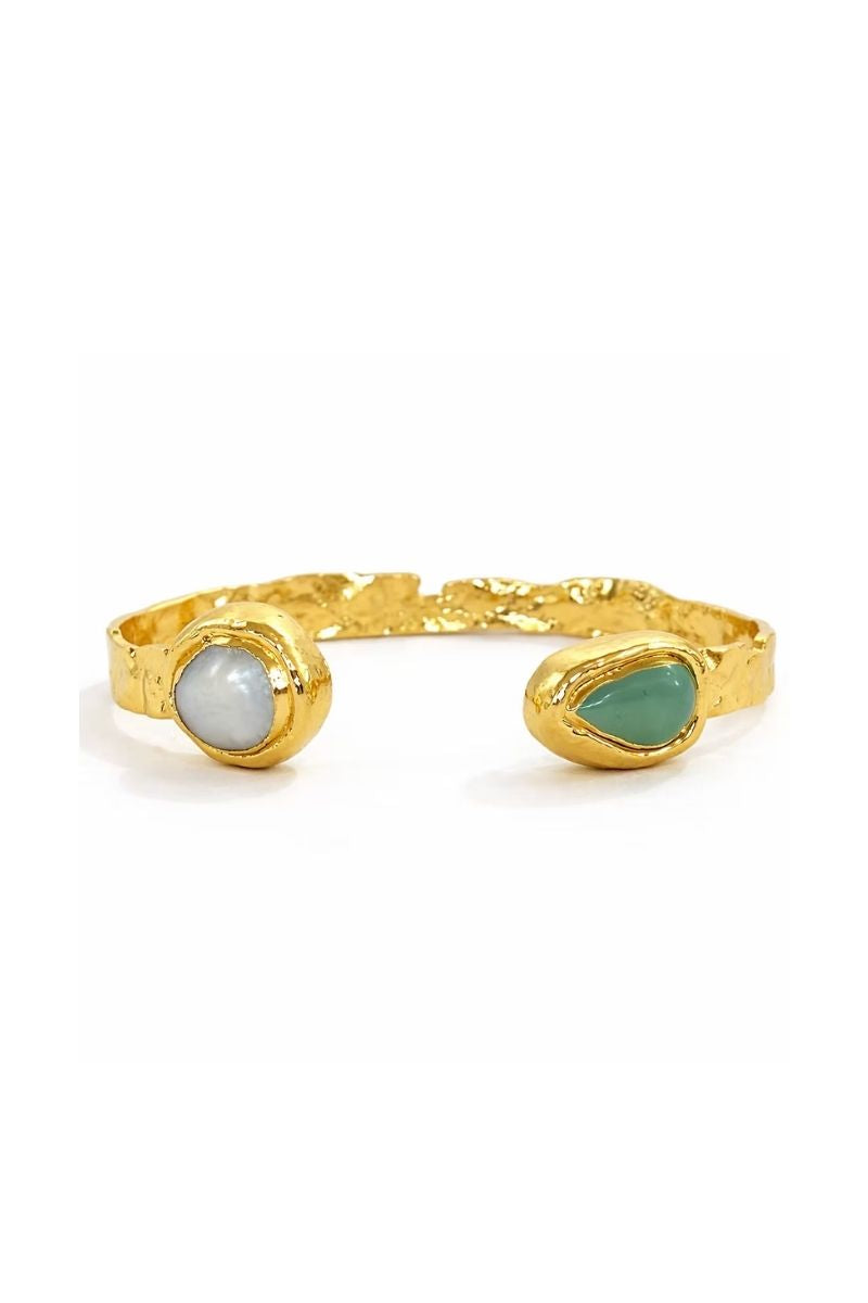 Slip on elegance with the Maia Cuff, a radiant gold-plated bracelet that brings just the right amount of sparkle to your wrist. Adorned with a lustrous pearl and striking blue stone, this charming piece effortlessly transitions from everyday wear to special occasions. Whether you're dressing up or keeping it casual, the Maia Cuff adds a touch of sophistication with a wink of fun.