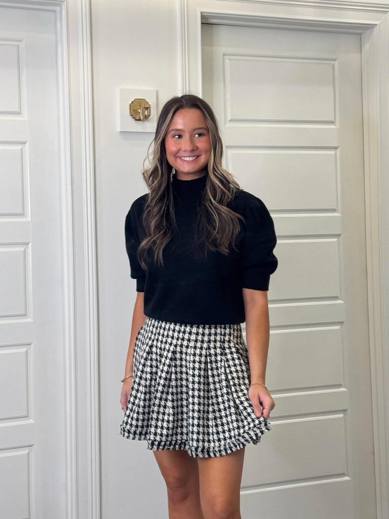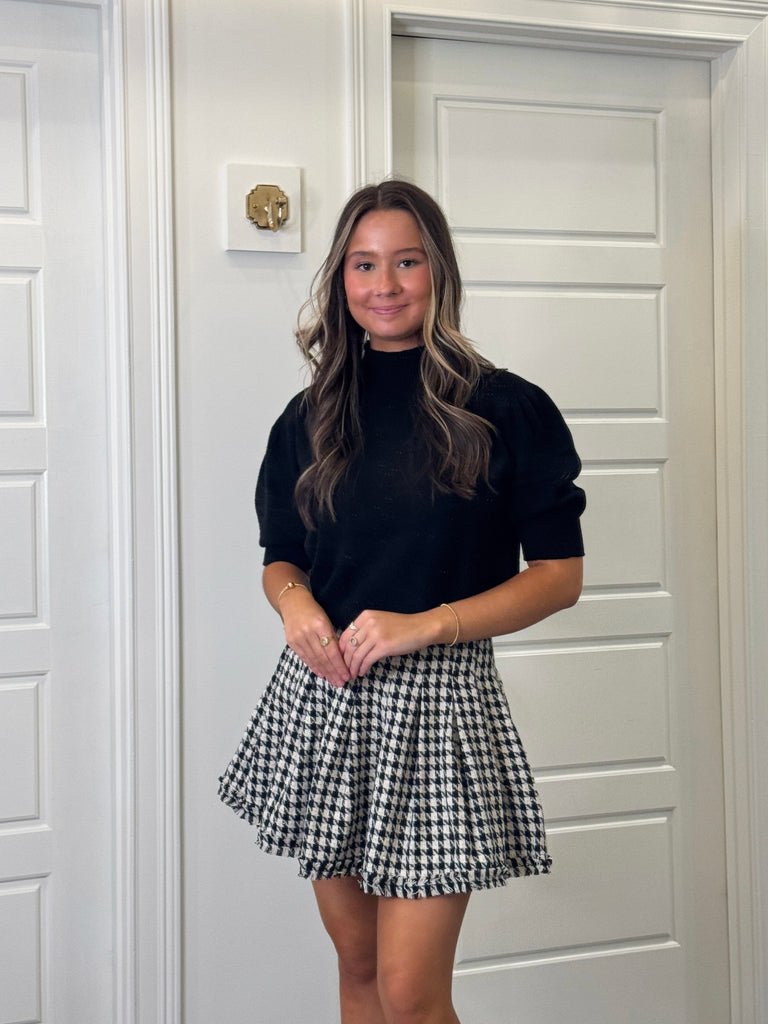 Step out in style with the Houndstooth Hill Skirt, featuring a classic houndstooth pattern sprinkled with charming gold flecks. Its playful short length adds a flirty twist, perfect for turning heads whether you’re out for brunch or dancing the night away. This skirt brings a little sparkle to your day while keeping your look sharp and fun.