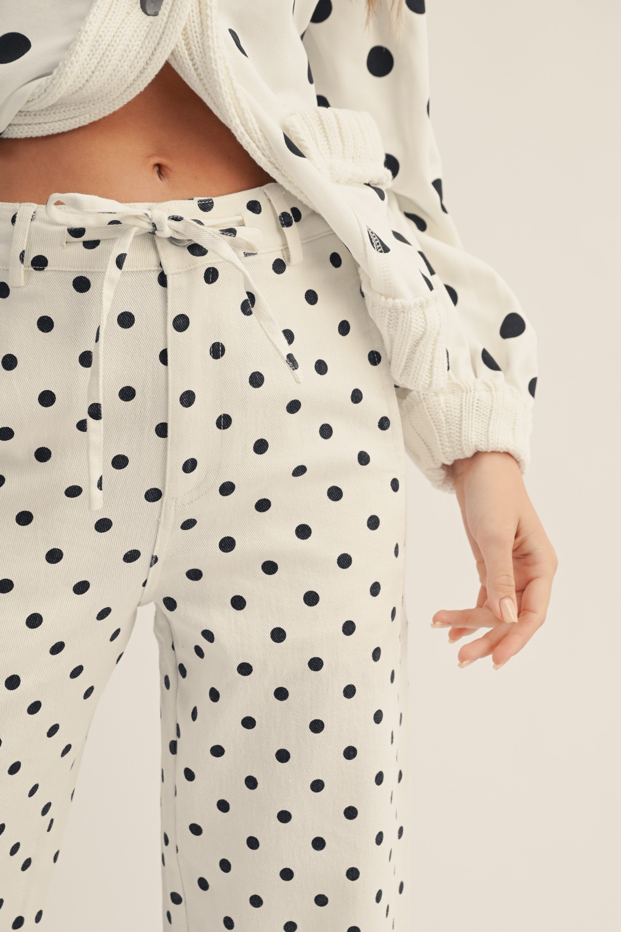 Introducing The Monroe Dot Jean—where classic style meets fun flair! These crisp white jeans feature charming black polka dots that instantly elevate your everyday look. The built-in tie waist belt offers adjustable comfort and a flattering silhouette, while the wide-leg cut delivers that effortless, on-trend vibe. Perfect for dressing up or down, these playful jeans are your new go-to for making a statement without trying too hard.