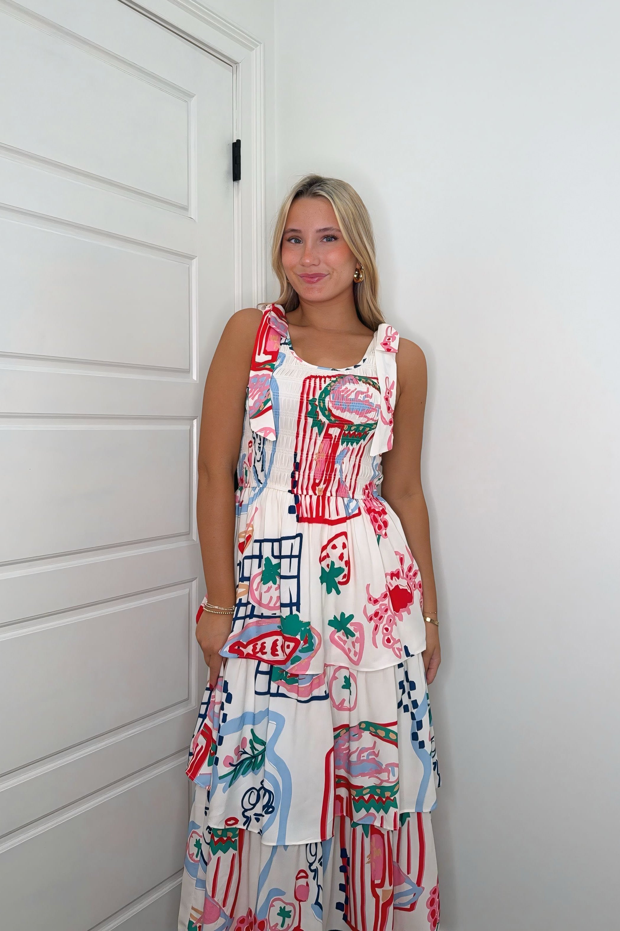 Escape to paradise with the On DND Midi Dress, your new vacation essential. This breezy white midi features a vibrant fruit pattern that brings tropical vibes wherever you go. Perfect for beach days, resort dinners, or those spontaneous getaway moments, it's the dress that says "I'm ready for adventure." Slip it on and instantly feel the warm breeze and carefree energy of island living.