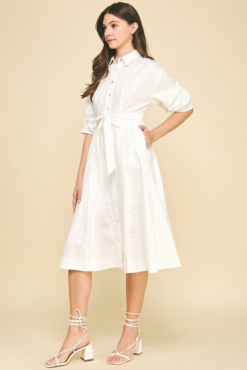 Effortlessly chic and ready for anything, this Seaside Button Midi Dress brings coastal vibes to your everyday wardrobe. The crisp white button-down design pairs perfectly with its flattering midi length, while short sleeves keep things breezy and comfortable. Cinch the tie belt to define your silhouette and create endless styling possibilities—dress it up for brunch or down for casual outings. A versatile piece that transitions seamlessly from season to season.