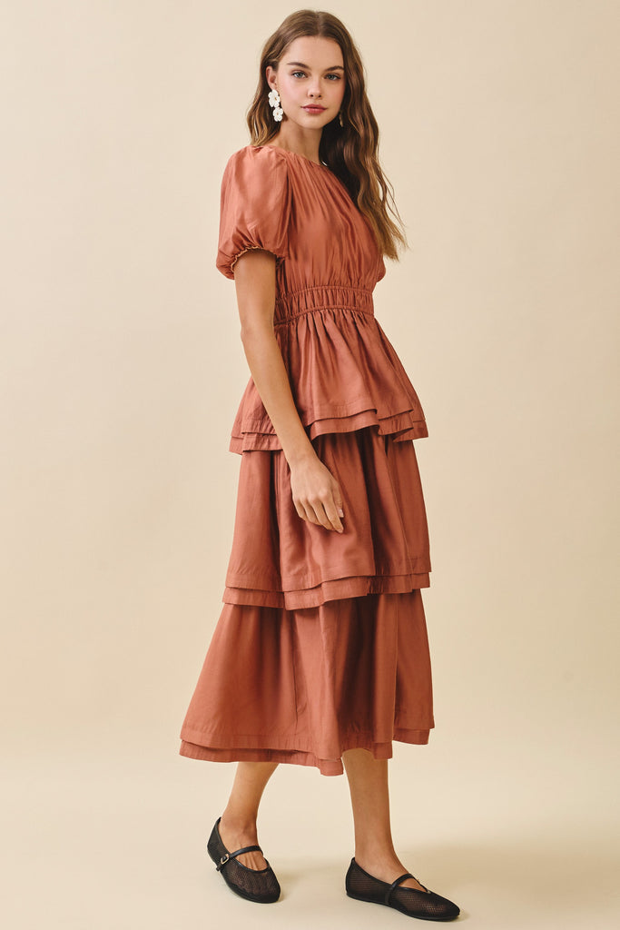 Embrace the charm of autumn with The Rustling Leaves Dress. This rust orange midi features playful puff sleeves, a smocked waist for a flattering fit, and a layered tiered skirt that adds volume and movement. The gathered bodice and round neckline create a sweet silhouette, while the back keyhole closure adds a subtle touch of surprise. Perfect for twirling through crisp fall days in style.