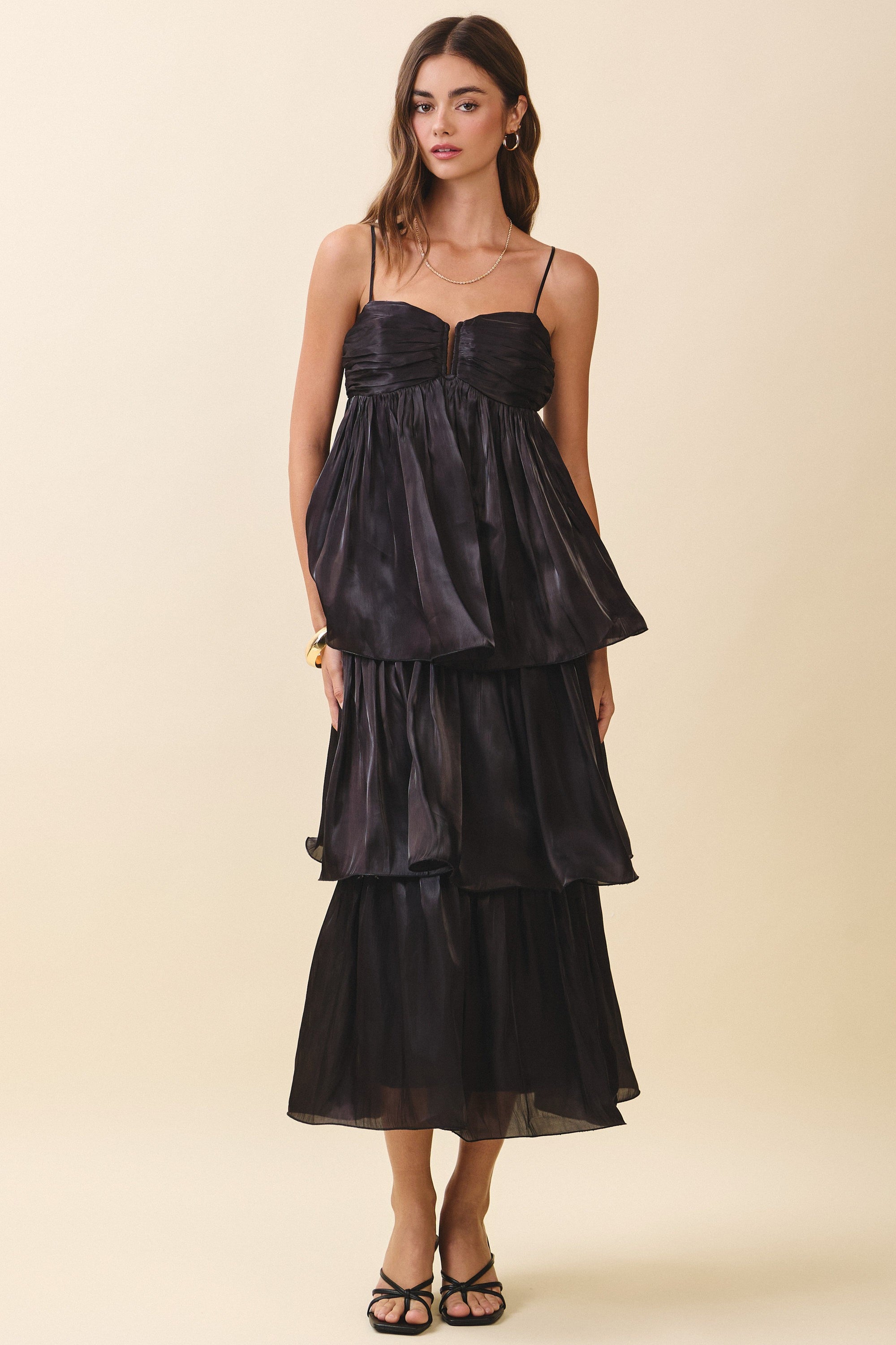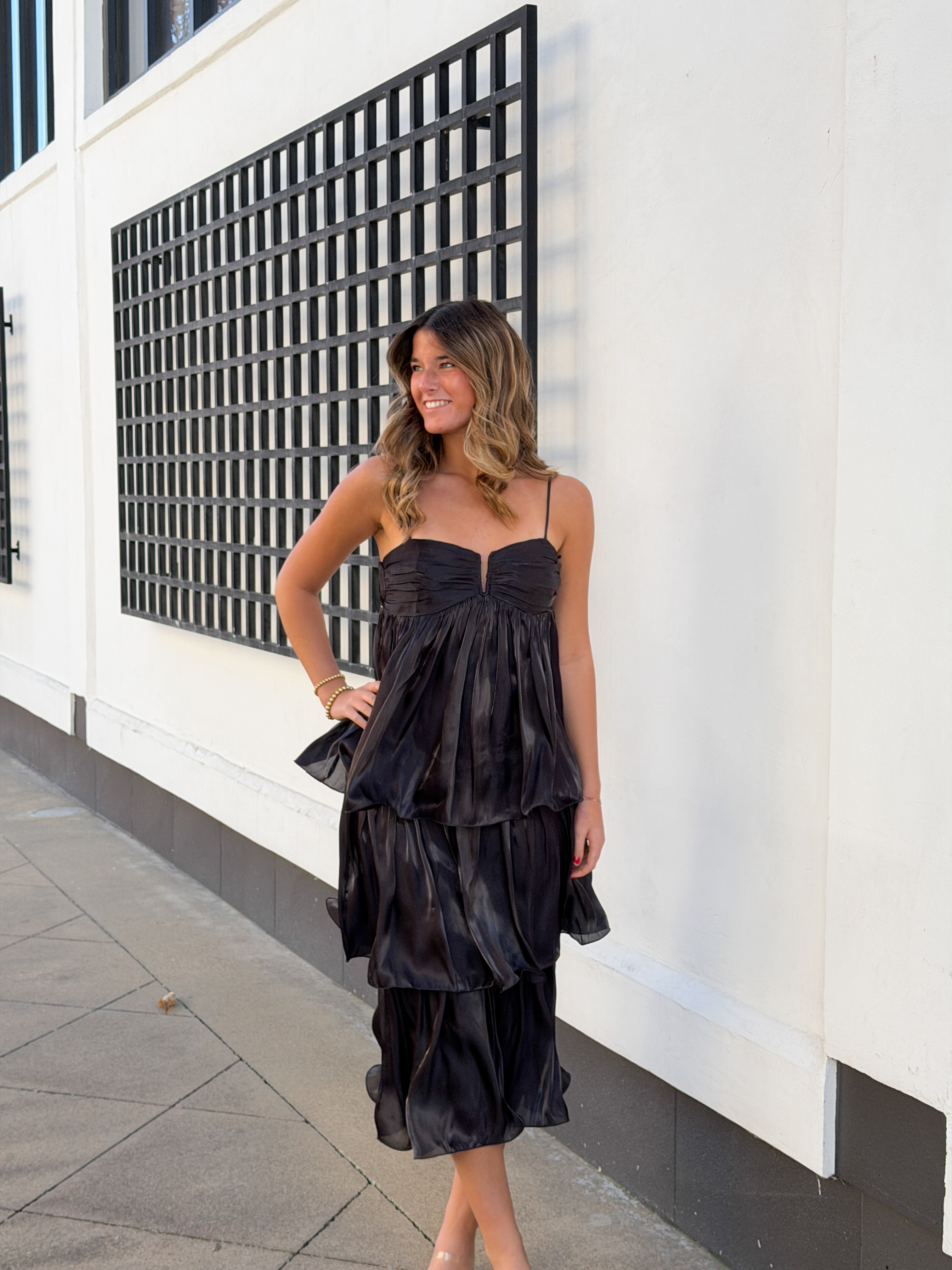 Slip into elegance with The Midnight Tiered Dress, where sophistication meets fun. This satin stunner features a flattering ruched bust and adjustable spaghetti straps that let you customize your fit. Cascading tiers create movement and dimension, while the flowy silhouette glides beautifully with every step. A hidden back zipper keeps the look seamless and chic. Perfect for nights out, special occasions, or whenever you want to feel absolutely fabulous.