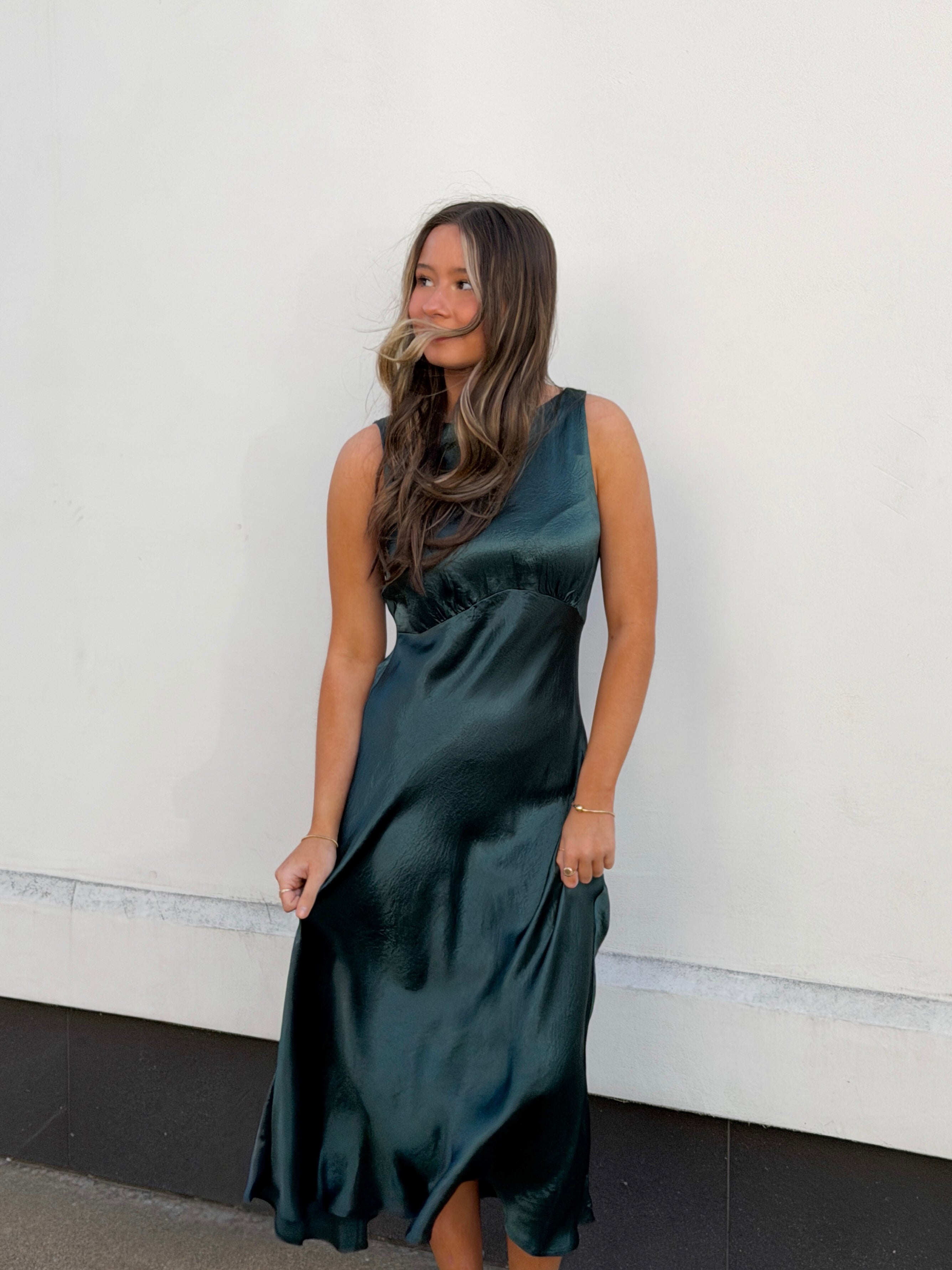Elevate your holiday lineup with The Satin Spruce Dress—a show-stopping satin number that means business in the best way possible. The high neckline adds an air of sophistication while the luxurious fabric drapes beautifully, creating an effortlessly chic silhouette. Perfect for festive gatherings, elegant dinners, or any occasion calling for a touch of glamour. This dress proves that timeless style never goes out of season.