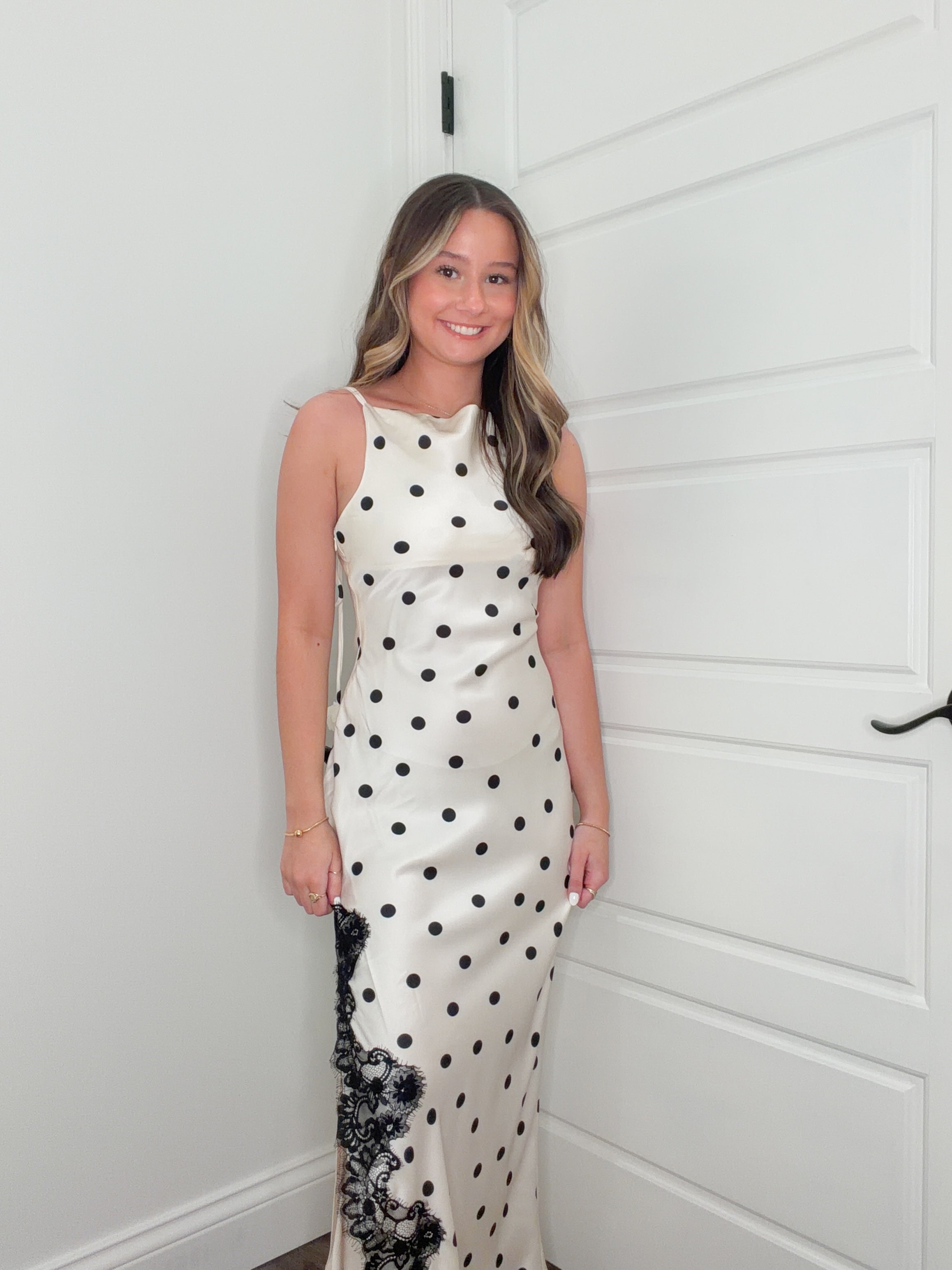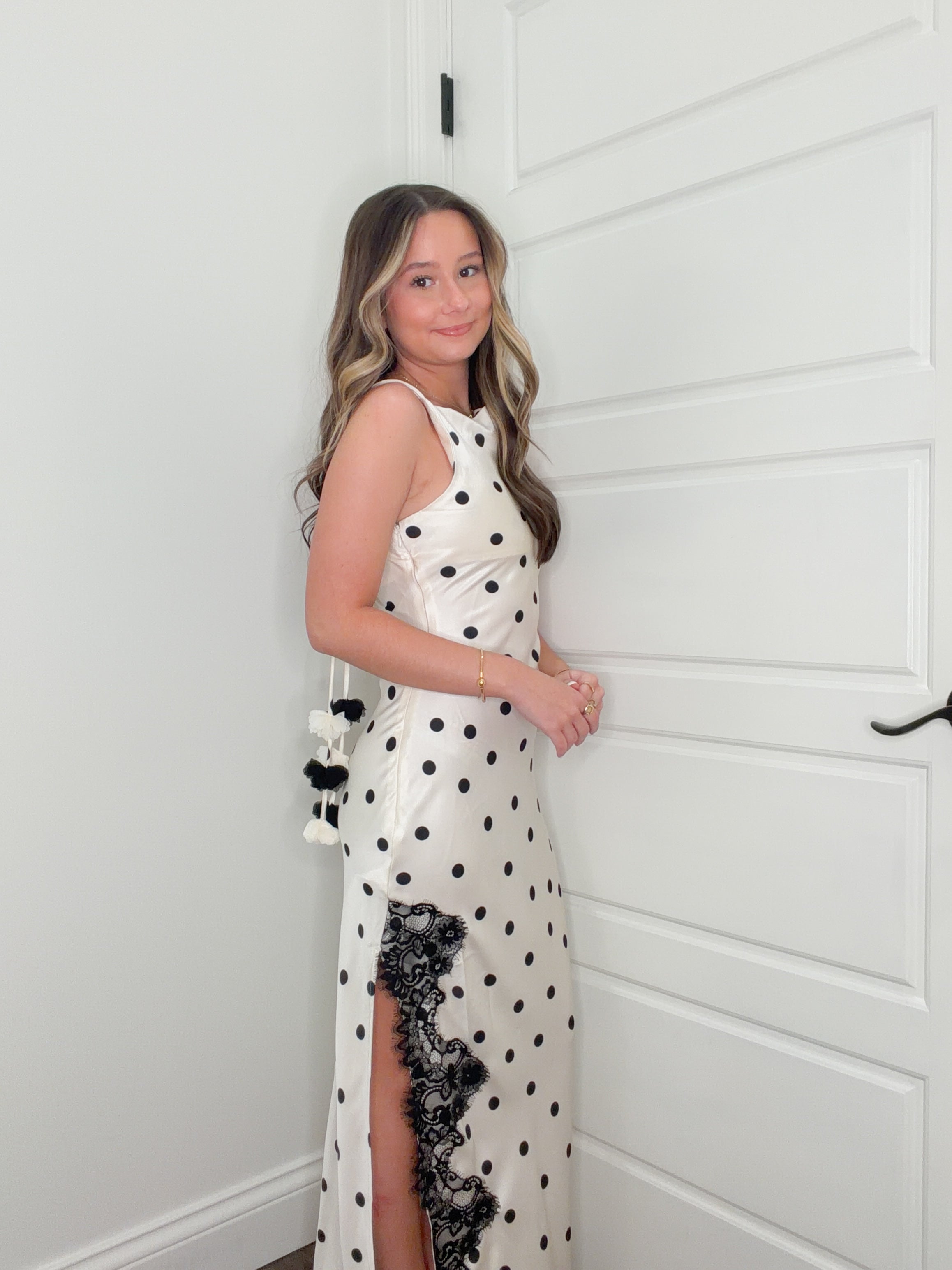 Slip into sophistication with our Late Night Dinner Dress—an ivory silk stunner adorned with charming black polka dots. This show-stopping piece features a chic high neckline and delicate shoulder ties finished with whimsical floral accents that dance down the back. A sultry side slit trimmed with intricate lace adds just the right amount of allure. Perfect for evening events, date nights, or whenever you want to turn heads with effortless elegance and playful style.