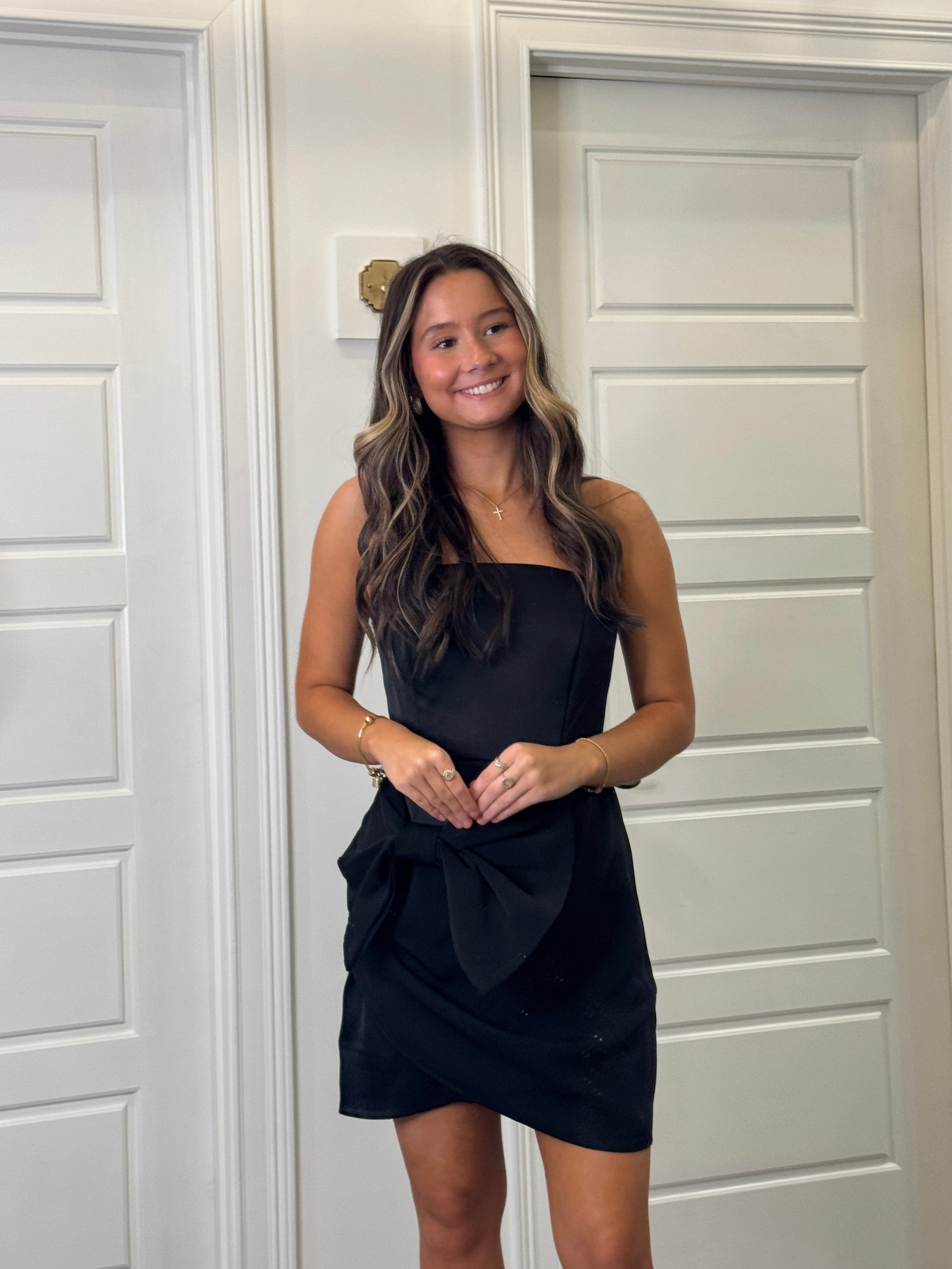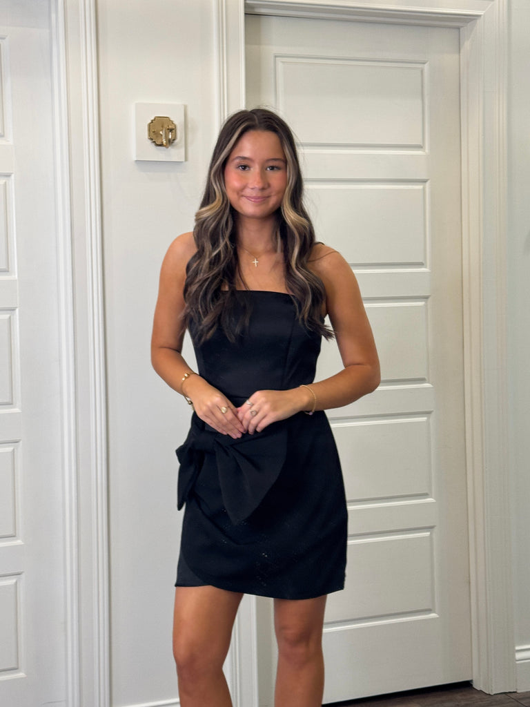 Step out in style with the Own The Night Dress—a black, strapless short dress featuring a bold, oversized bow at the front. This playful design promises to turn heads and make every evening feel special. Perfect for making a statement, its chic silhouette lets you own the night with confidence and charm.