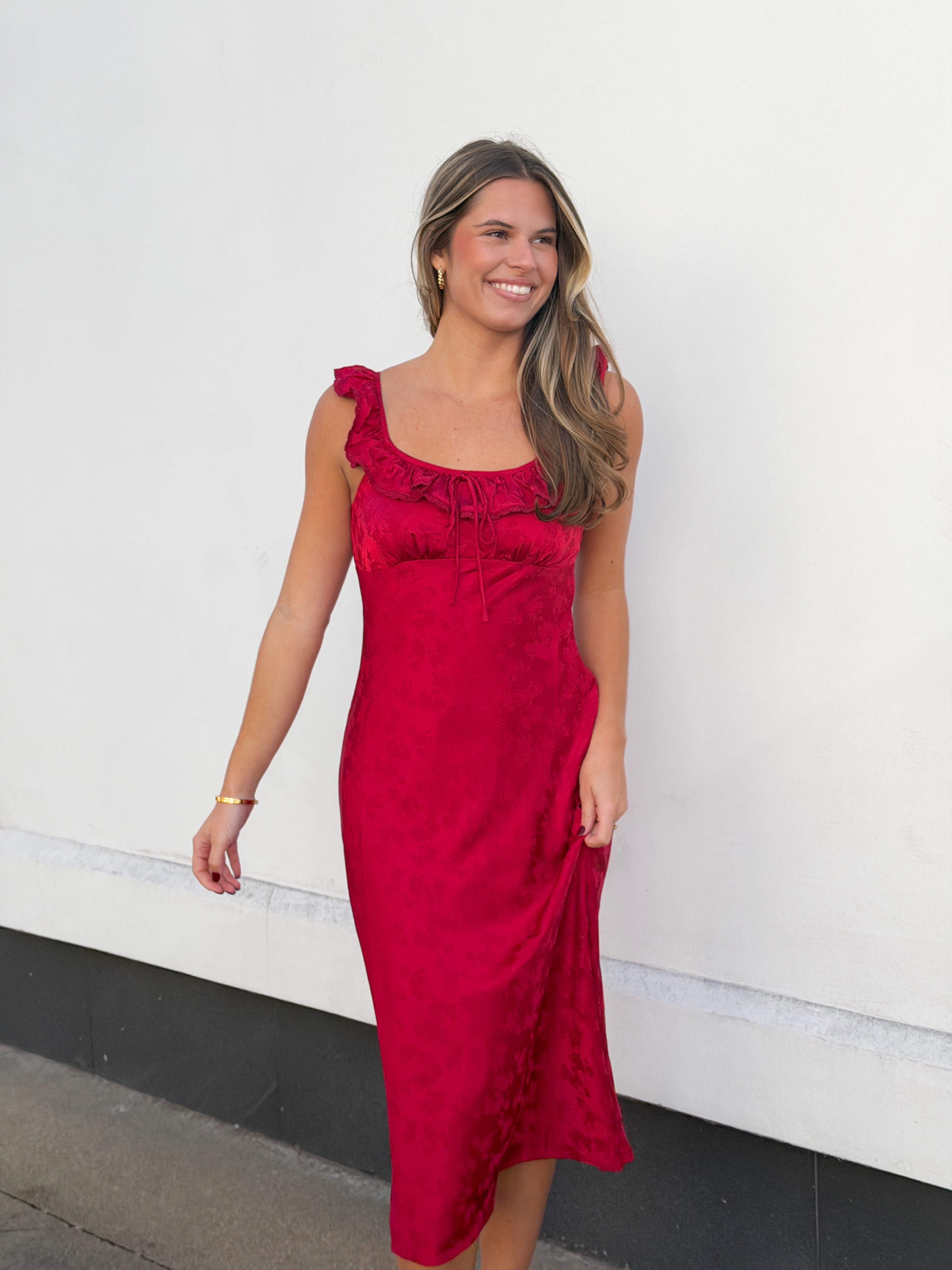 Bring a splash of charm with the Ruby Ruffle Dress. This sleeveless midi dress features a flirty square neckline and delicate lace trim that adds a touch of whimsy. The playful ruffles dance with every step, making it perfect for sunny days and festive nights. In a vibrant ruby red, this dress effortlessly combines elegance and fun for your standout moments.