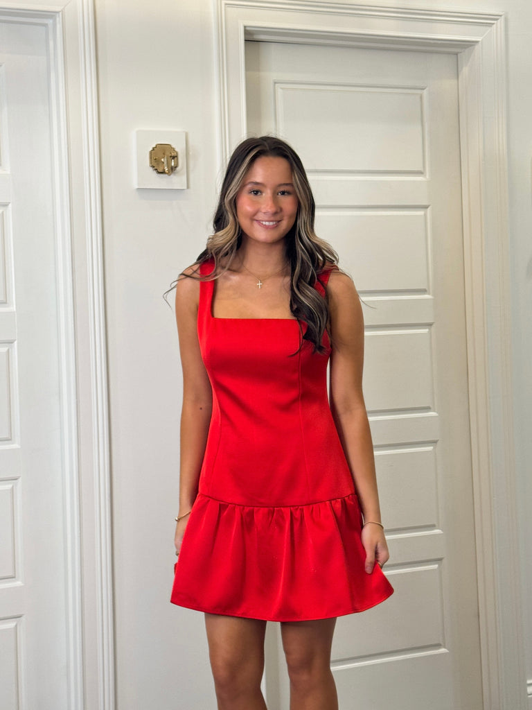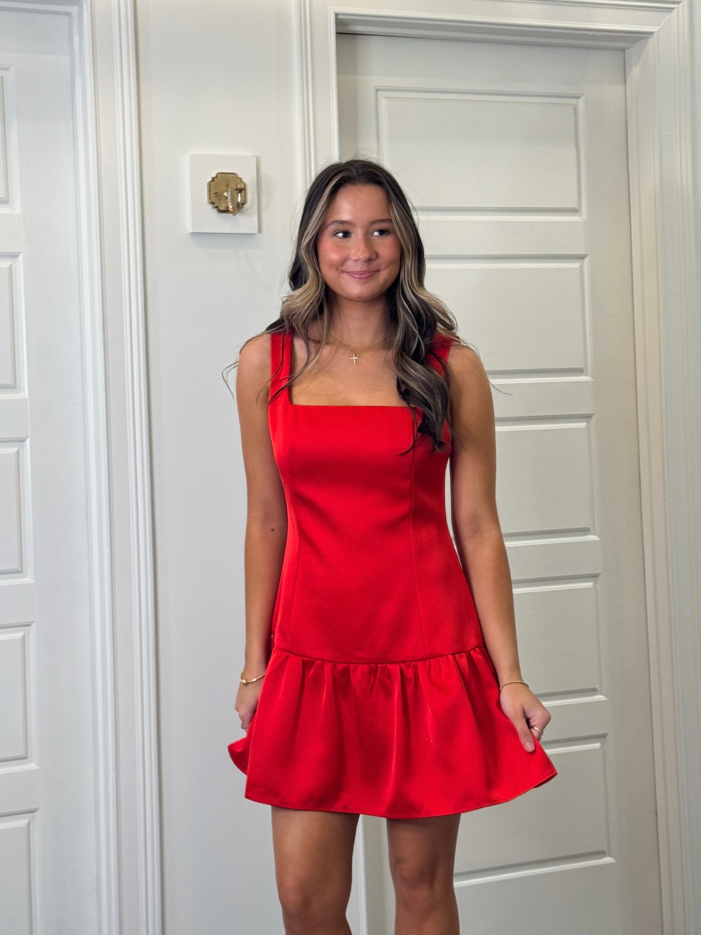 The Sleigh Bell Satin Dress shines in vibrant red with silky satin-like fabric that catches the light beautifully. Its short length and playful tank top straps make it perfect for dancing the night away or turning heads at any party. Feel confident and flirty in a dress that combines comfort with a touch of glamour.