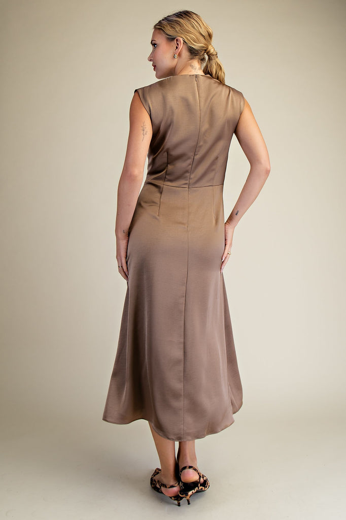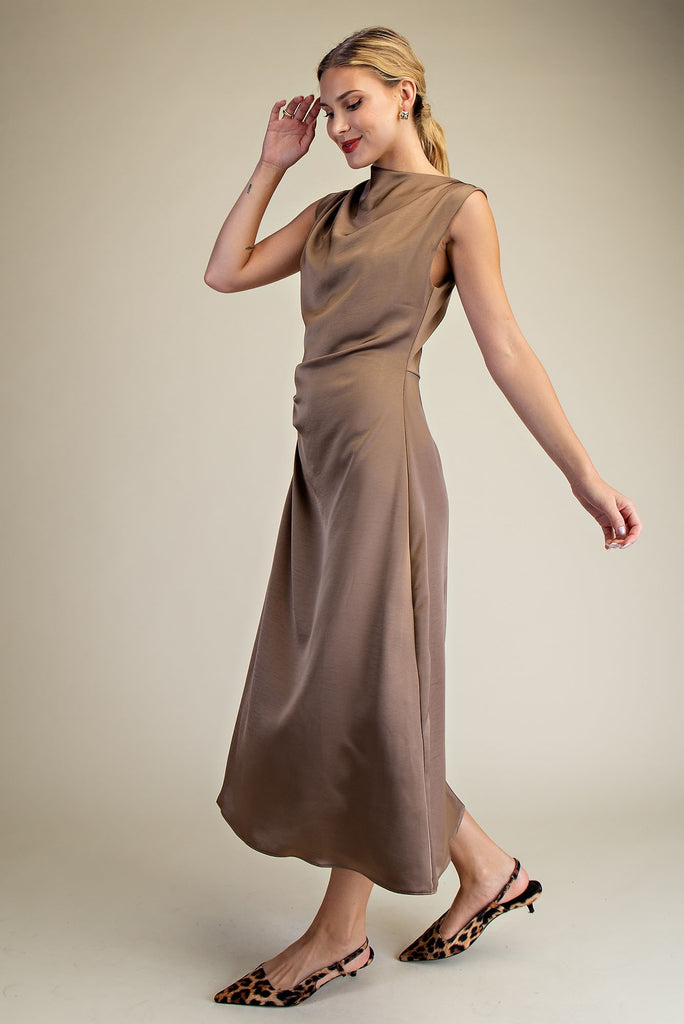 Slip into the Manhattan Midi Dress, where silky satin vibes meet a playful midi length. This sleeveless brown beauty glides with every step, perfect for dancing through your day or sparkling at night. Effortless elegance with a touch of fun!