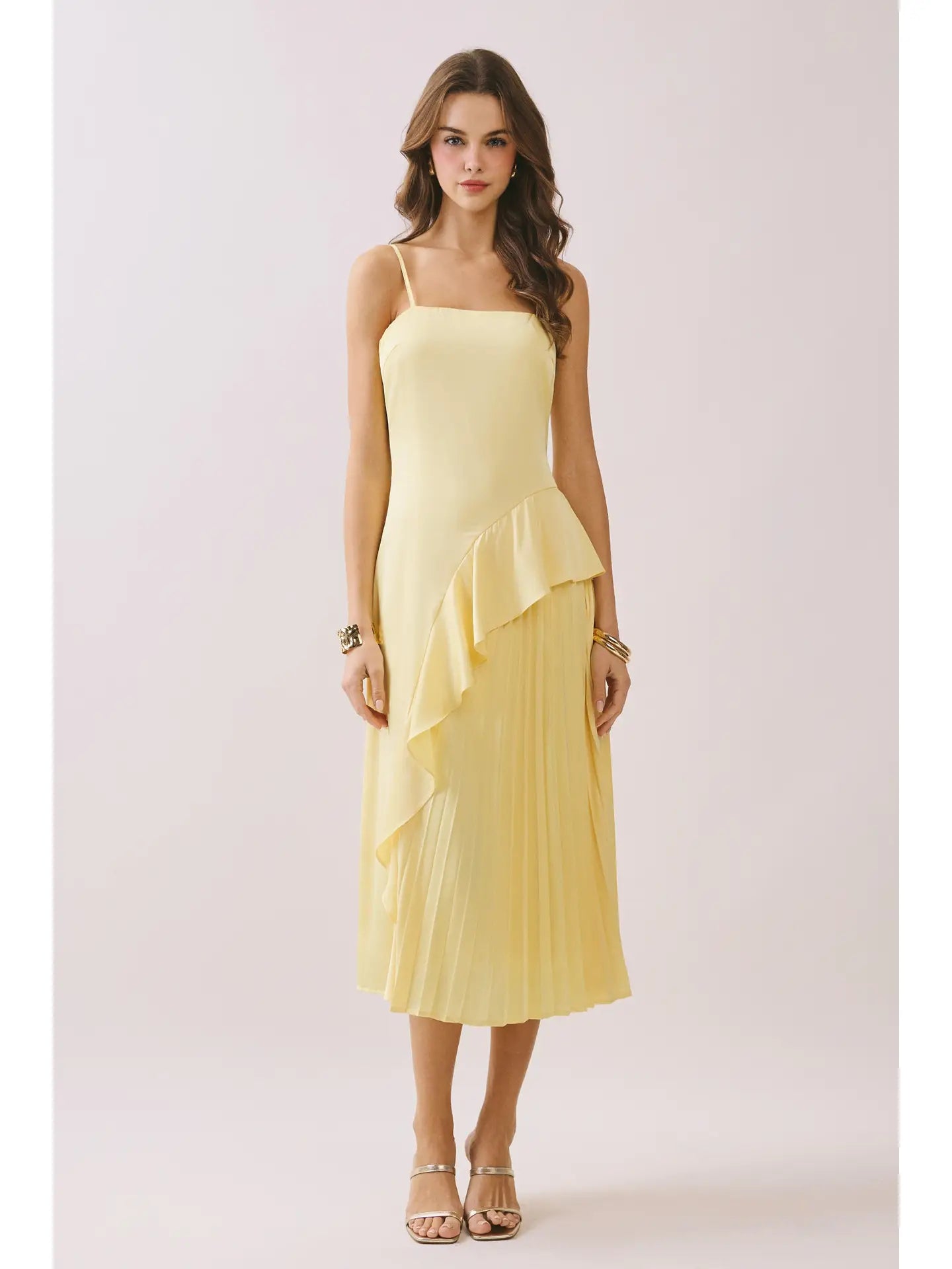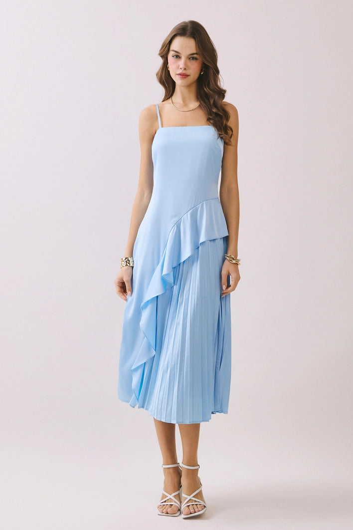 Effortless elegance meets whimsical charm in this light blue or yellow square-neck dress. Cascading asymmetric ruffles dance down the silhouette, creating movement and dimension with every step. The flattering neckline frames your shoulders beautifully while the flowing design ensures comfort all day long. Perfect for brunch dates, garden parties, or any occasion calling for a touch of playful sophistication. Dress it up with heels or keep it casual with sneakers—this versatile piece adapts to your mood.