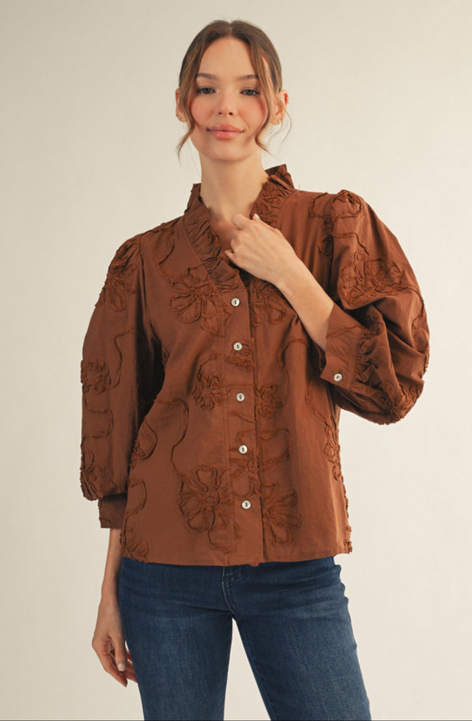 Elevate your wardrobe with the Flowers & Everything Top—a crisp white or brown button-up featuring delicate white floral accents and a subtle V-neck for a touch of charm. Its long sleeves make it perfect for layering or wearing solo, adding a fresh, playful vibe to any outfit.