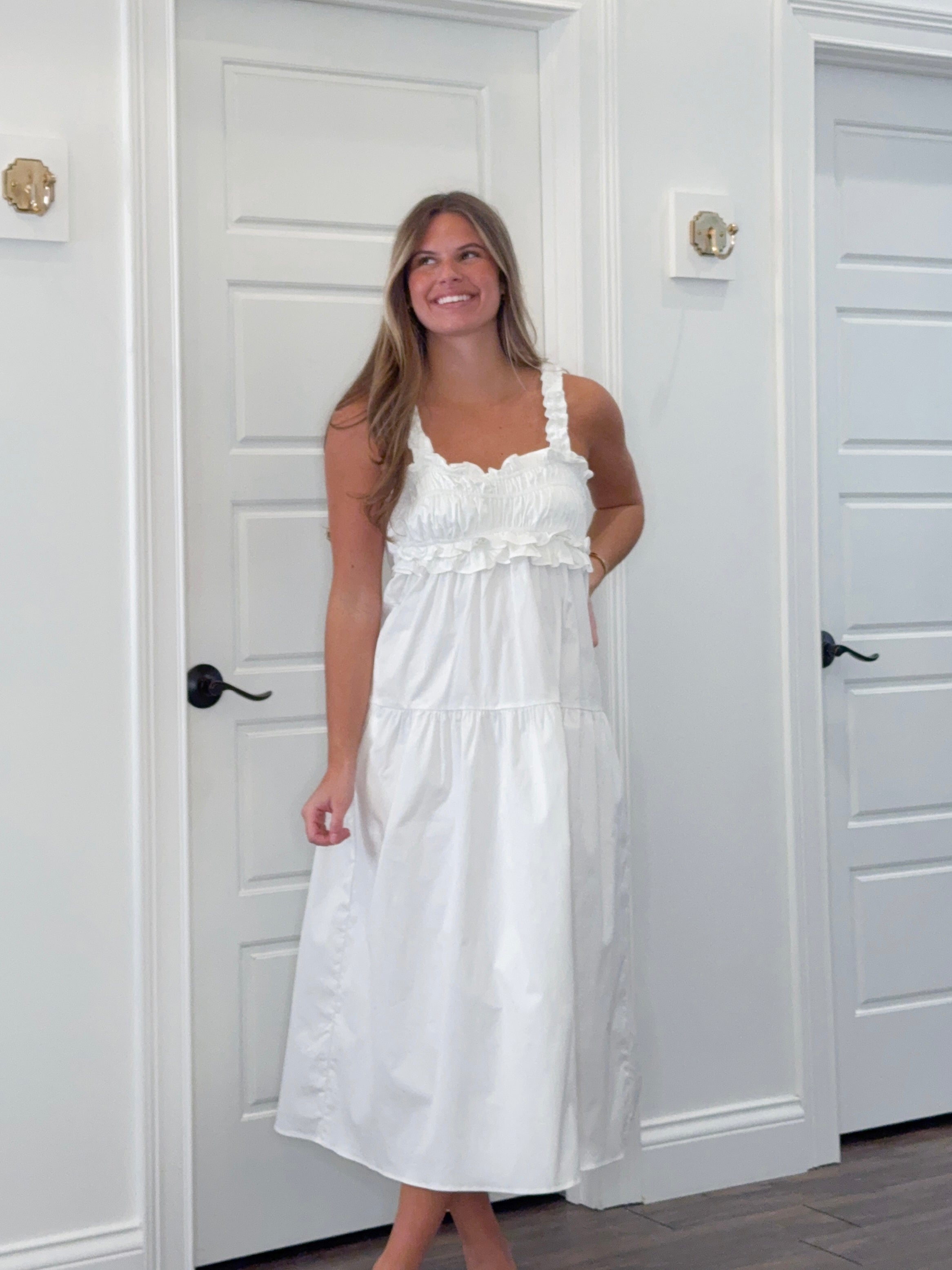 The Dreamy Days Dress is your ticket to effortless elegance with a touch of whimsy. This stunning white tank dress features delicate frilly sleeves that flutter with every move, creating a romantic silhouette perfect for garden parties, brunch dates, or any occasion calling for a little magic. The charming bows adorning the back add an unexpected playful detail that'll have everyone asking where you found such a dreamy piece. Slip it on and let your inner princess shine—because life's too short for boring dresses.