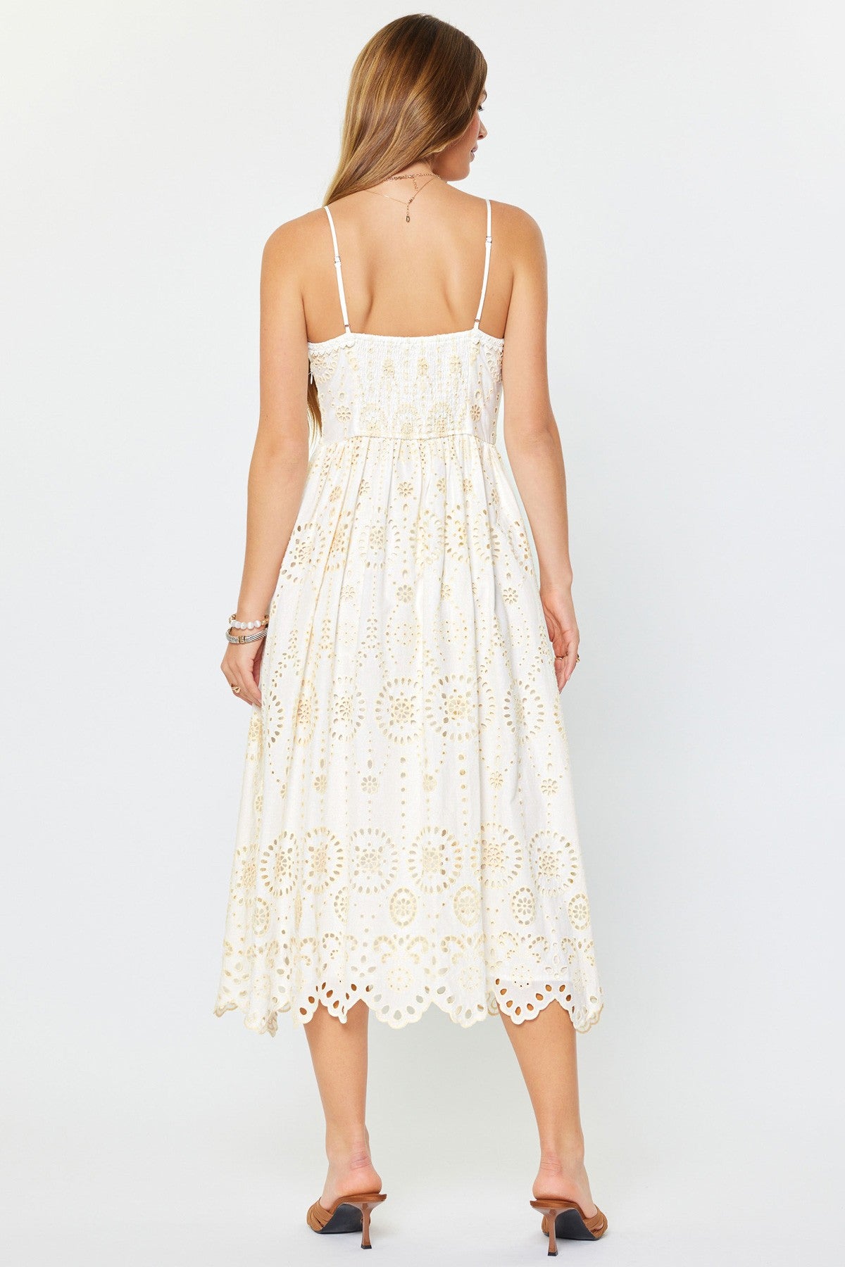 Bask in effortless elegance with this charming cami midi dress, where delicate eyelet embroidery meets timeless appeal. The square neckline frames your shoulders beautifully, while the soft white and cream palette keeps things fresh and versatile. Perfect for brunch dates, garden parties, or those days when you want to feel put-together without trying too hard. Slip it on and let the intricate details do the talking—this dress is your new go-to for looking polished and playful all season long.