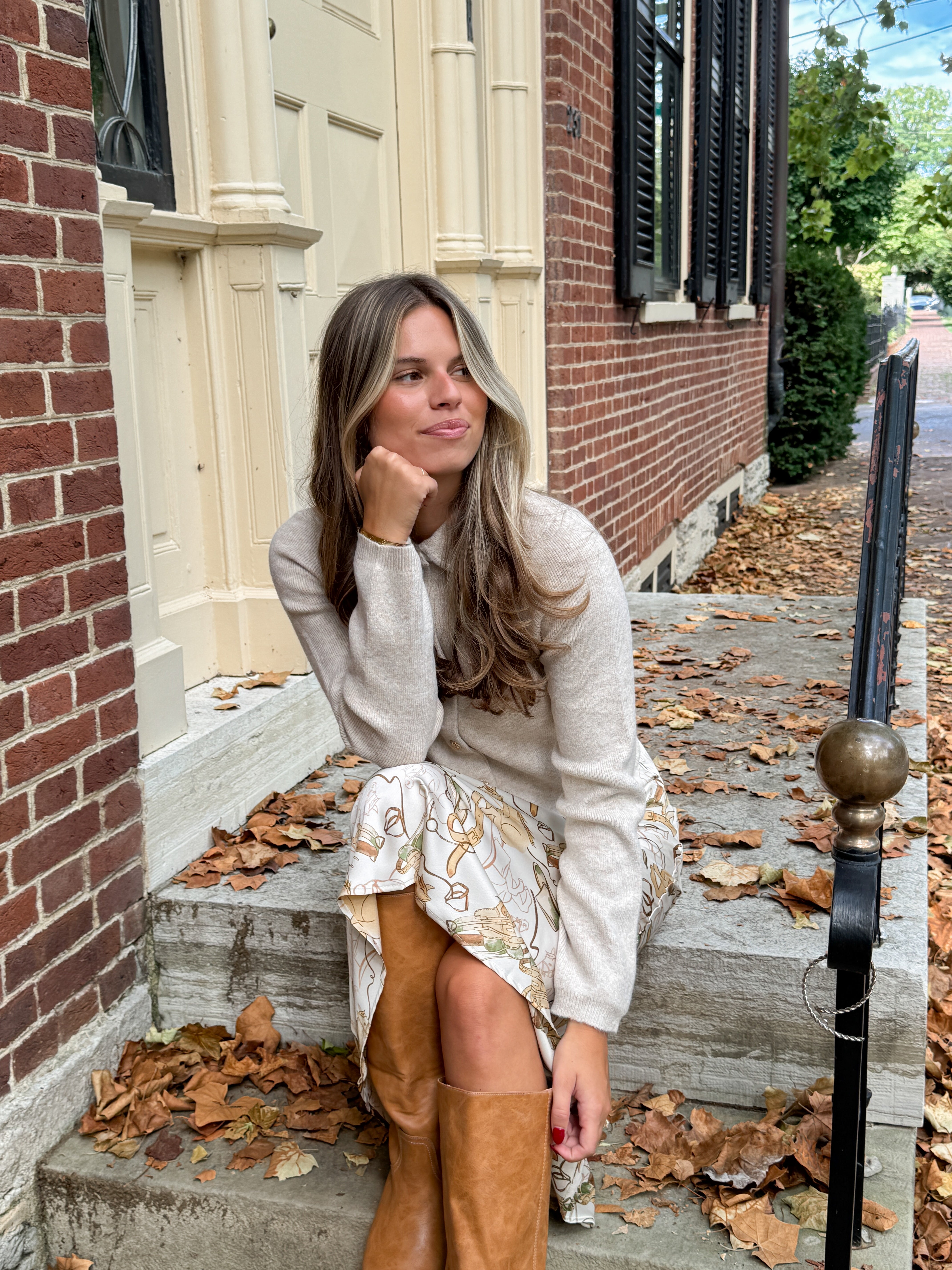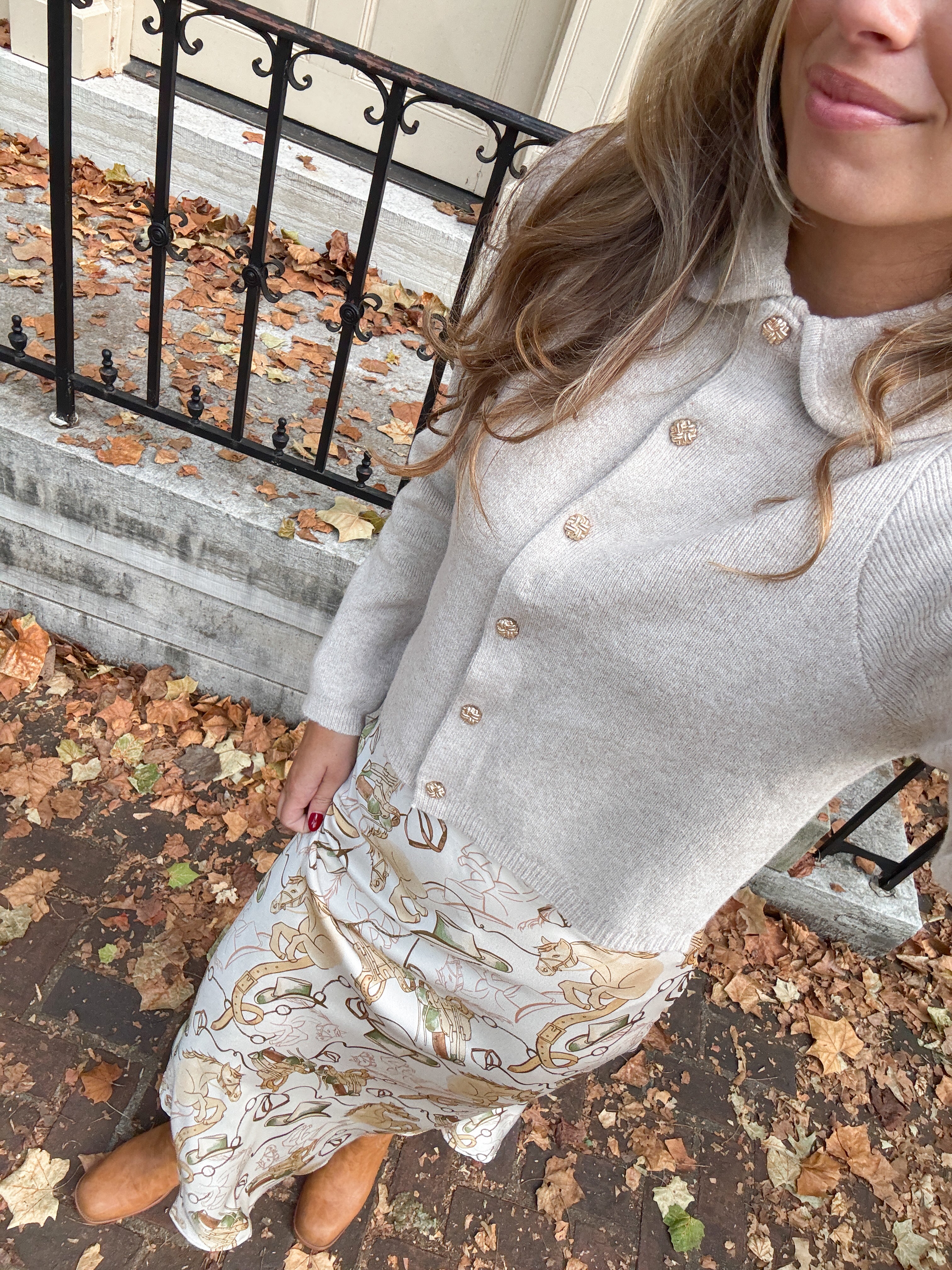 Add a touch of whimsy to your wardrobe with The Peter Pan Detail Cardigan. This light taupe cardigan features a charming Peter Pan collar and shiny gold buttons that brighten up any outfit. Perfect for layering, it brings both comfort and a playful vintage vibe to your everyday look.