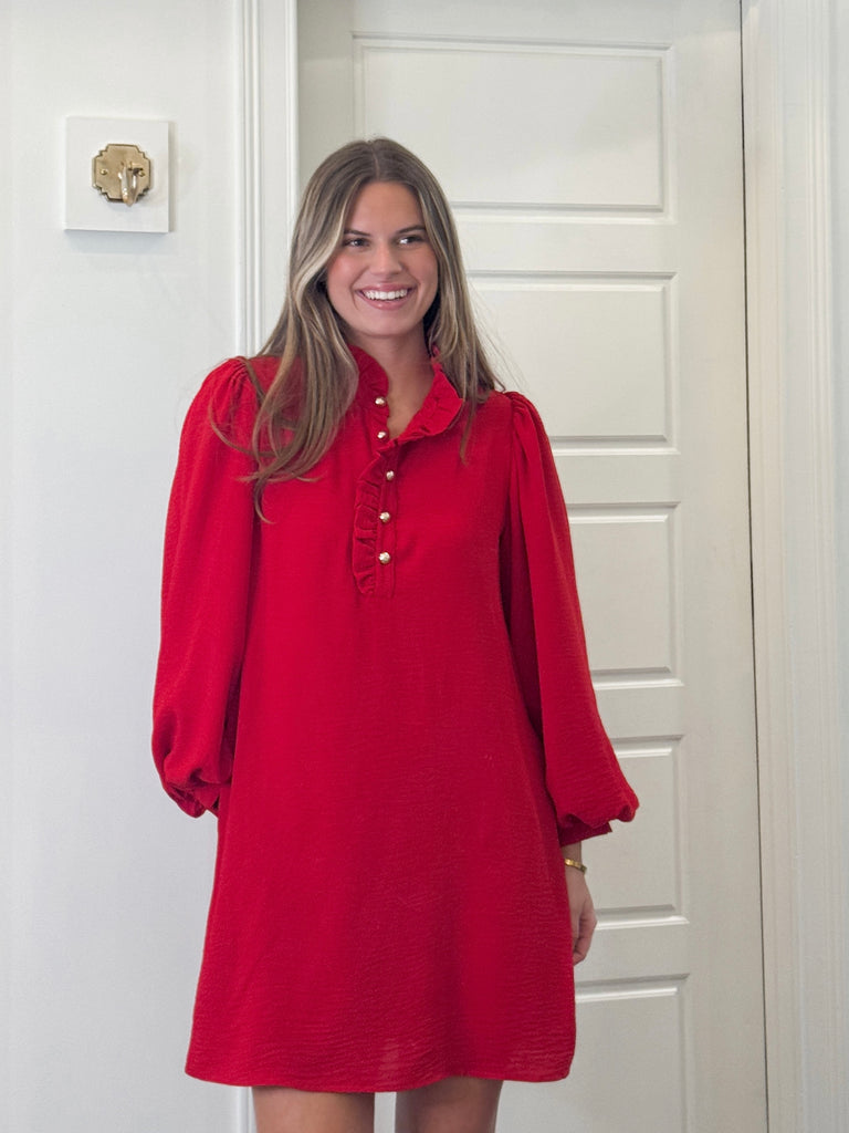 Deck yourself out in festive style with this charming red dress! Featuring long sleeves and a flattering short cut, it's perfect for holiday parties and seasonal celebrations. Gold button accents add a touch of elegance and sparkle to this playful piece. Whether you're trimming the tree or dancing the night away, this dress brings warmth and cheer to any occasion.