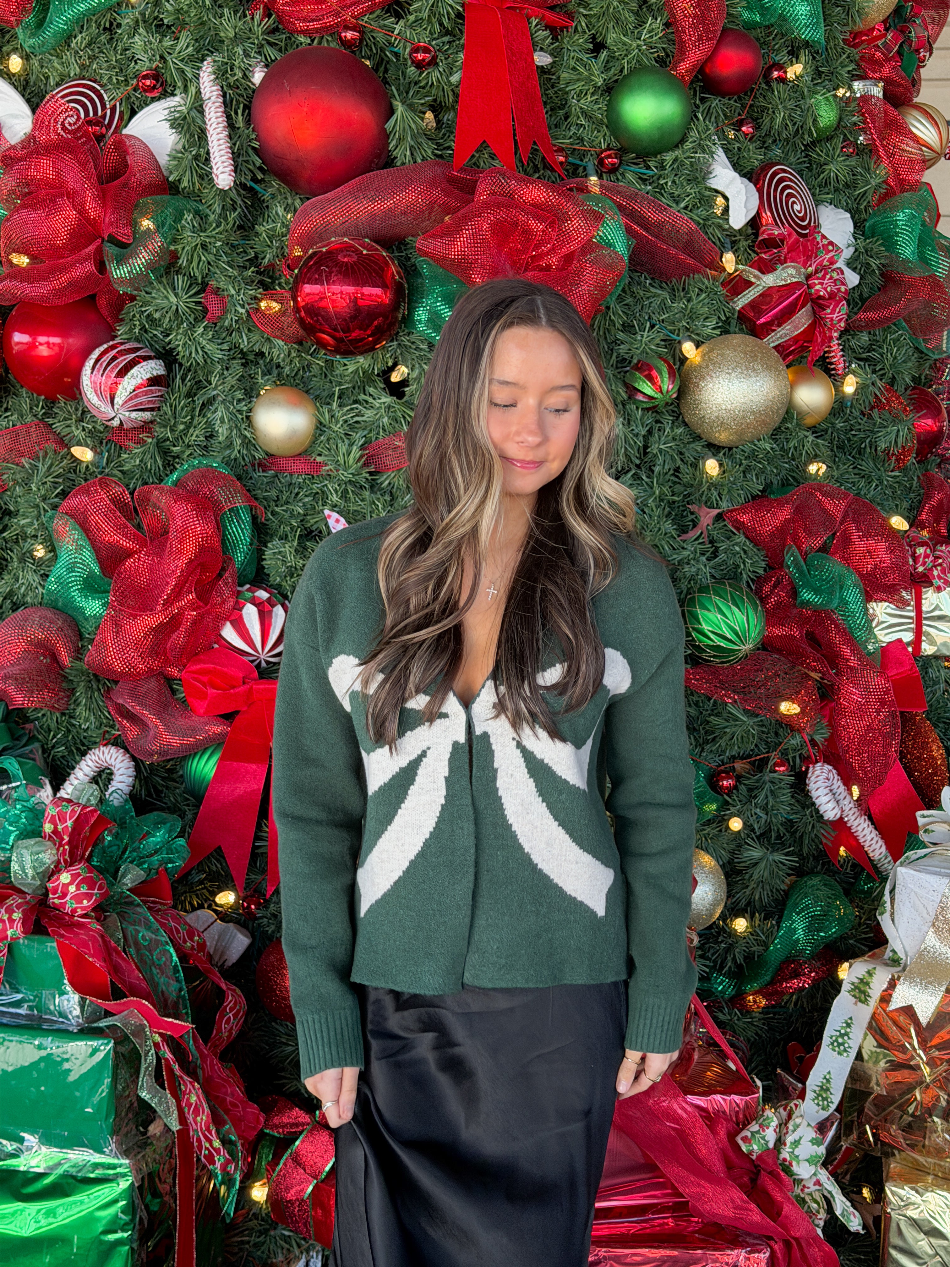 Wrap yourself in cozy charm with this Winter Evergreen Bow Sweater! Featuring a rich dark green knit that's perfect for the season, this playful piece showcases an adorable white bow detail on the front that adds instant personality to your winter wardrobe. Whether you're heading to holiday gatherings or keeping it casual, this sweater brings festive flair with comfortable, everyday wearability. A delightful way to spread seasonal cheer!