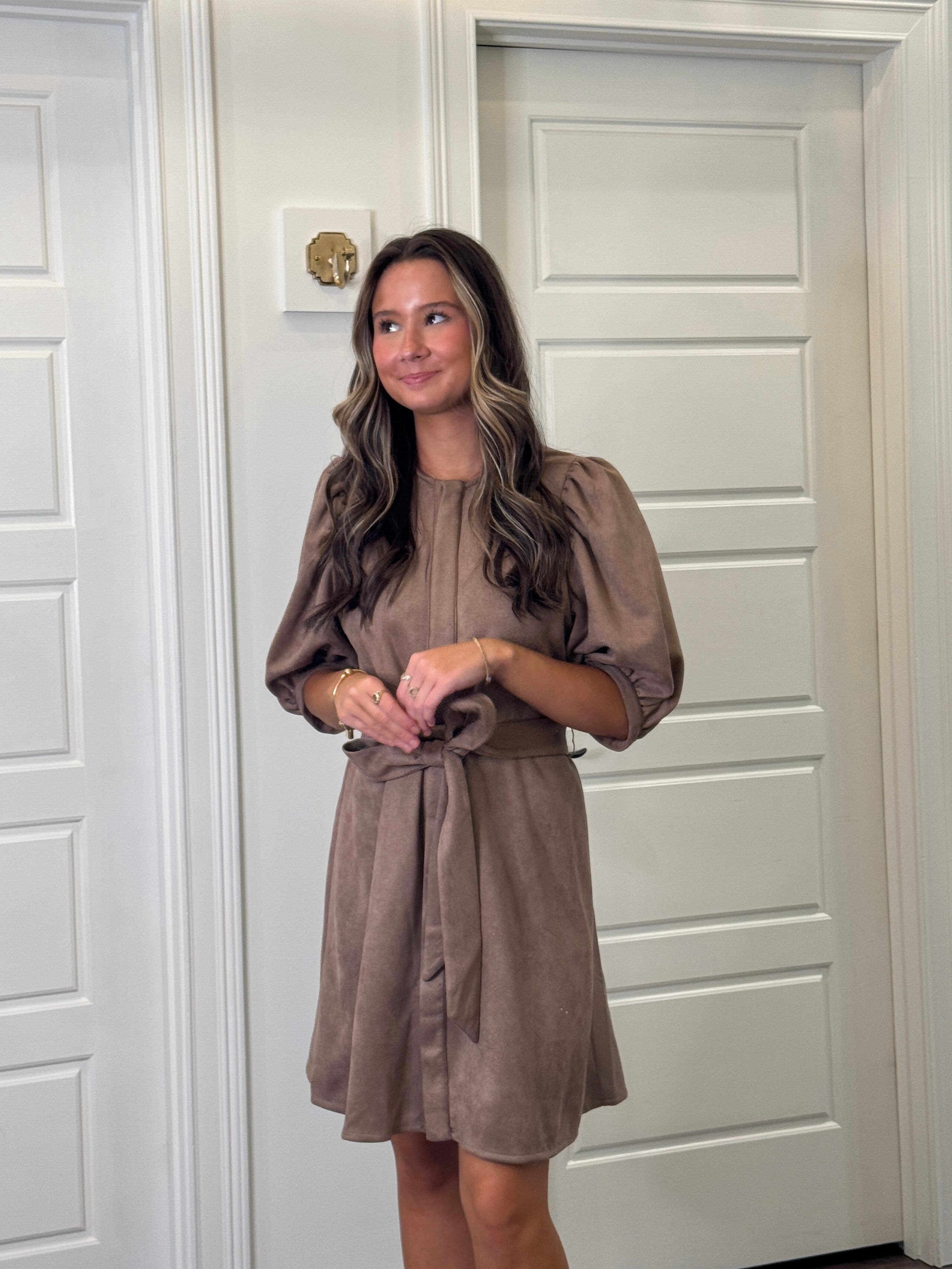 Step into cozy charm with the Fall In Kentucky Dress. Made from soft taupe suede, this short sleeve dress features a flattering belt that cinches your waist, highlighting your silhouette. Its short length keeps things flirty and fun—perfect for crisp autumn days or layering as the season cools. Easy to wear and effortlessly stylish, this dress will have you falling for fall all over again.