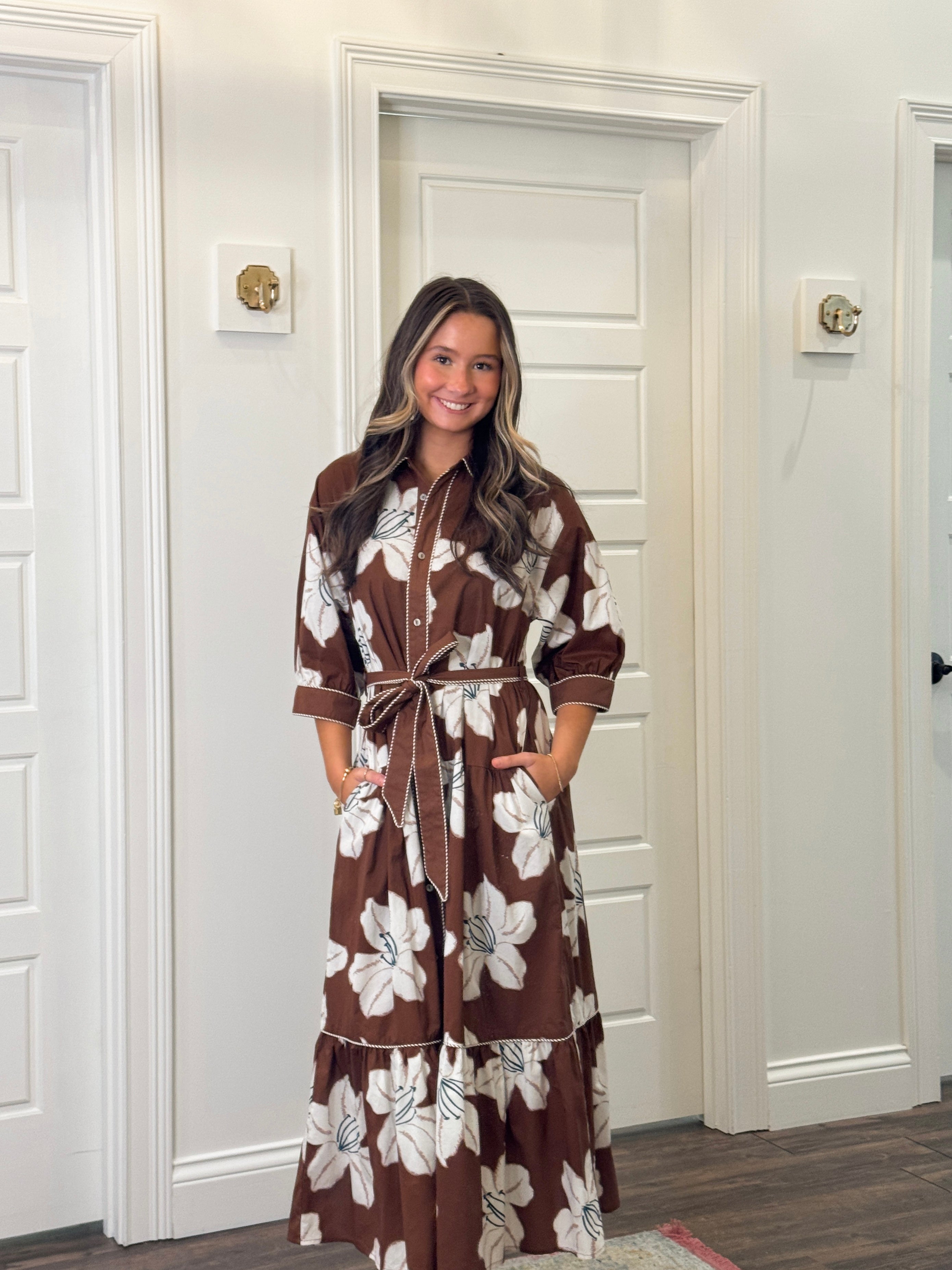 The Maple Blooms Maxi Dress brings a playful twist to your wardrobe with its warm brown fabric adorned by delicate cream flowers. Featuring charming short sleeves, a flattering tie belt to cinch your waist, and button details down the front, this dress combines comfort and style effortlessly. Perfect for sunny days or casual outings, it adds a touch of whimsical elegance to any look.