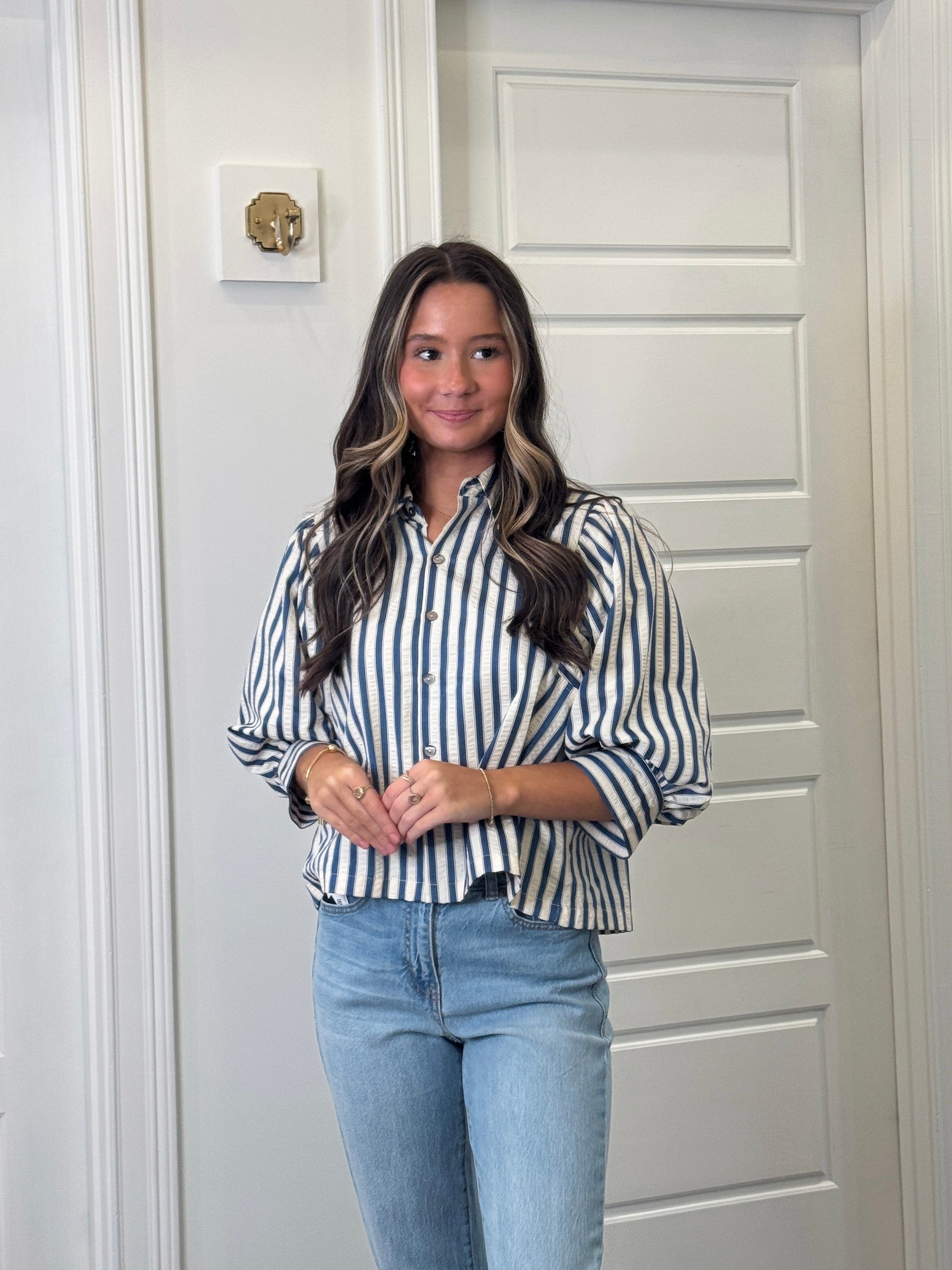 Discover the charm of the Simple Sail Top, a cream blouse with delightful blue stripes and button-up long sleeves. Its breezy design pairs perfectly with your favorite jeans or skirts, adding a splash of playful elegance to any outfit. Embrace a fresh, stylish vibe that’s as easygoing as a seaside stroll.