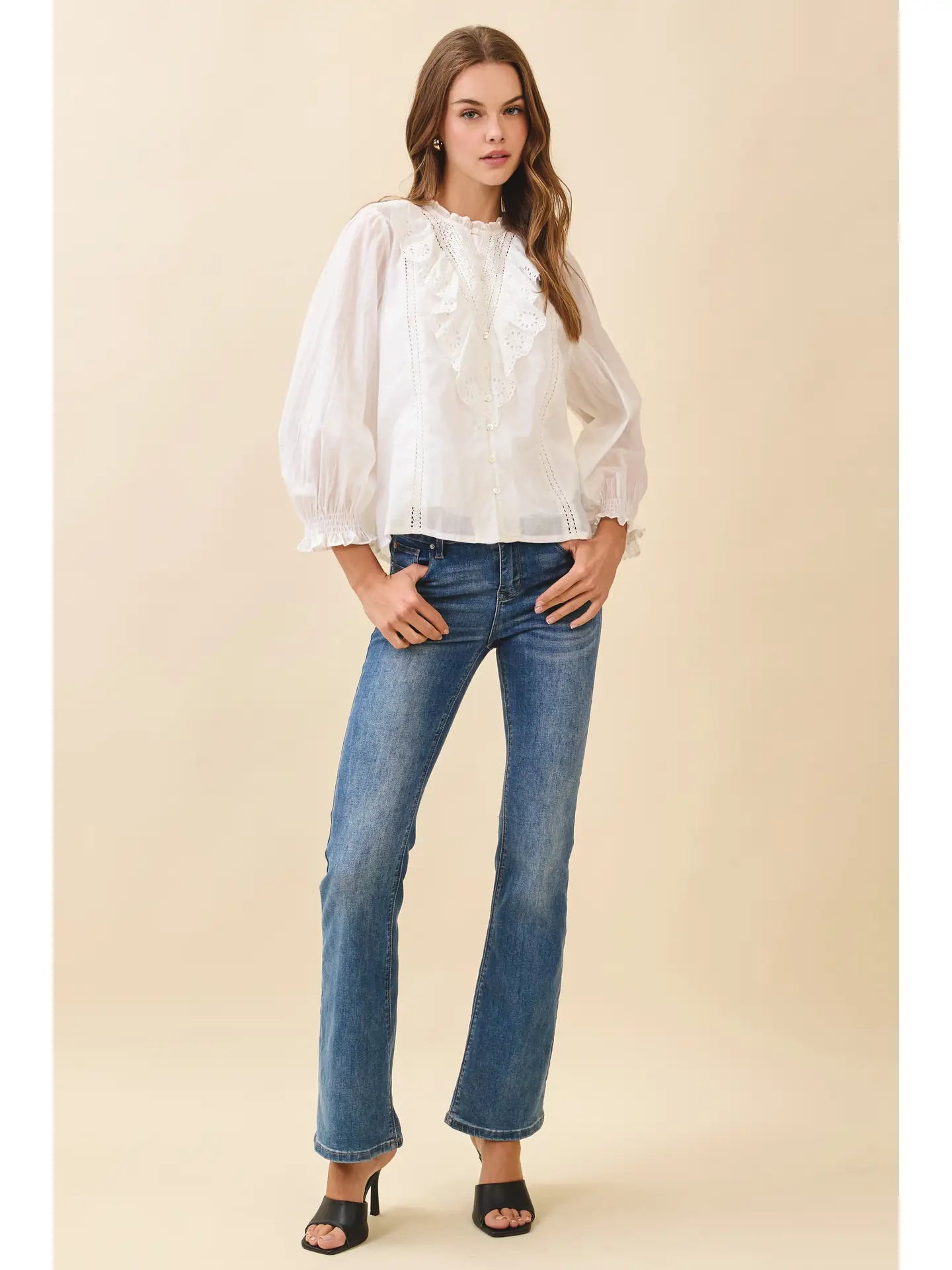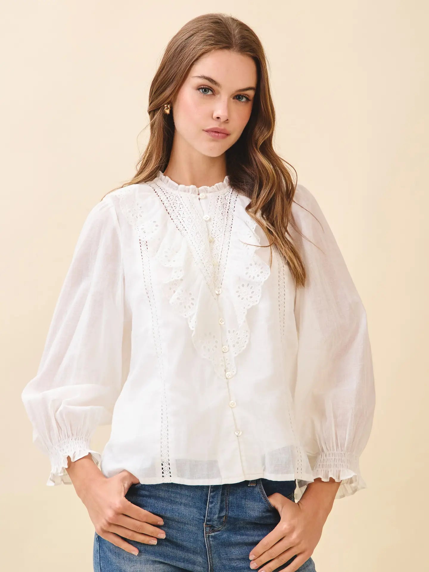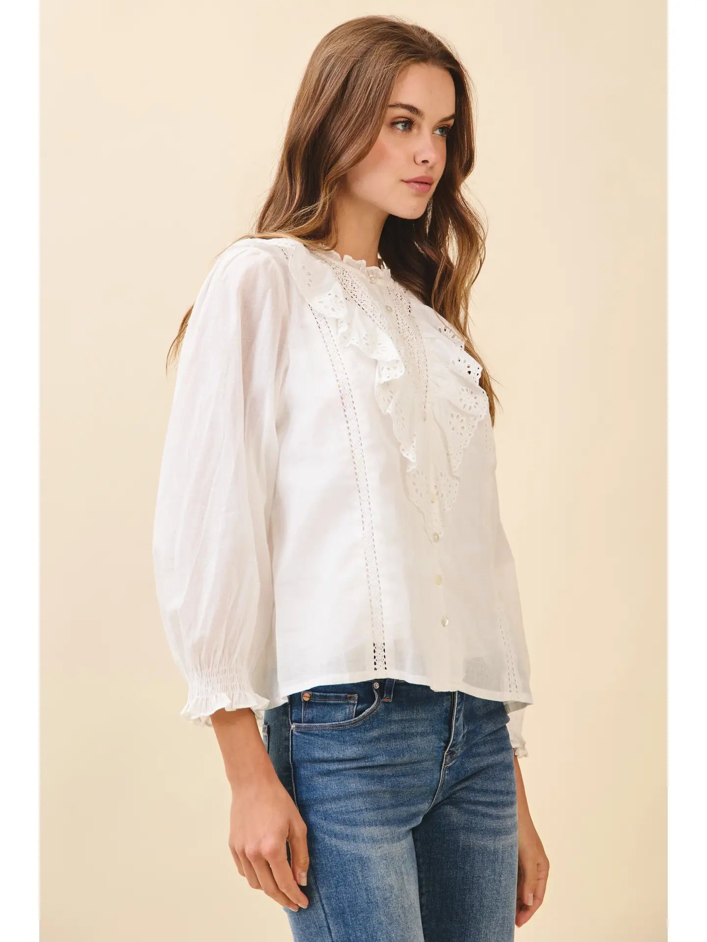 Embrace your delicate side with this charming button-down top, featuring intricate eyelet embroidery and romantic ruffle lace trim. The soft, breathable fabric in crisp white and ivory tones makes it perfect for layering or wearing solo. Whether you're dressing up for brunch or keeping it casual, this versatile piece adds an effortless touch of elegance to any outfit. A timeless wardrobe essential that feels as good as it looks.