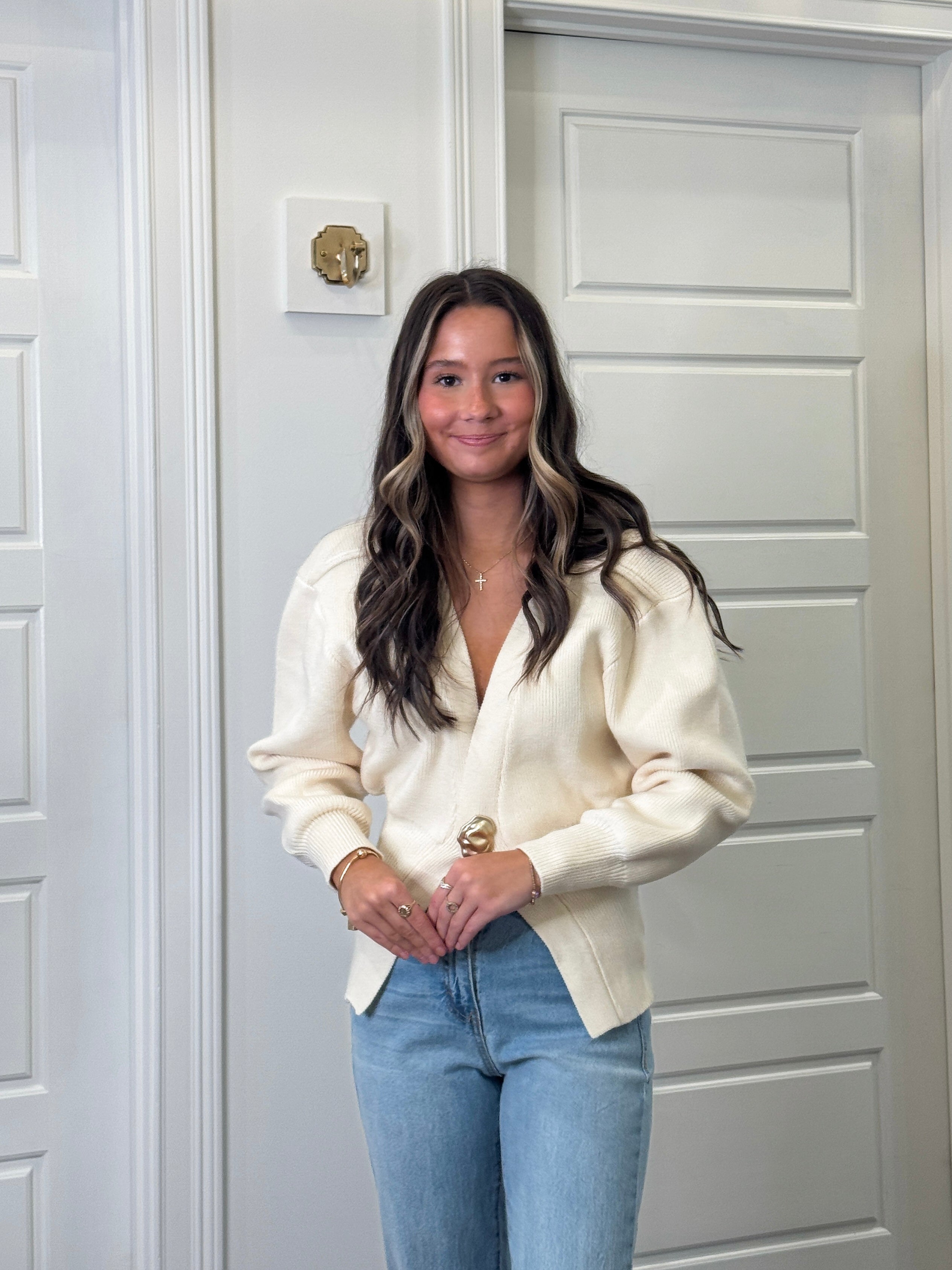 Cozy meets chic in The Cream Luxe Cardigan, perfectly stitched at the waist to highlight your silhouette. The golden button adds a touch of sparkle, making it your new favorite go-to for layering with a playful twist. Whether over jeans or your favorite dress, this cardigan keeps it light, luxe, and effortlessly stylish.