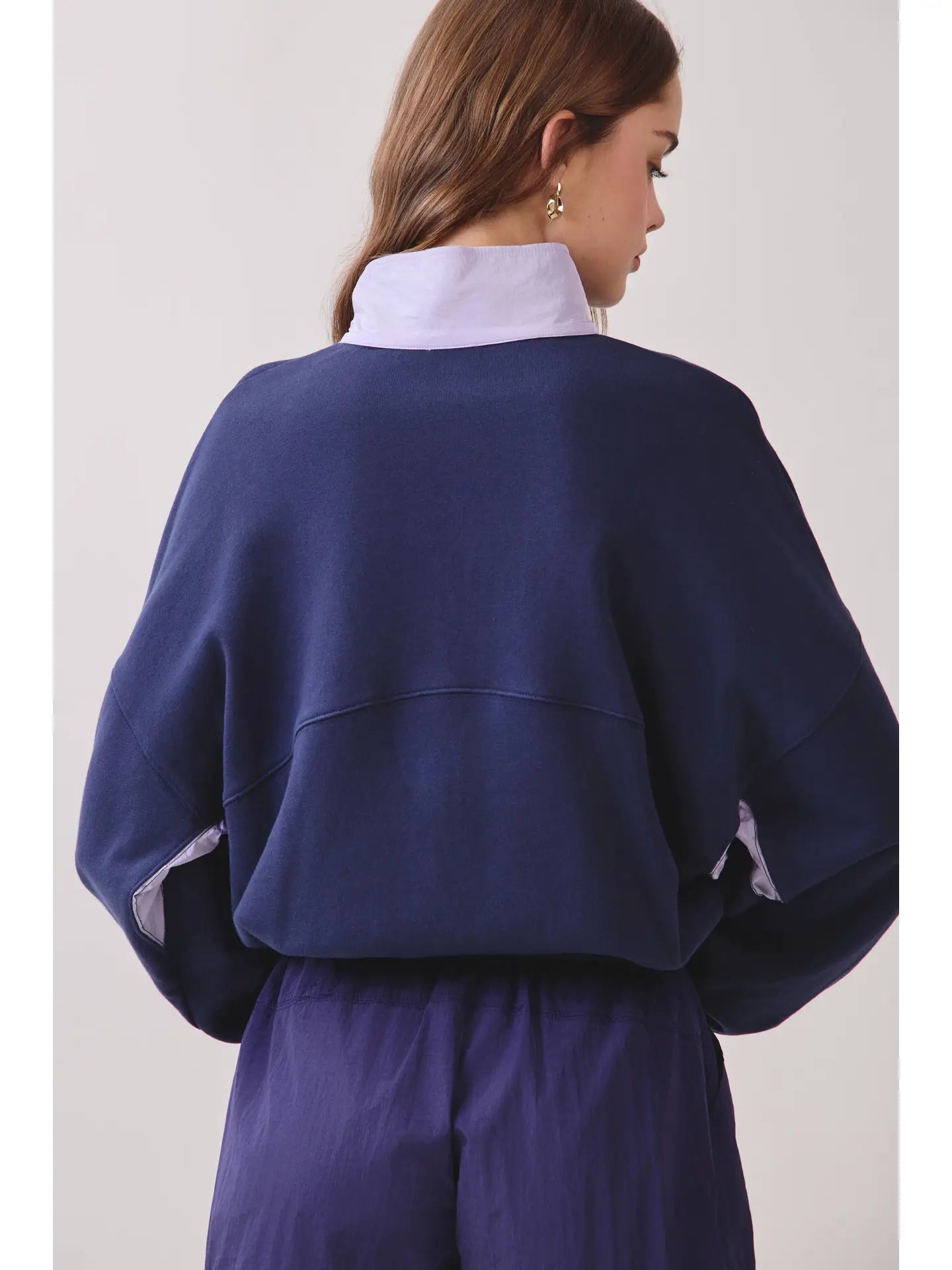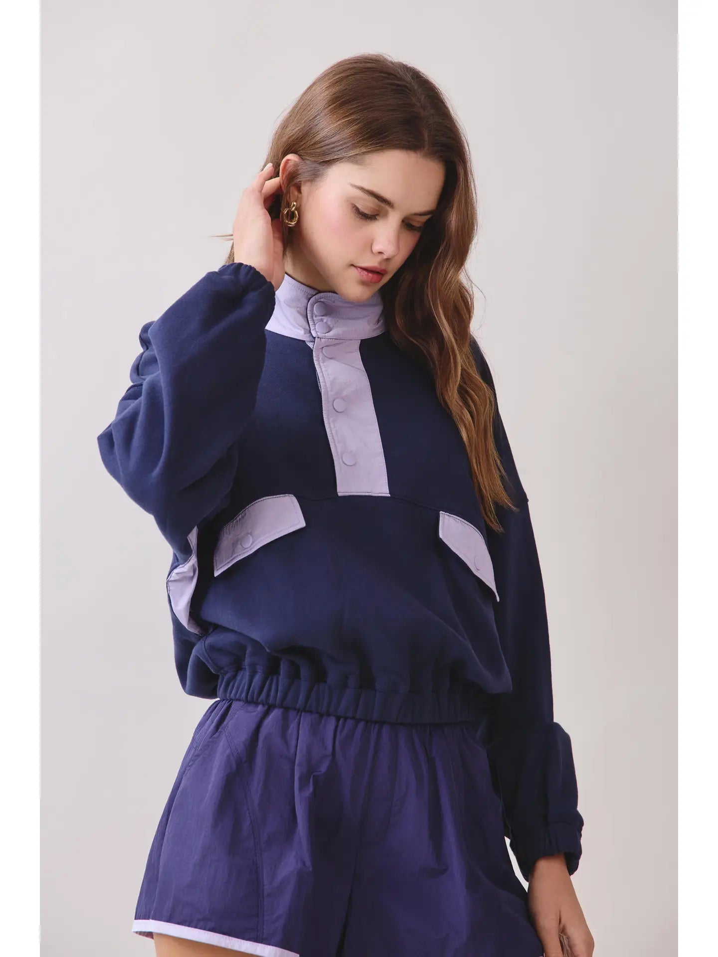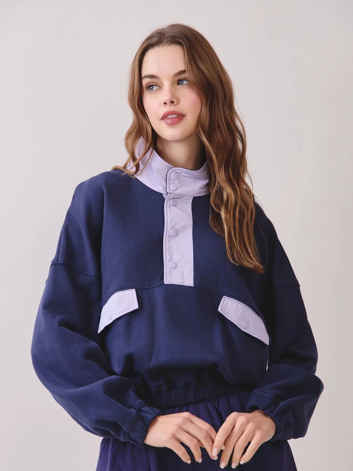 Make a statement with the Twilight Block Pullover, where bold purple and navy colorblocking creates instant visual pop. The cozy mock neck and lightweight poplin construction strike the perfect balance between fun and refined—dress it up with tailored trousers or keep it casual with your favorite jeans. This two-tone wonder is ready for whatever your day throws at you, bringing playful personality to every outfit.