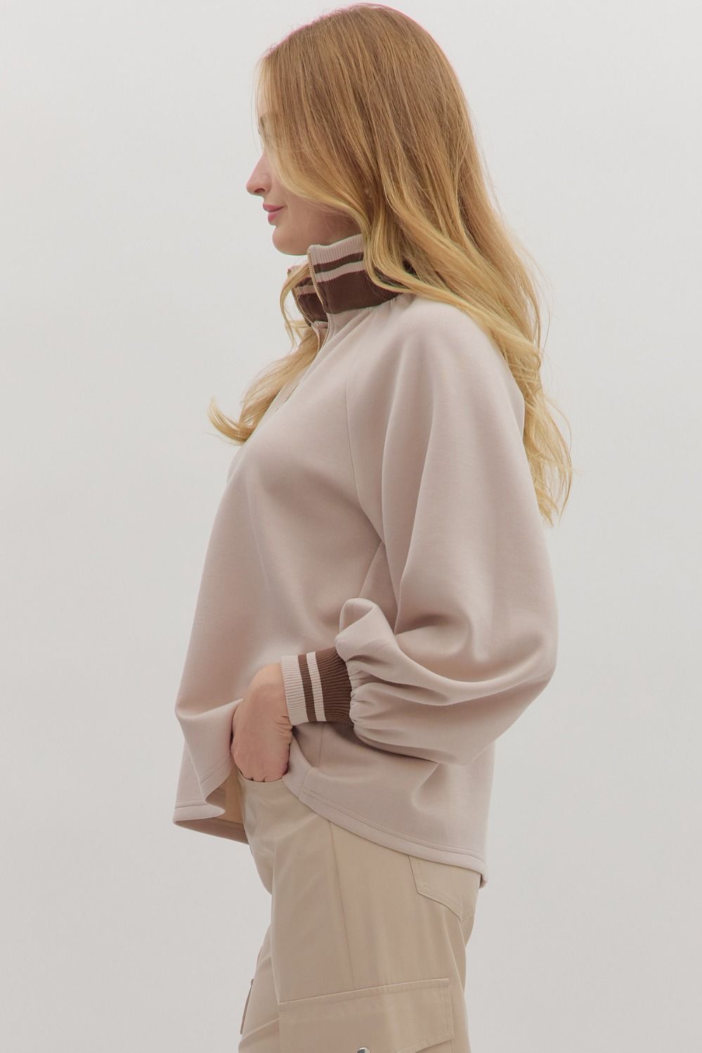 Cozy up in the Warm Harvest Zip-Up, featuring a soft beige hue perfect for crisp fall days. The playful touches of brown detailing on the collar and sleeve cuffs add a charming contrast that keeps your look fresh. With its comfy quarter-zip design, this zip-up is ready to be your go-to layering piece for every adventure this season.