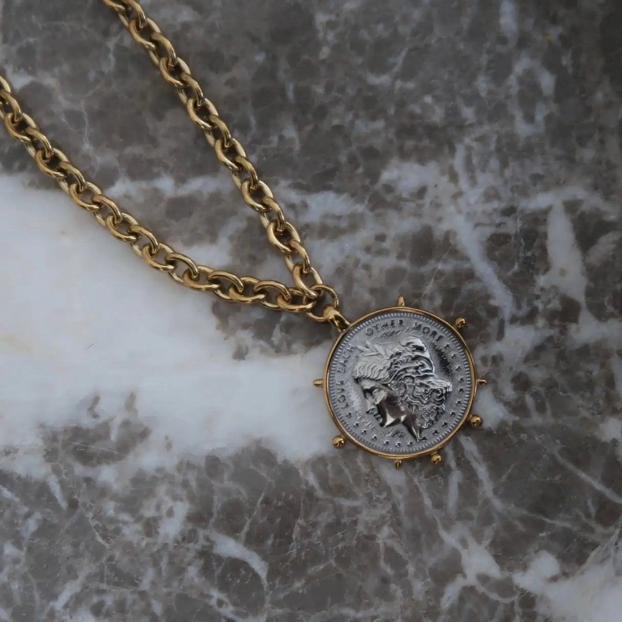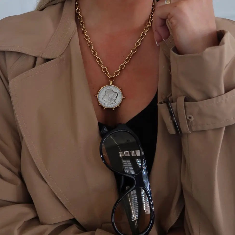 Two Toned Coin Necklace is backordered and will ship as soon as it is back in stock.