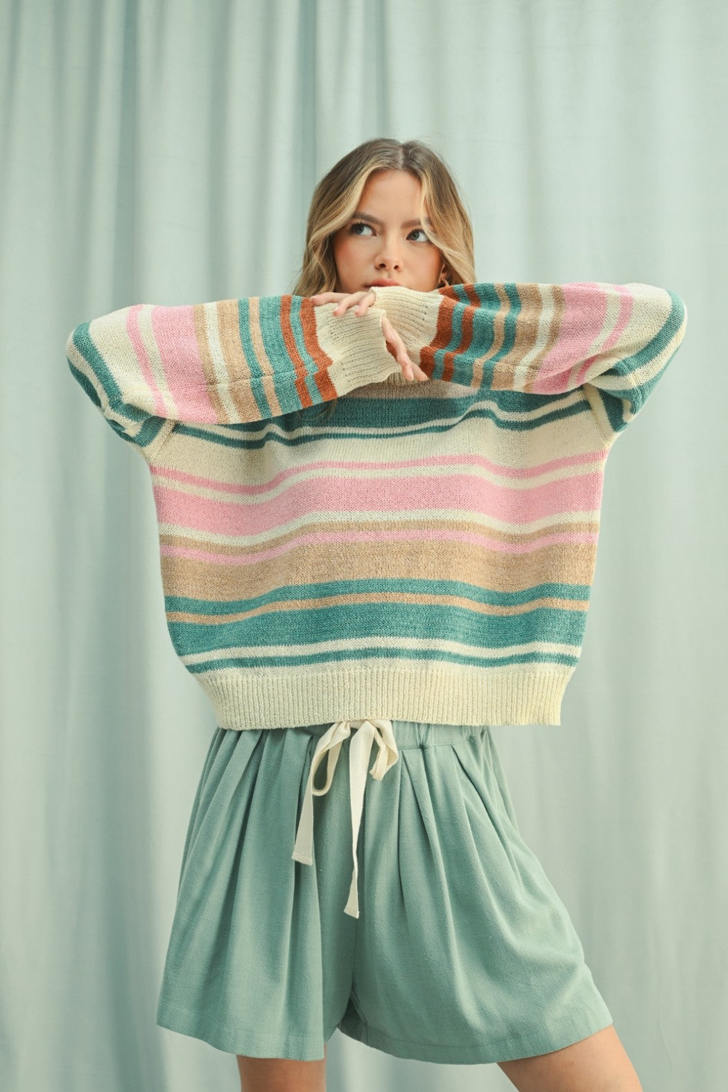 Wrap yourself in sweet comfort with the Cozy Confection Sweater, featuring charming stripes of teal, pink, and brown. This cream-colored knit adds a playful pop of color to your cozy days, perfect for lounging or layering on chilly afternoons. Embrace warmth and whimsy in one delightful sweater!