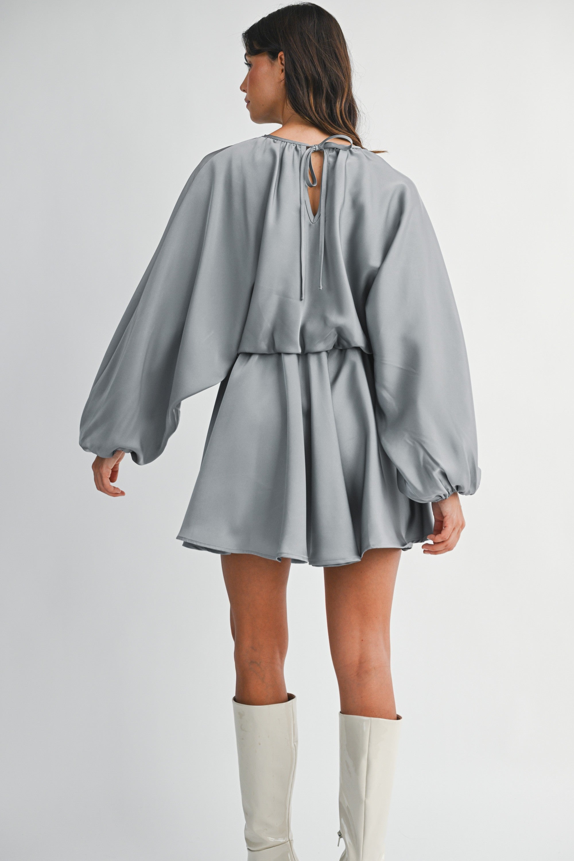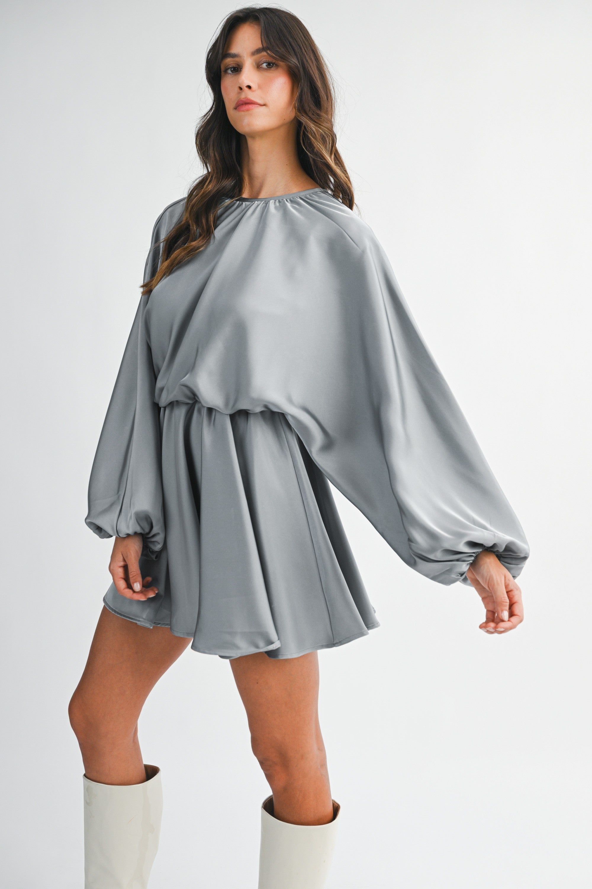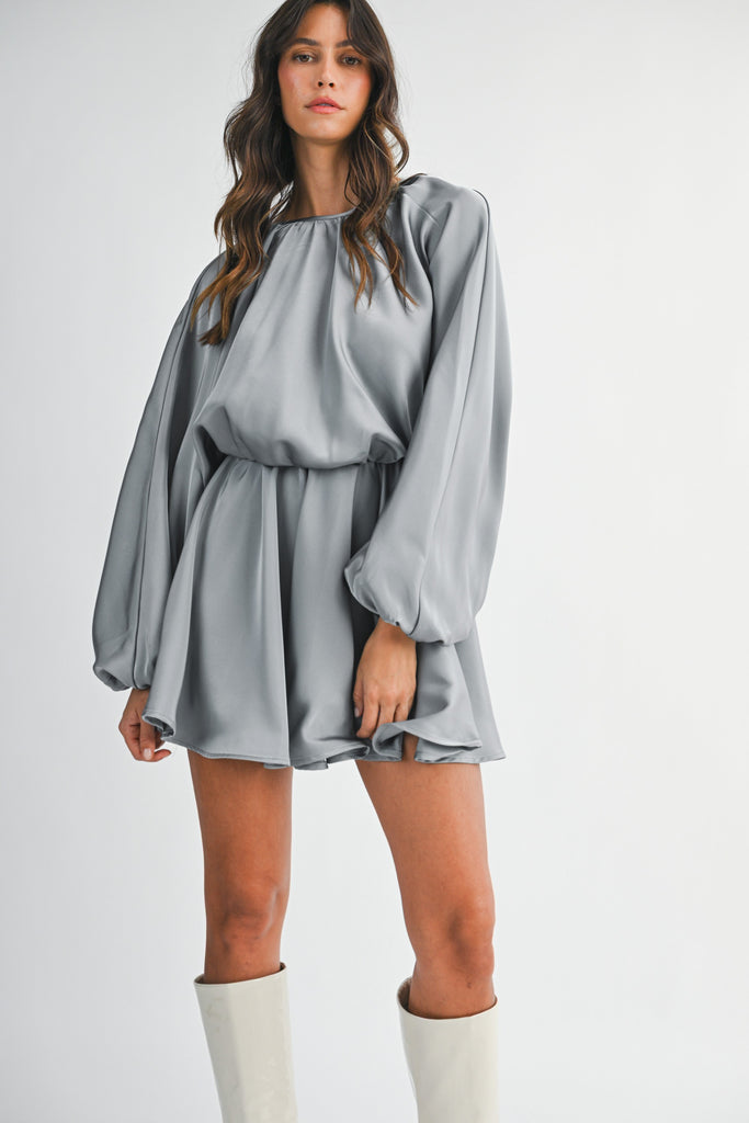 Step into the spotlight with the Eclipse Short Dress in a dreamy dusty blue hue. Crafted from a satin-like material, its soft shimmer adds a touch of elegance, while the playful puff long sleeves bring flirty volume to your look. Perfect for twirling into memorable nights, this dress combines comfort and charm effortlessly.