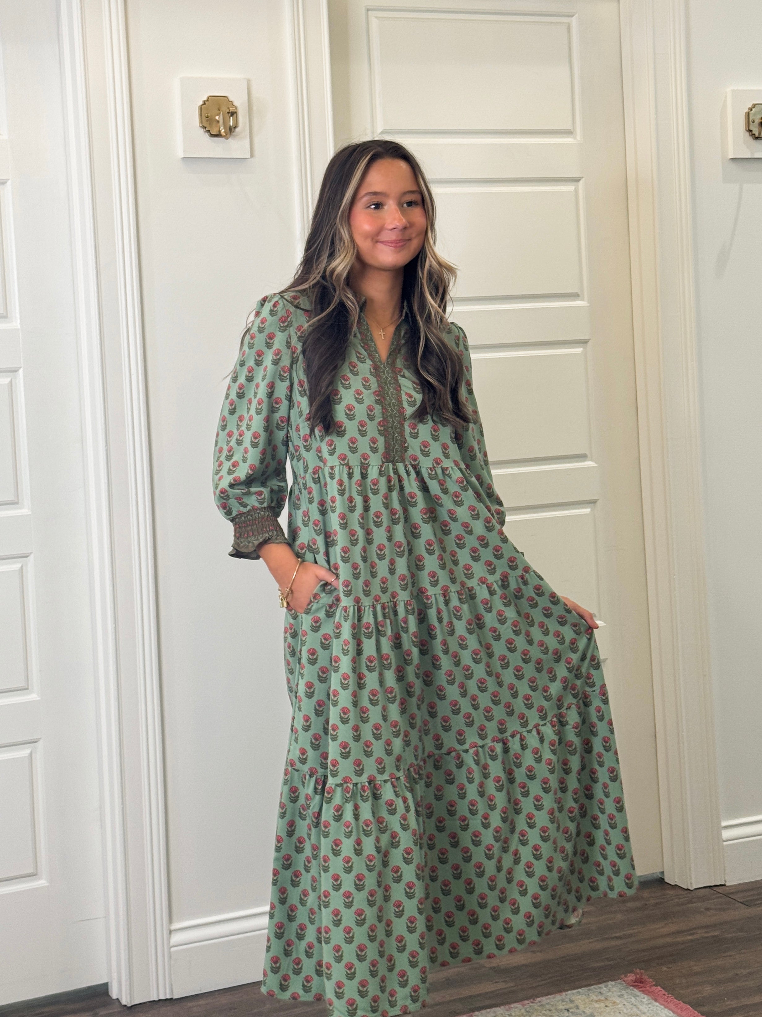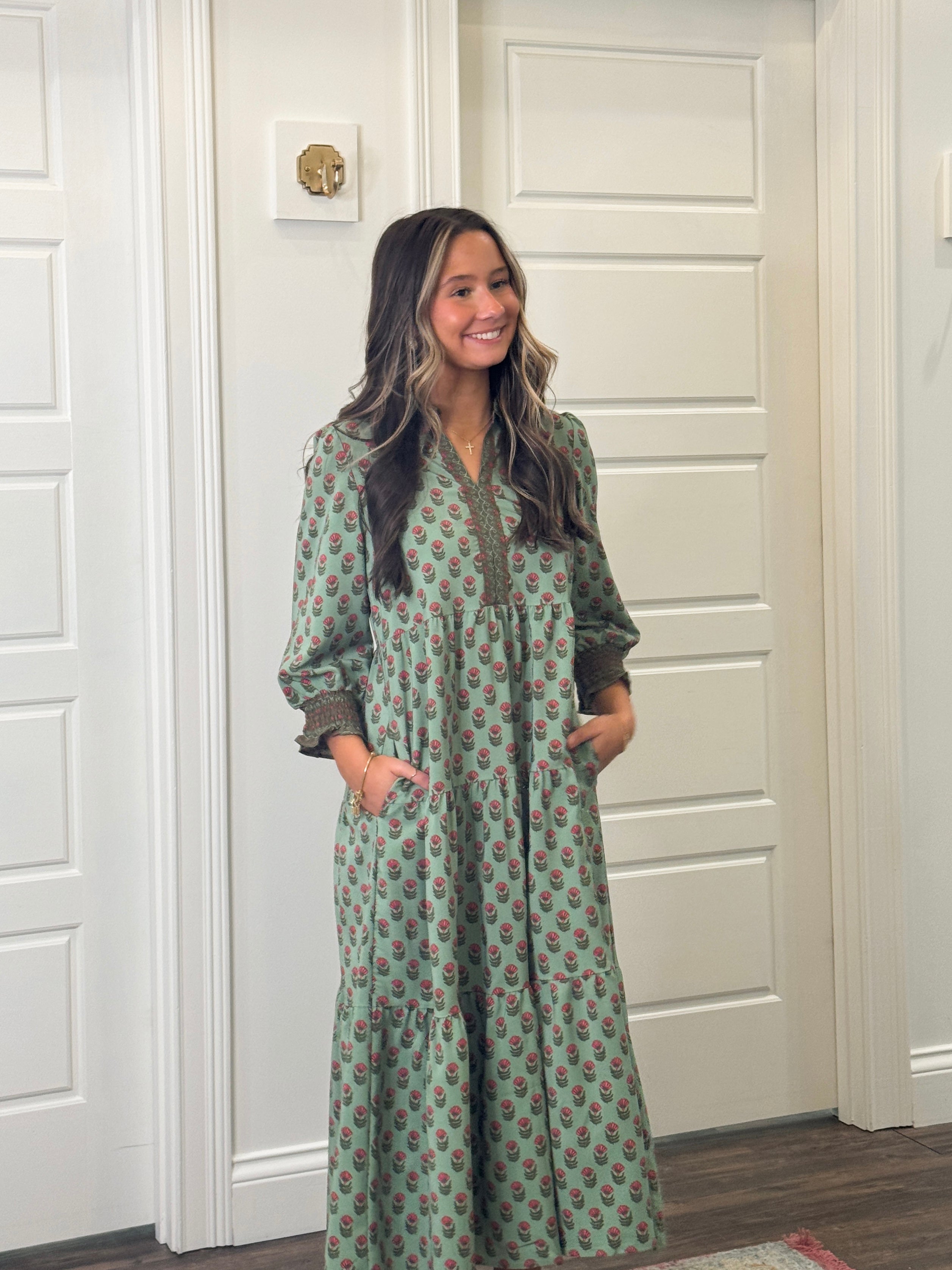 The Eleanor Rosy Meadow Dress brings a playful splash of nature’s charm with its vibrant green fabric and delicate pink accents. Designed in a maxi length, this long-sleeve dress flows gracefully, perfect for twirling through meadows or making a statement at any garden party. Its lively colors and comfy fit make it an effortless choice for joyful days and breezy evenings alike.