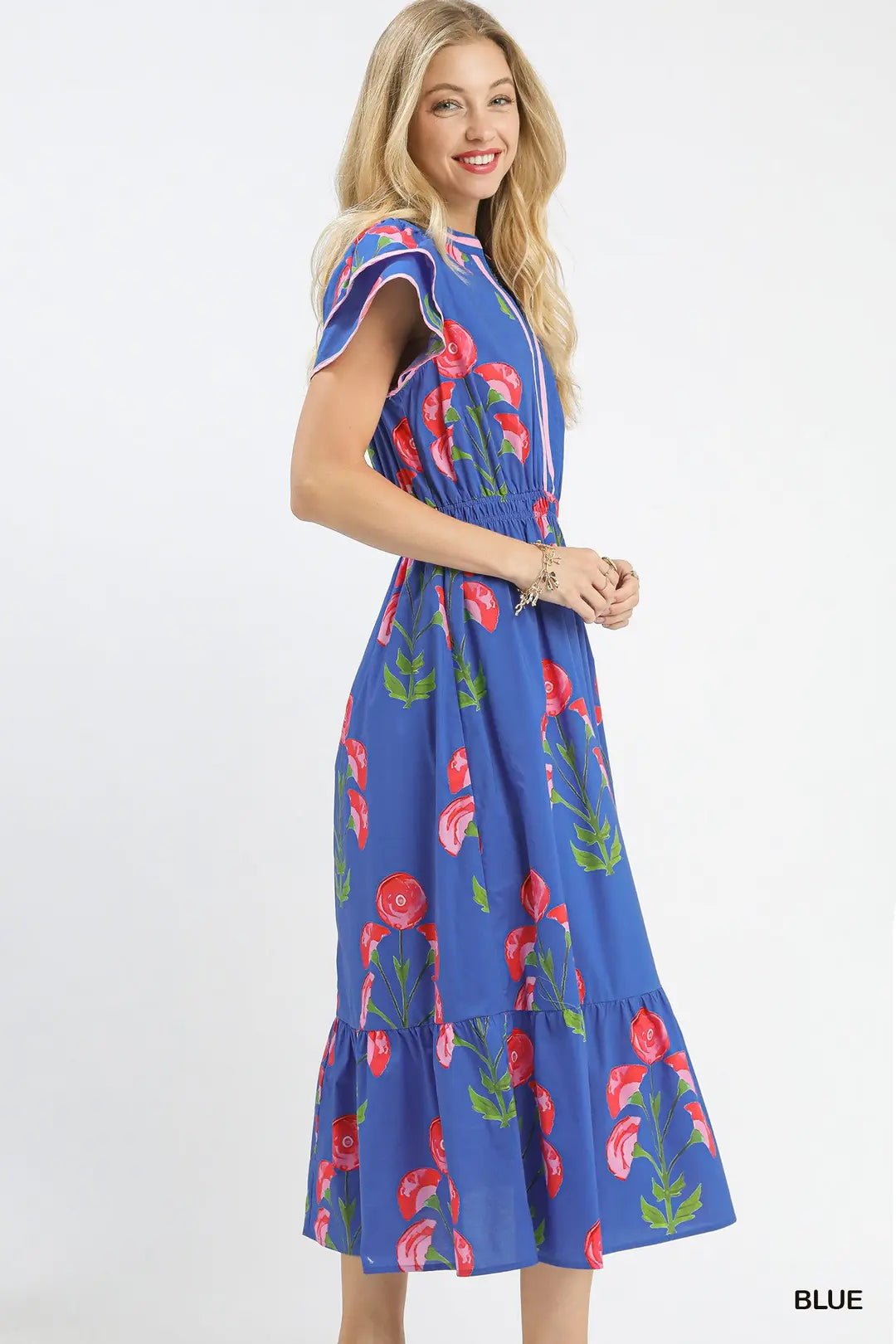 Twirl through your day in this charming Blossom Meadow Dress, where whimsical florals meet effortless elegance. The split V-neck with contrast trim and playful puff sleeves add personality, while the midi length keeps things sophisticated. An elastic waistband ensures comfort, and the lined skirt provides coverage and movement. Perfect for garden parties, brunch dates, or whenever you want to feel like you're strolling through a blooming meadow.