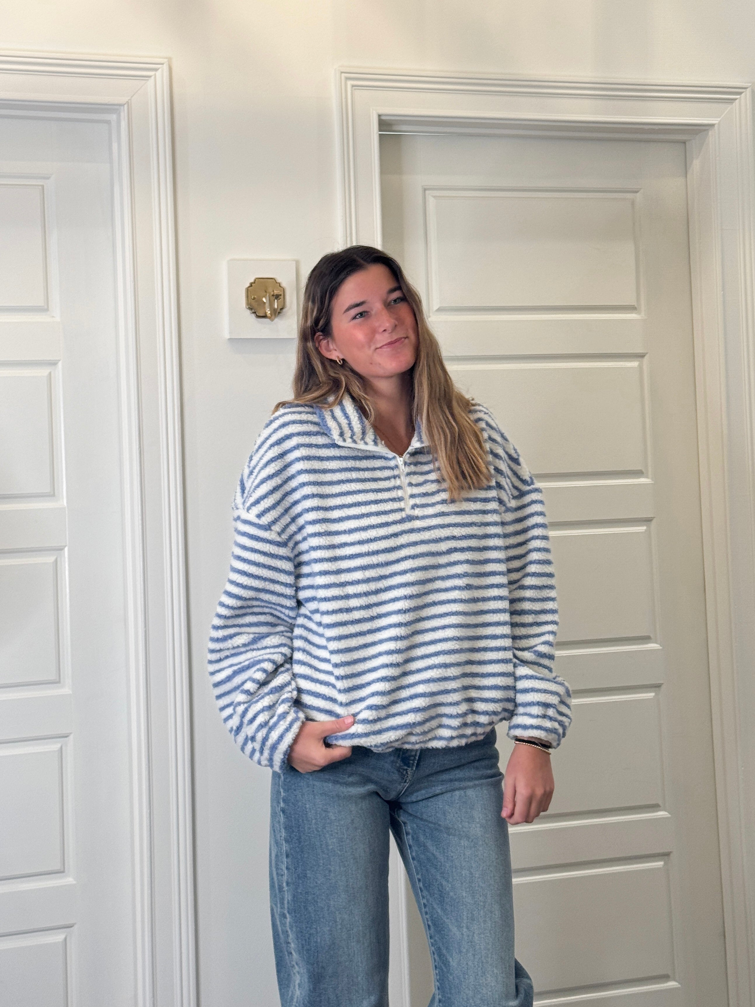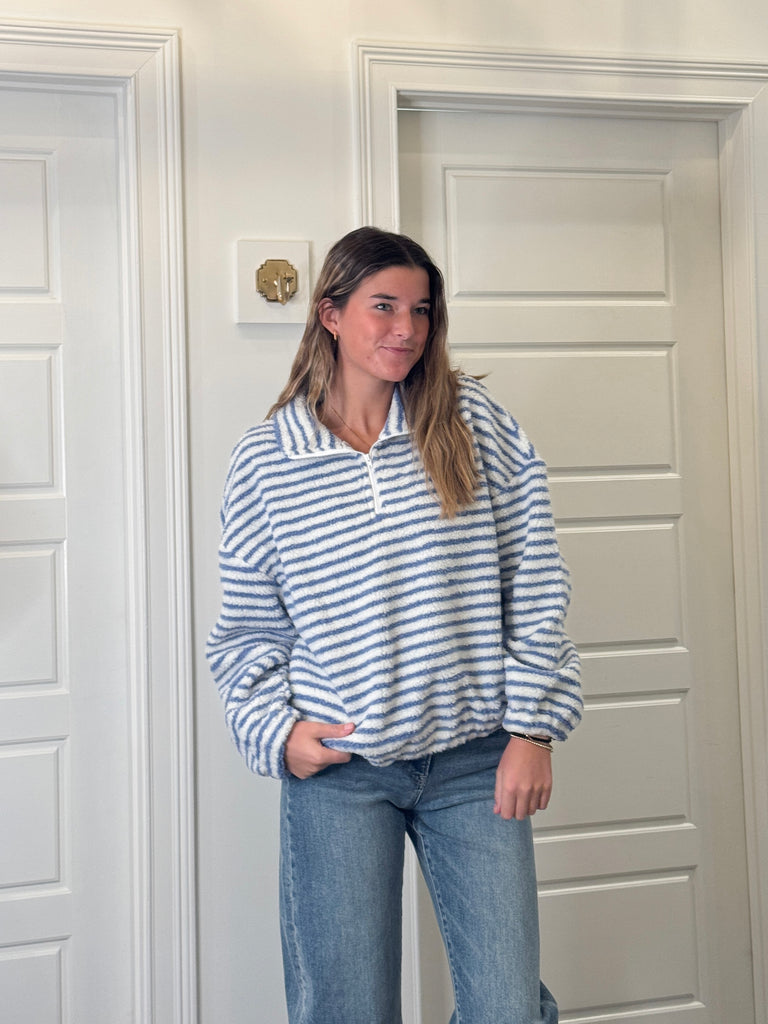 Cozy up in The Blue Drift Pullover, a playful blue and white striped sherpa that wraps you in soft warmth with a fun, breezy vibe. Perfect for chilly days when you want comfort and style to drift together effortlessly.
