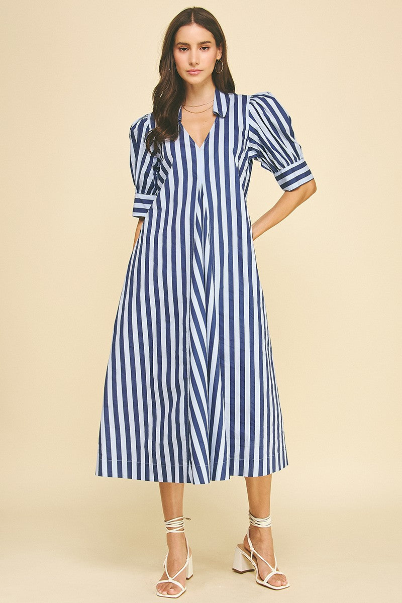 The Harbor Lane Dress is your new go-to for effortless elegance. This charming midi dress features a classic V-neck silhouette paired with a crisp dark and light blue striped pattern that's both timeless and playful. Perfect for everything from casual weekend outings to dressed-up dinners, the relaxed fit flatters all body types while the midi length keeps things sophisticated. Slip it on and let the stripes do the talking—because sometimes the best style choices are the ones that make you smile.