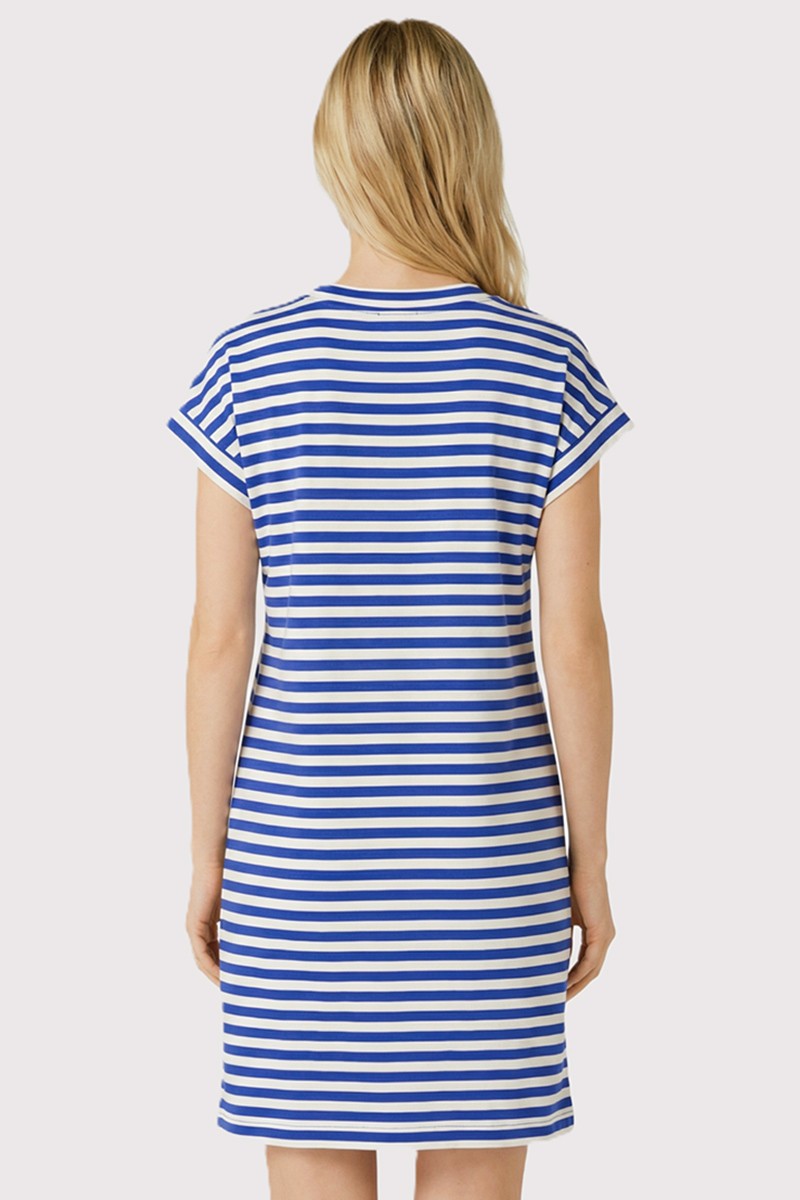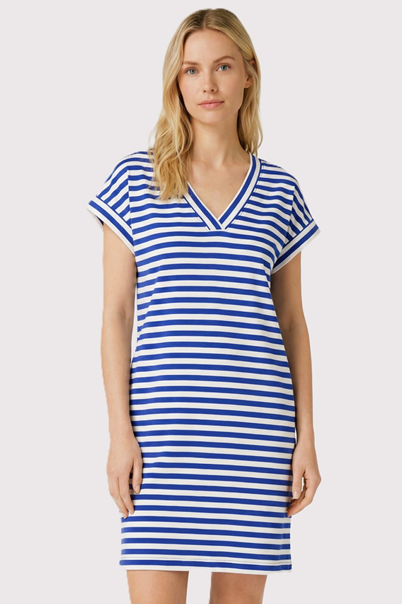 Stripes never looked so good! This charming dress features a crisp white and royal blue stripe pattern that's both timeless and fun. The flattering V-neckline and short sleeves keep things breezy, while the mini length shows off your legs. Best part? Functional pockets mean you can actually carry your essentials. Perfect for casual outings, weekend adventures, or whenever you want to look put-together without trying too hard.