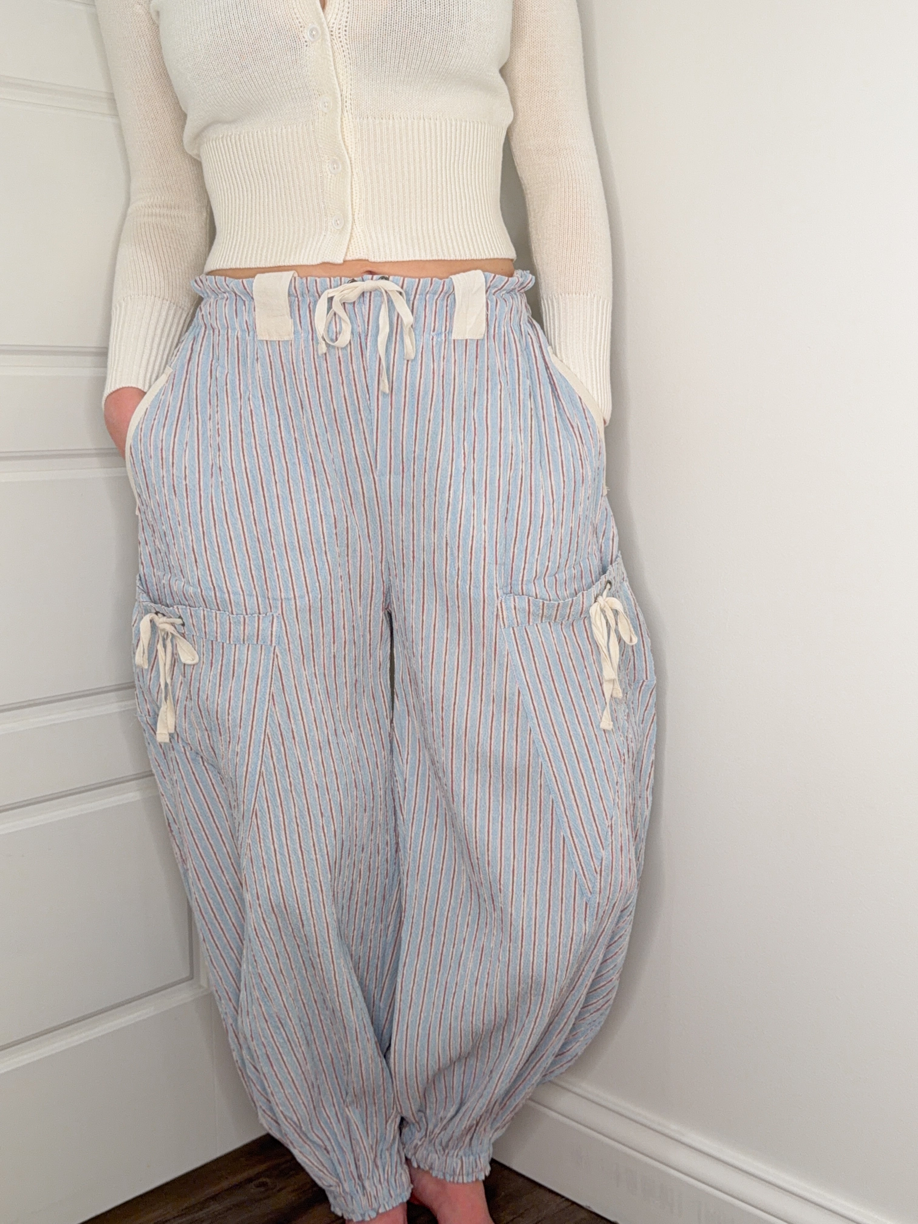 The Pocket Lane Pants bring fun and function together in this charming striped design. Featuring a soft milky blue and pink palette, these cargo pants showcase adorable bow-adorned pockets that add personality to every outfit. The elastic waistband ensures all-day comfort, whether you're running errands or hanging out with friends. Perfect for anyone who loves mixing style with practicality!