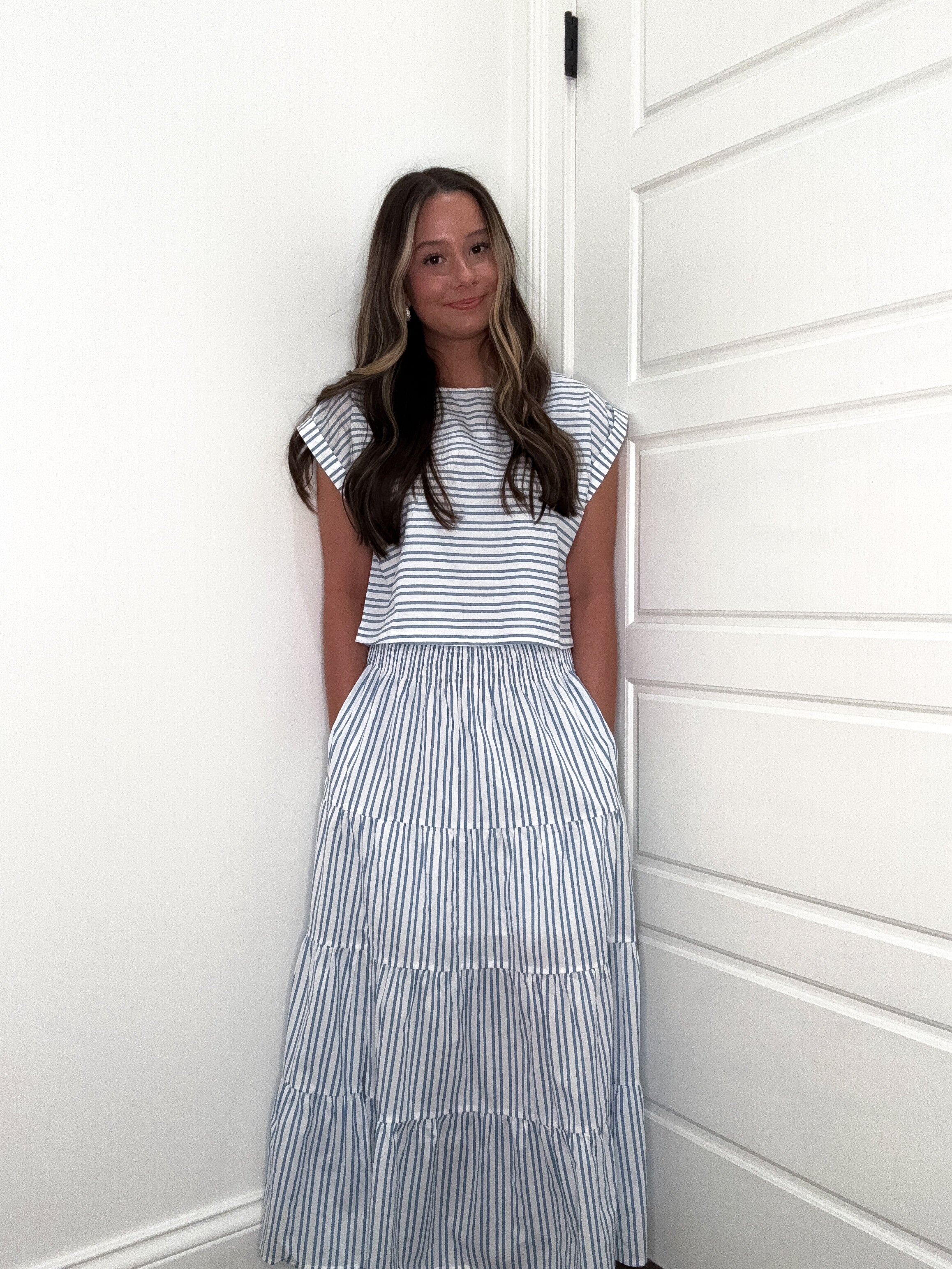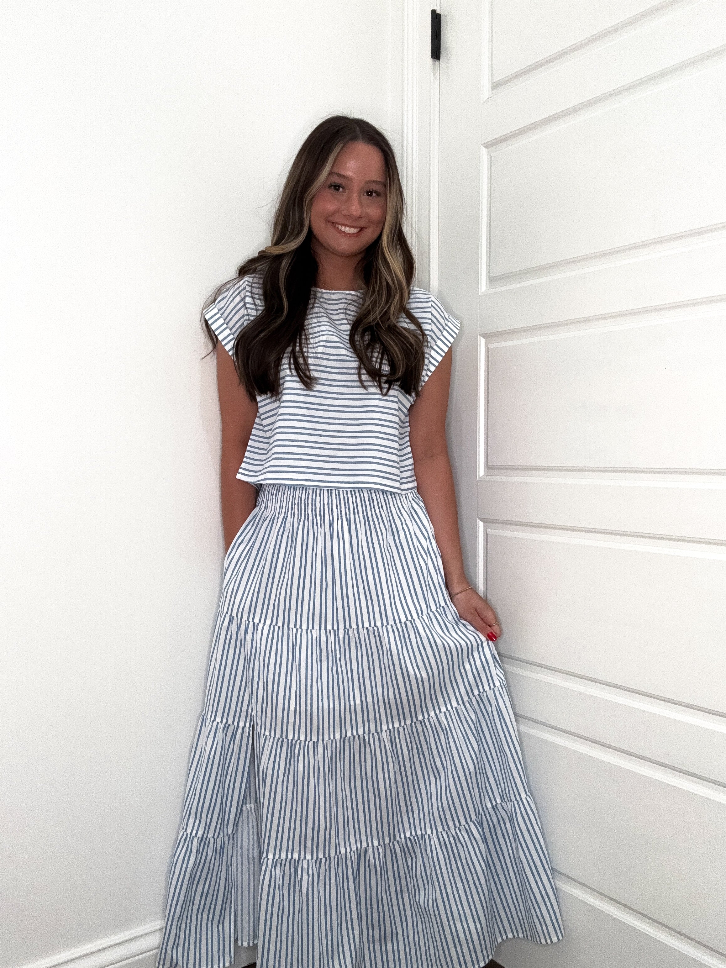 Crisp lines meet carefree style in this charming two-piece set. The white midi skirt features delicate blue stripes that dance down the fabric, while the coordinating white top echoes the same playful pattern. Perfect for creating a put-together look that feels effortlessly cool. Mix them together or style separately for endless outfit possibilities. Clean, graphic, and undeniably fun.