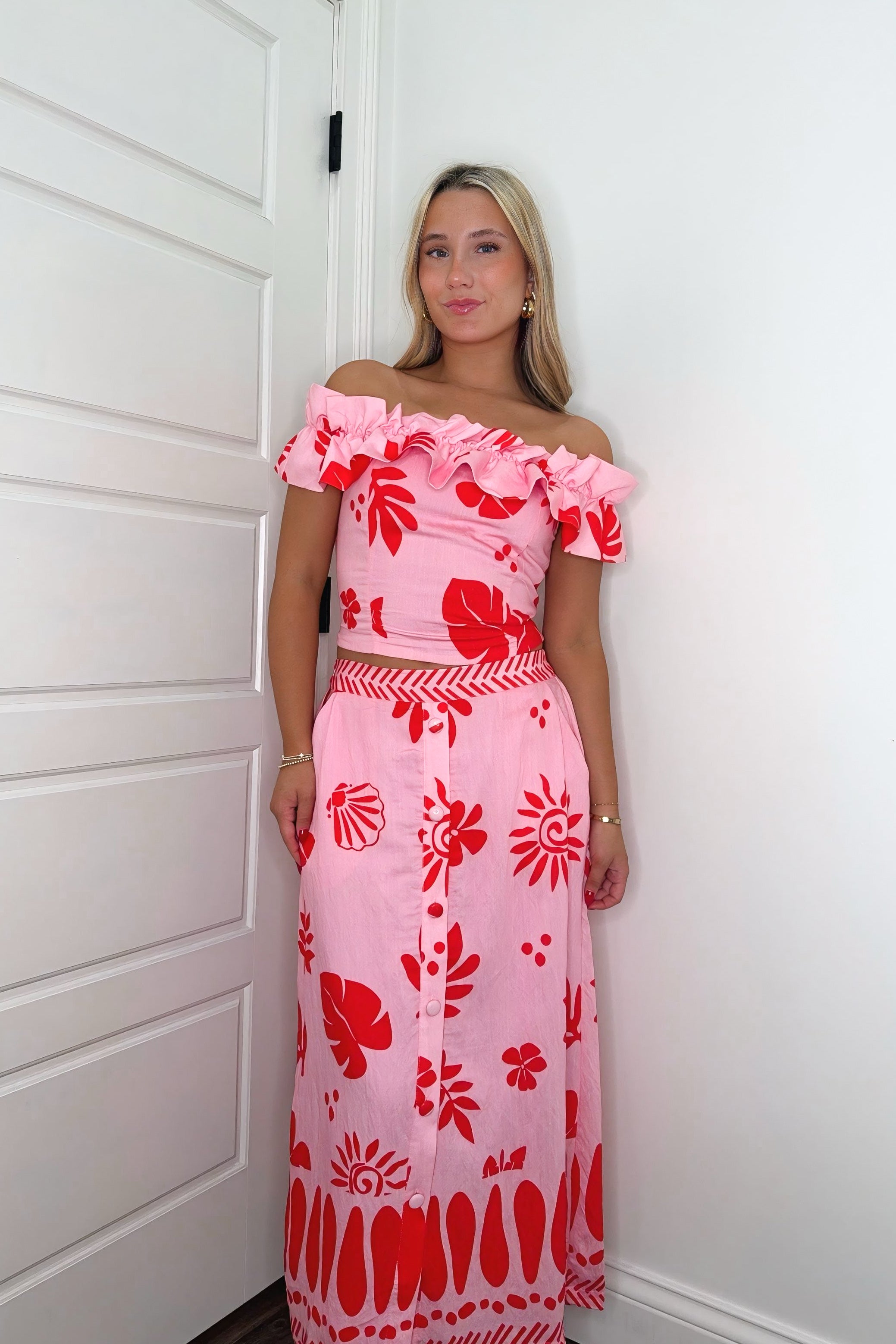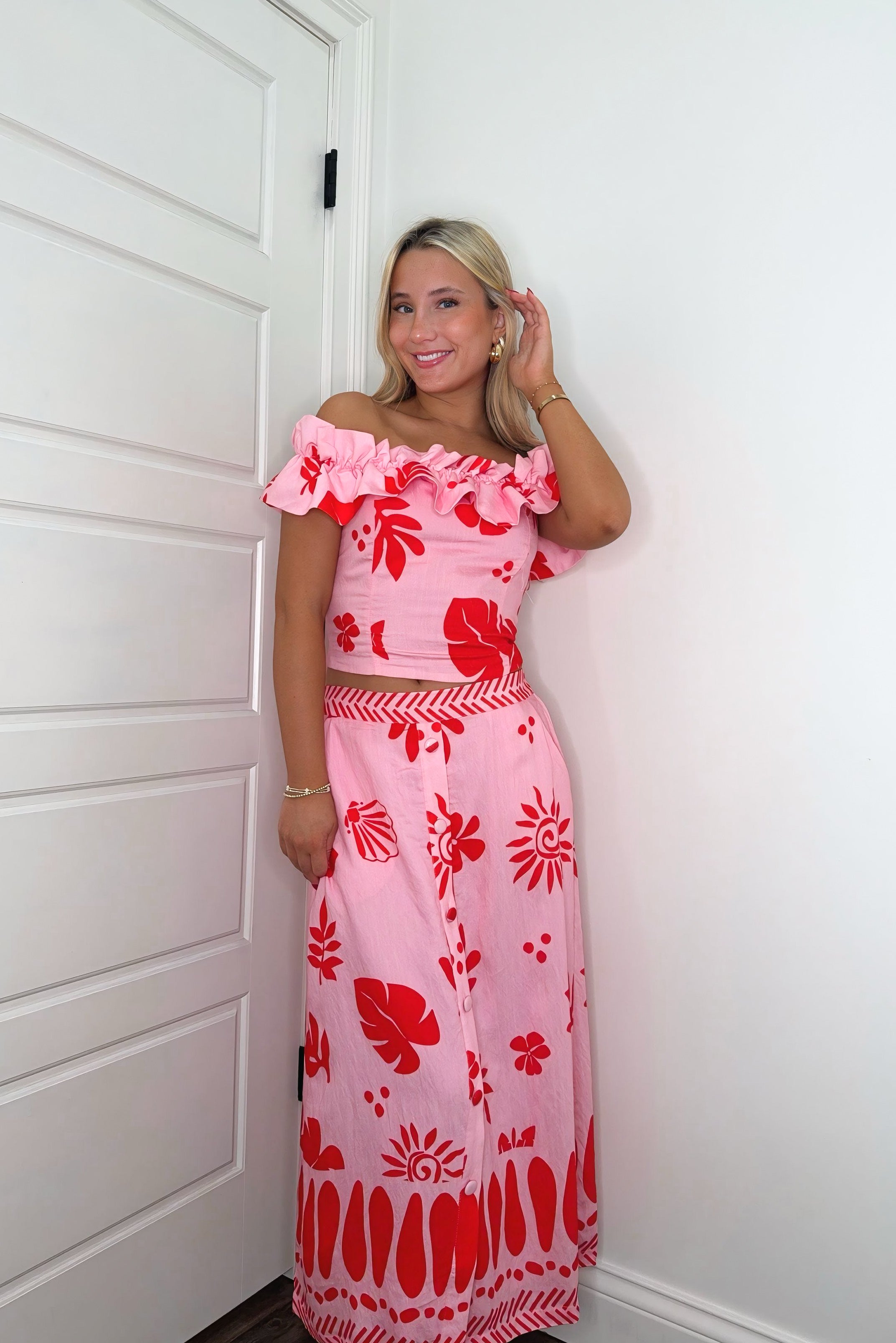 Make a splash in this vibrant two-piece set that's pure tropical fun! The strapless top features a bold pink and red flamingo print that shows off your shoulders, while the matching midi skirt brings the same eye-catching design with charming button-front detailing. Perfect for summer outings, beach getaways, or any occasion calling for a pop of color and personality. Mix, match, or wear together—this set delivers effortless style with a playful twist.