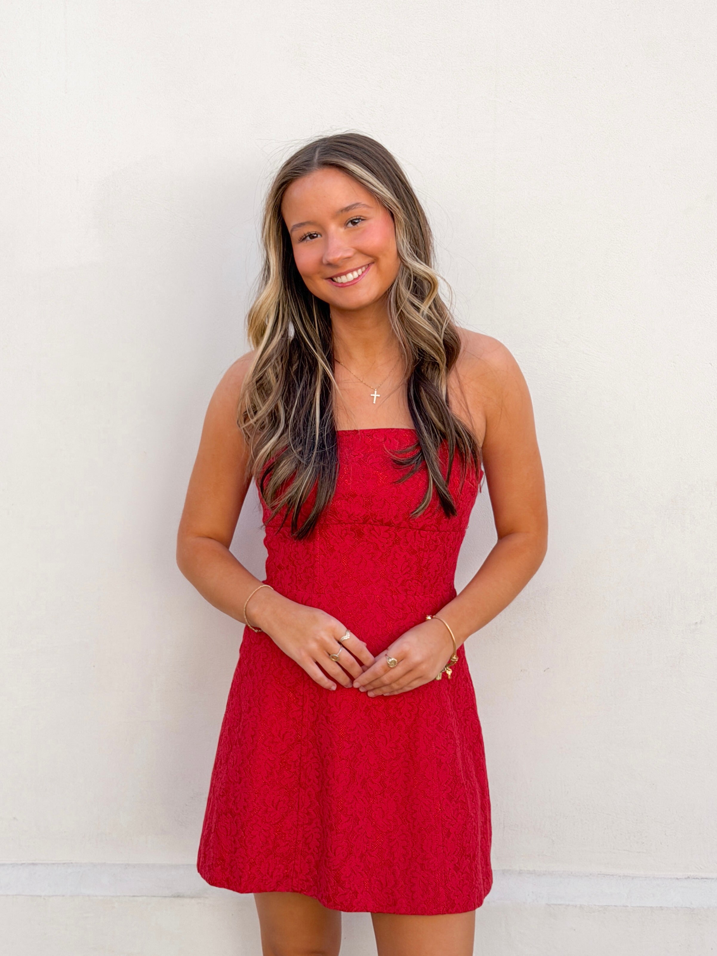 Twirl into the season in this show-stopping red sparkly lace dress! Delicate lace catches the light with every move, while the charming bow detail on the back adds an extra touch of festive flair. Perfect for holiday parties, special occasions, or whenever you want to feel absolutely radiant. This strapless beauty combines elegance with playful sparkle for a look that's unforgettably you.