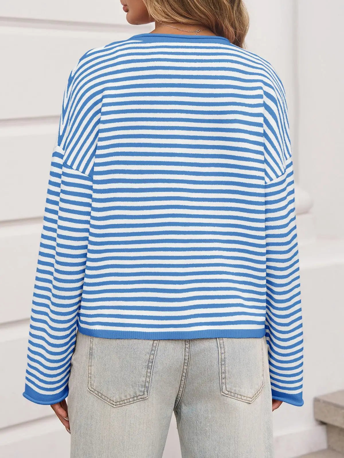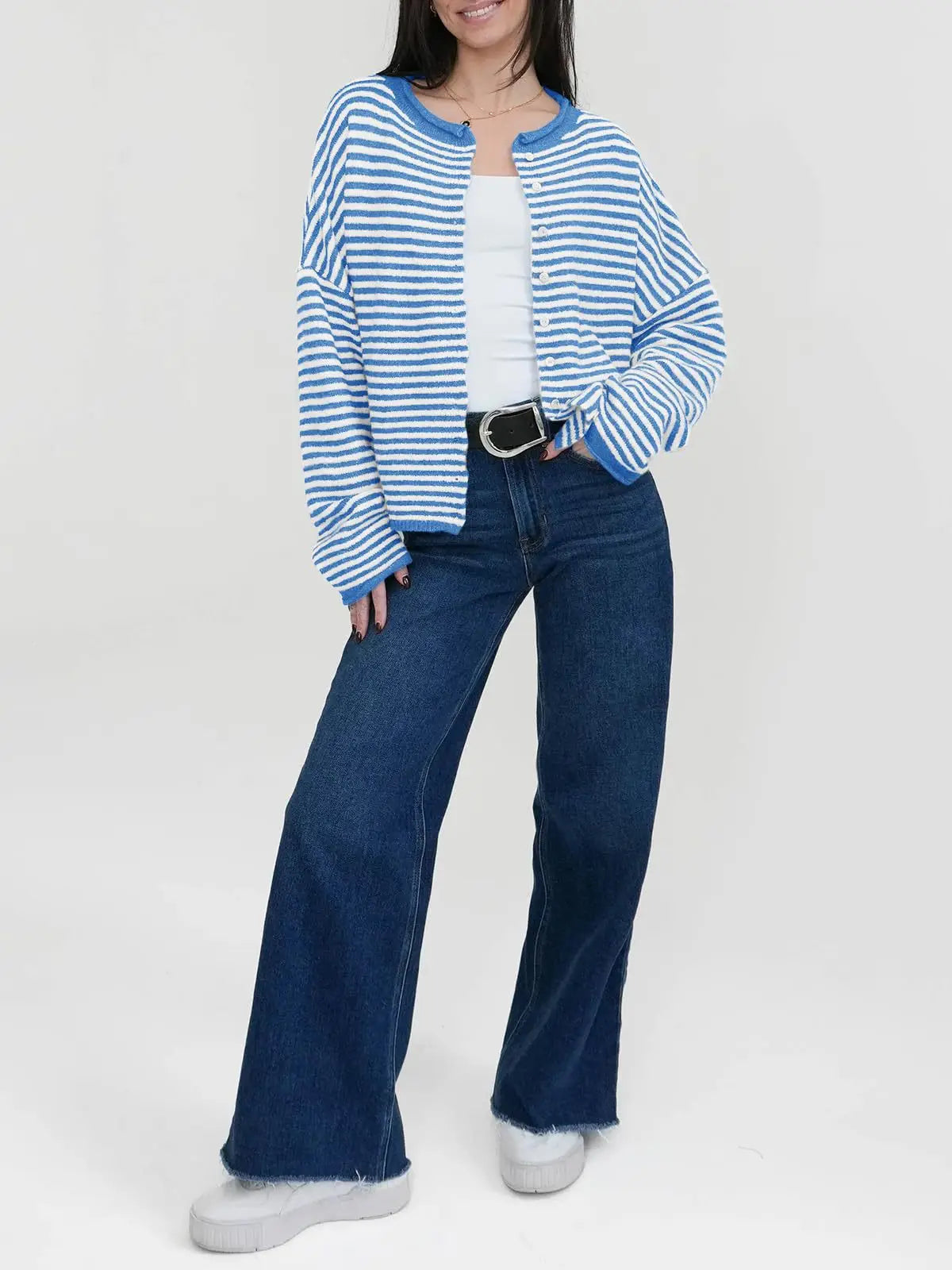 Celebrate school spirit in style with this vibrant royal blue and white striped sweater! Perfect for Spirit Week or everyday wear, this button-down design combines classic stripes with a fun, energetic vibe. The crisp color contrast makes a bold statement while the comfortable fit keeps you looking sharp all day long. Show your pride and personality with this must-have striped essential.