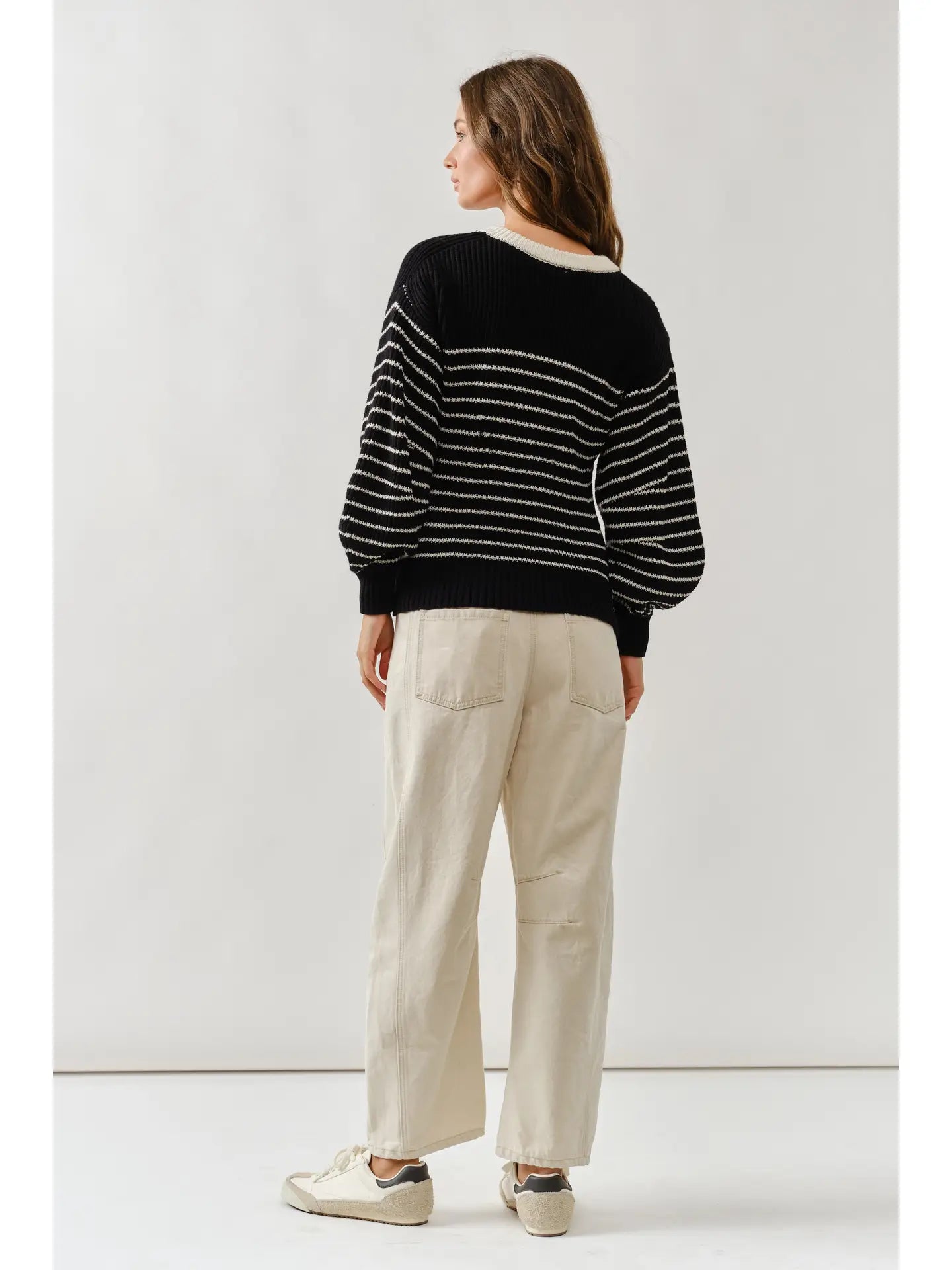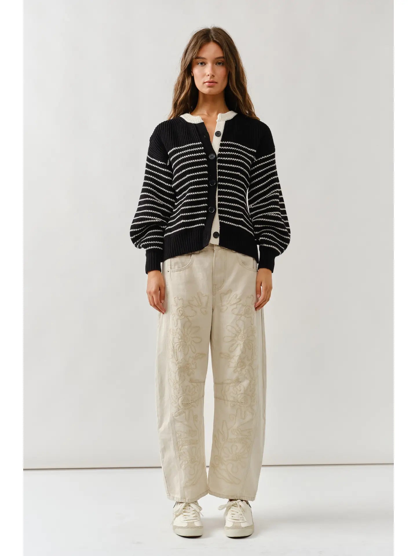 The Cambridge Cardigan brings a fresh twist to your wardrobe with bold white stripes running vertically against a sleek black backdrop. Its crisp white collar adds a fun, preppy vibe that's perfect for mixing and matching. Cozy yet stylish, this cardigan is ready to brighten up any outfit with a splash of charm and a wink of sophistication.