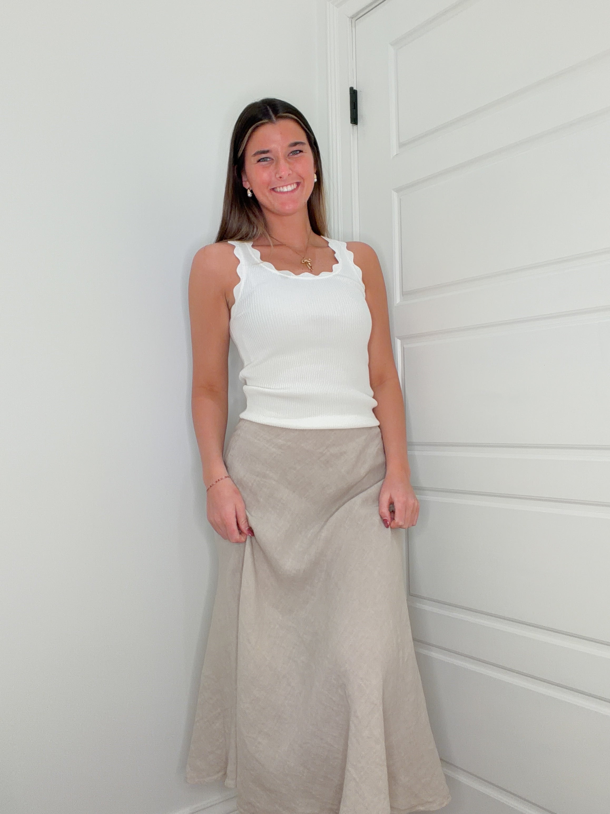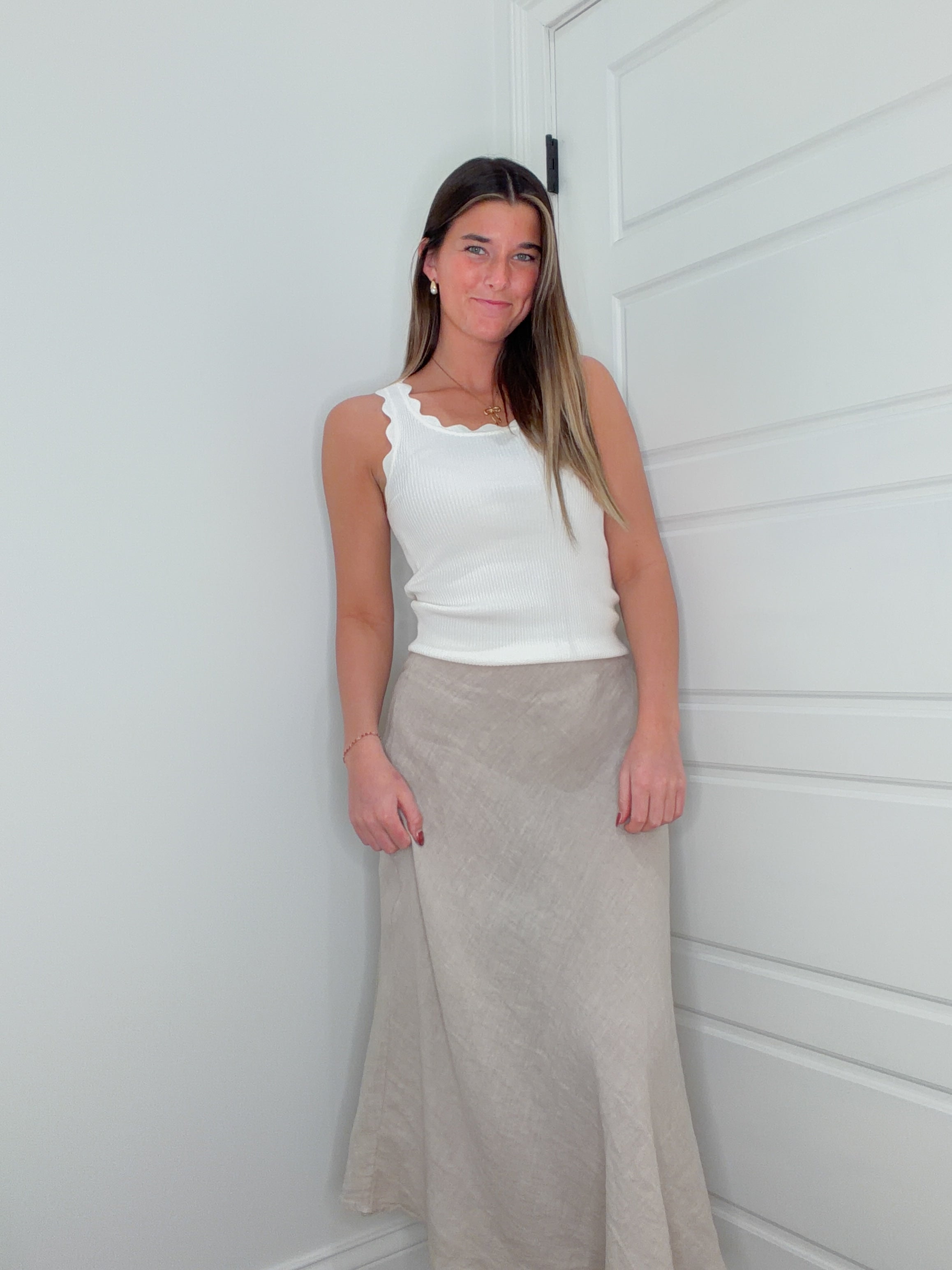 Escape to breezy seaside vibes with this effortless beige linen midi skirt. The Coastal Charm brings relaxed elegance to your everyday wardrobe—perfect for strolling through farmers markets, beach getaways, or lazy afternoons on the porch. Crafted from breathable linen, it moves with you while keeping cool when temperatures rise. Pair it with your favorite sandals and a light blouse for that coveted coastal-inspired look that feels like a permanent vacation.