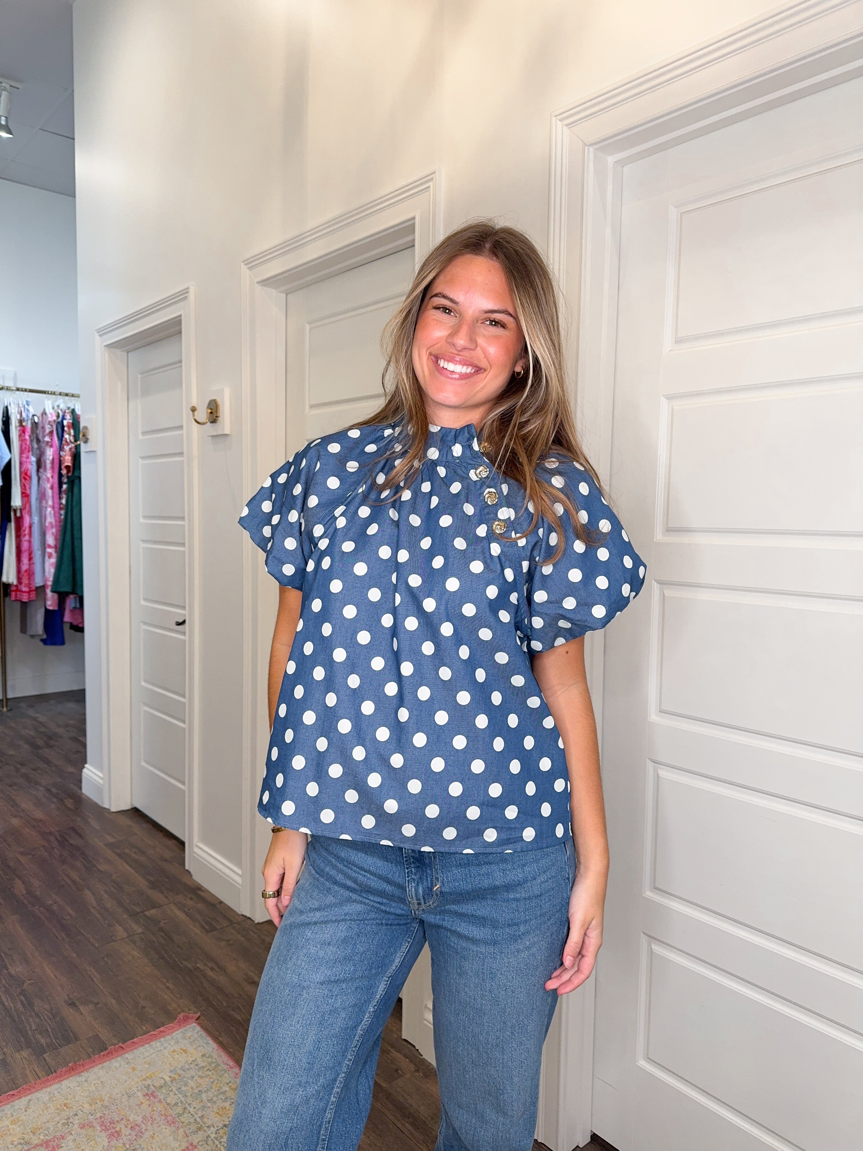 Brighten your wardrobe with this charming polka dot top! Featuring a cheerful blue base adorned with crisp white dots, it's the perfect blend of classic style and modern flair. The puff sleeves add a touch of whimsy and feminine charm, making it ideal for casual outings, weekend brunches, or simply elevating your everyday look. Versatile enough to pair with jeans, skirts, or trousers, this playful piece brings instant personality to any outfit.