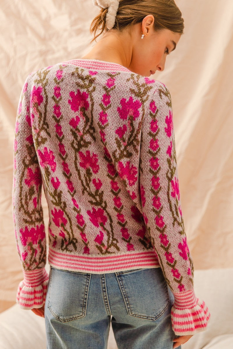 Get ready to bloom in style with our In Full Bloom Sweater! This sweater features a vibrant green color and comes with the added bonus of long sleeves with buttons in front, available in either charming pink or cool blue. Upgrade your wardrobe with this playful and unique addition.