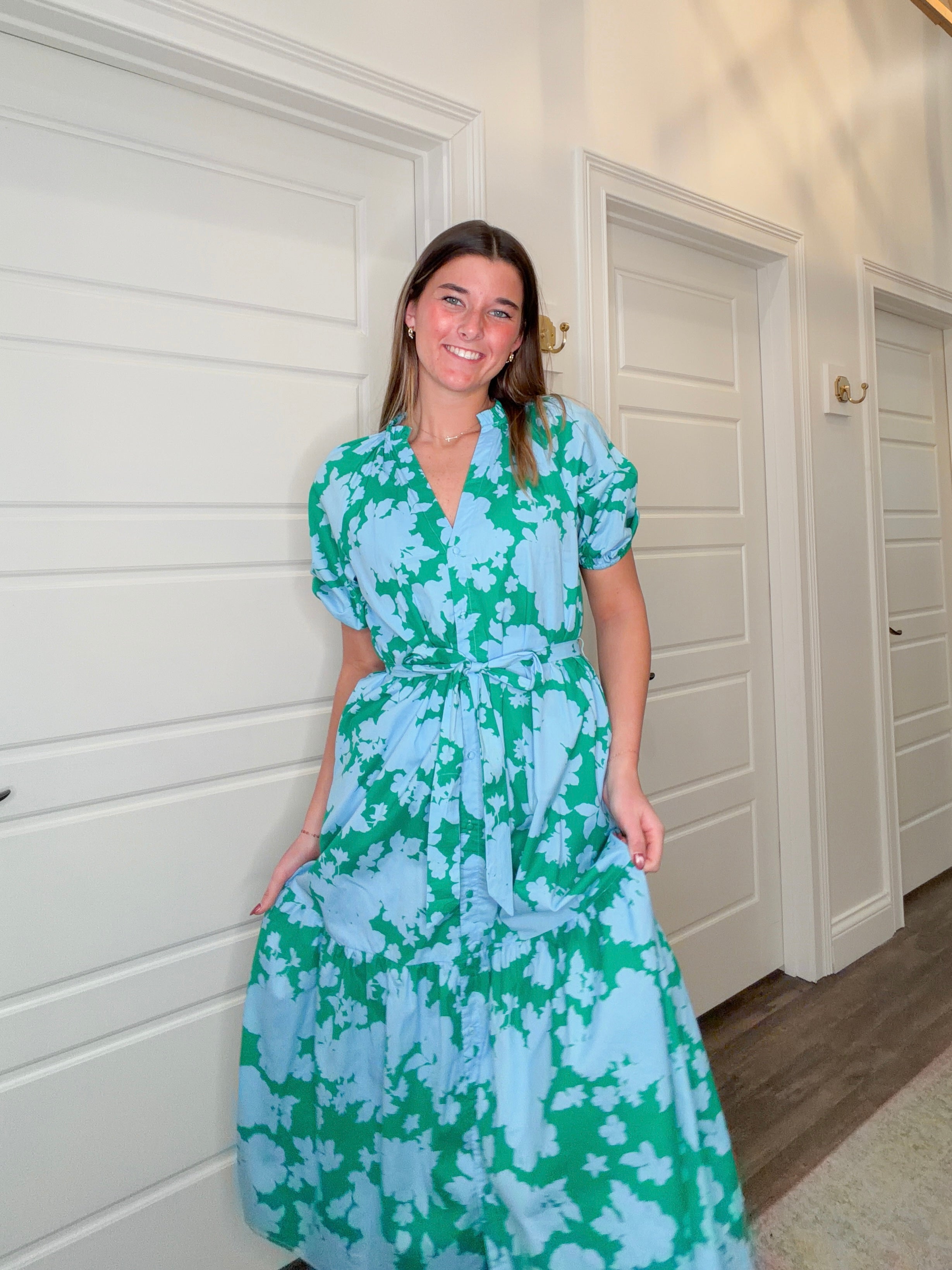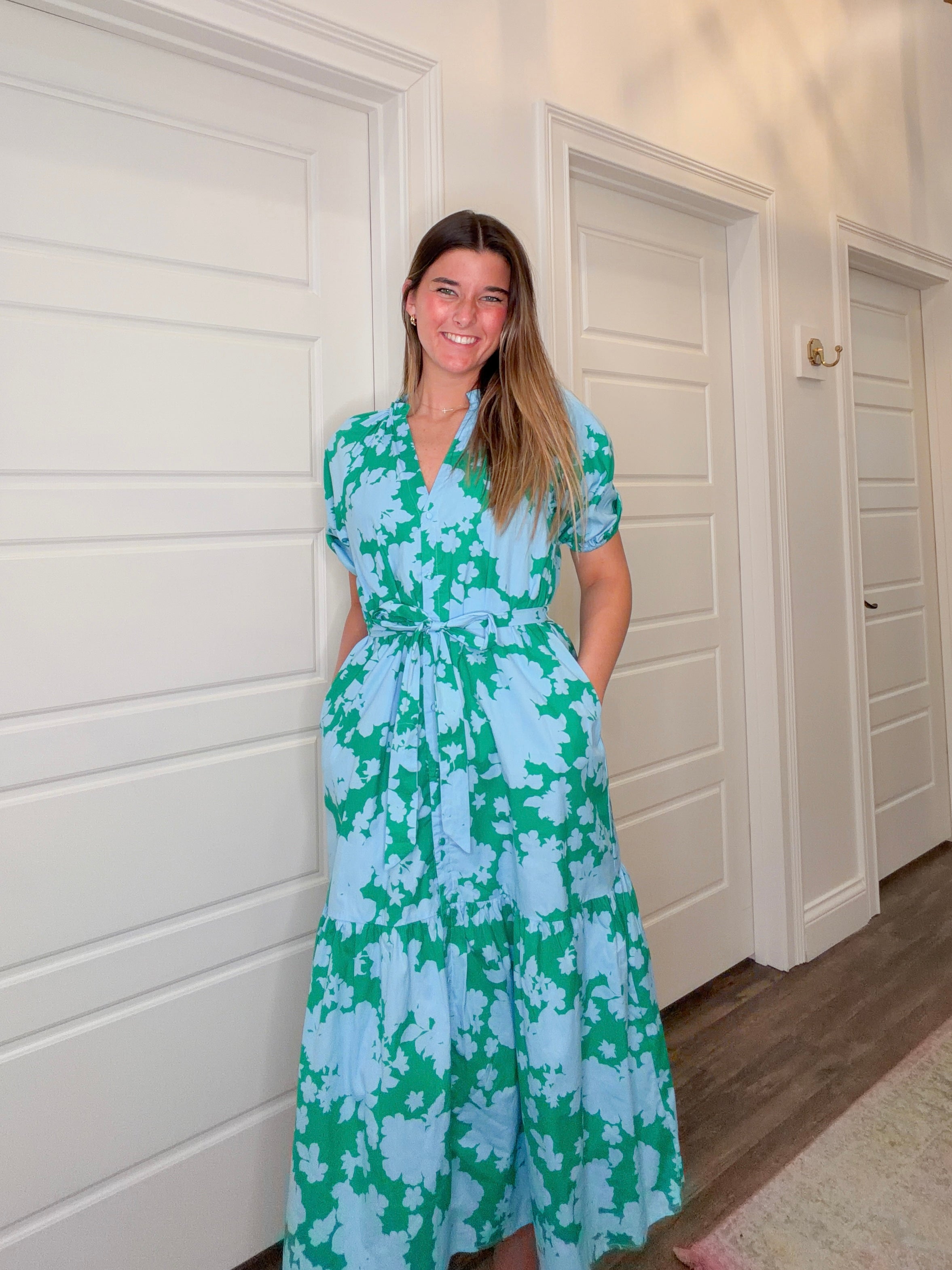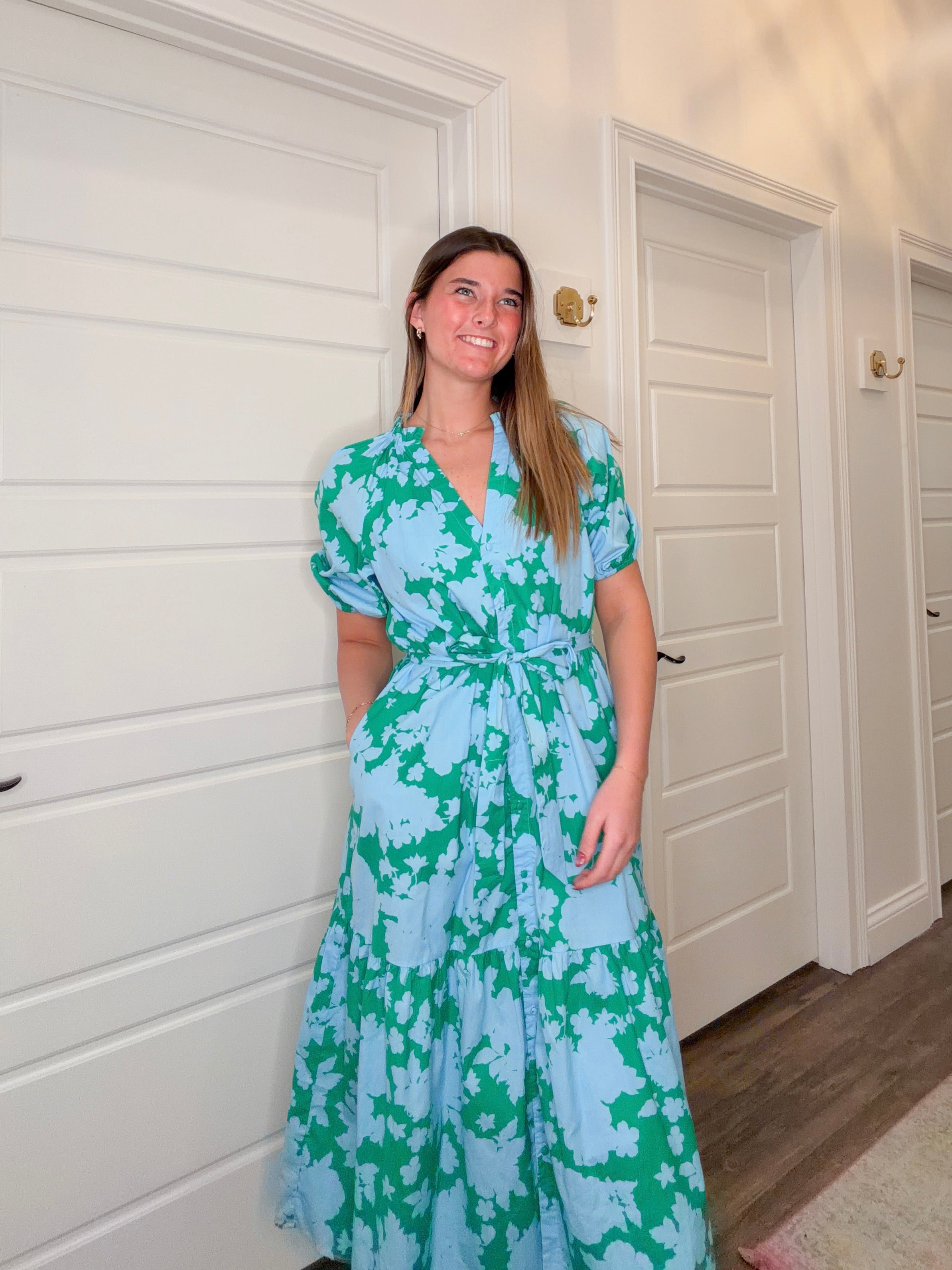 Twirl into spring with the Riona Floral Tiered Midi Dress! This charming piece features a vibrant blue floral pattern dancing across lush green fabric, creating an eye-catching look that's anything but ordinary. The flattering V-neckline and tiered silhouette offer effortless elegance, while the adjustable belt cinches your waist for a polished finish. Short sleeves keep things breezy and comfortable, making it perfect for garden parties, brunch dates, or whenever you want to add a pop of botanical beauty to your wardrobe. Dress it up or down—this versatile midi is ready for adventure!