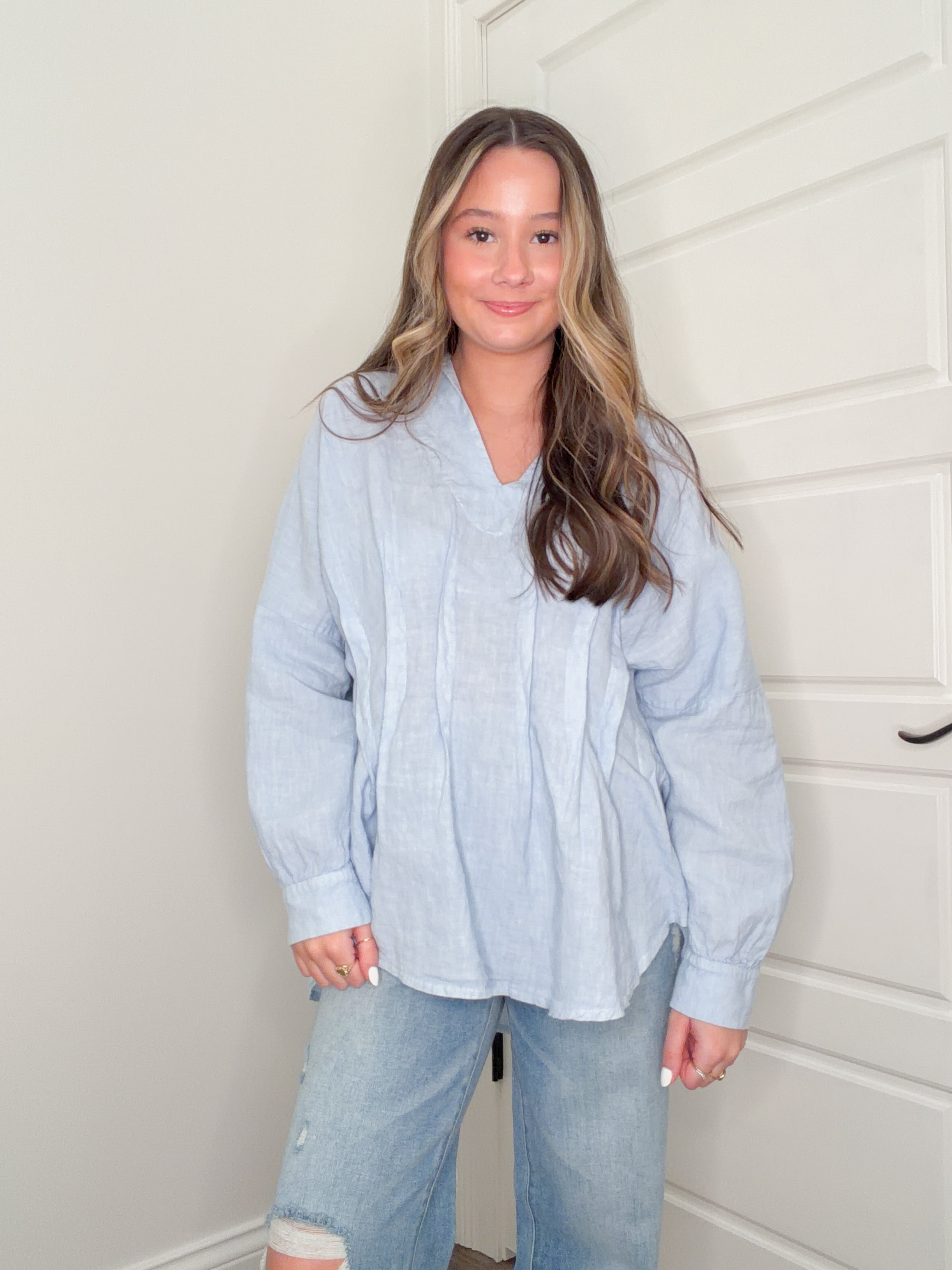 Catch the breeze in our Coastline Linen Top, where effortless elegance meets laid-back charm. This light blue beauty features delicate pleats that add dimension and movement, while the flattering V-neckline keeps things fresh and modern. Crafted from breathable linen, it's your go-to piece for warm weather adventures—whether you're strolling the boardwalk or heading to brunch. Comfortable, versatile, and undeniably chic.