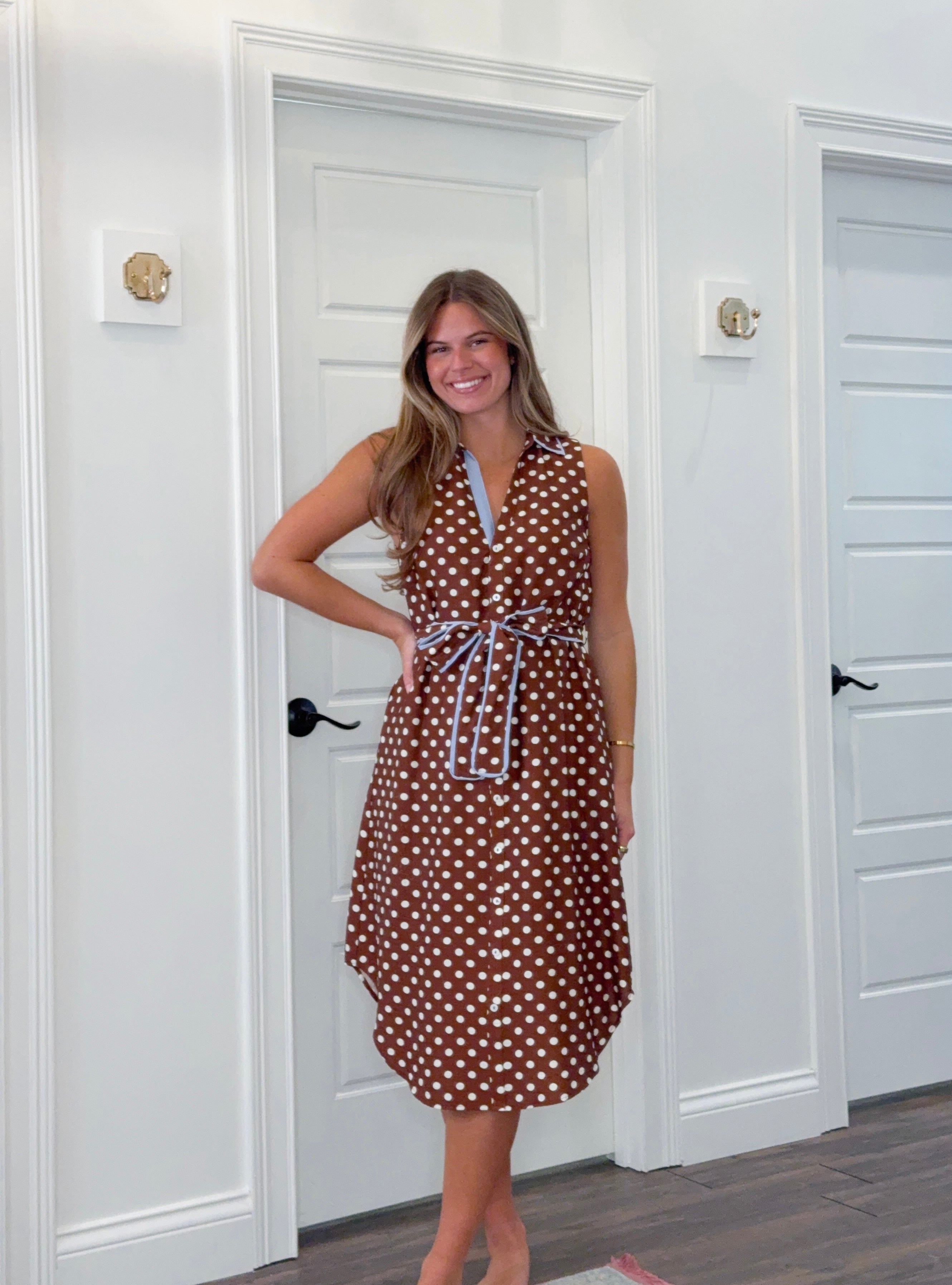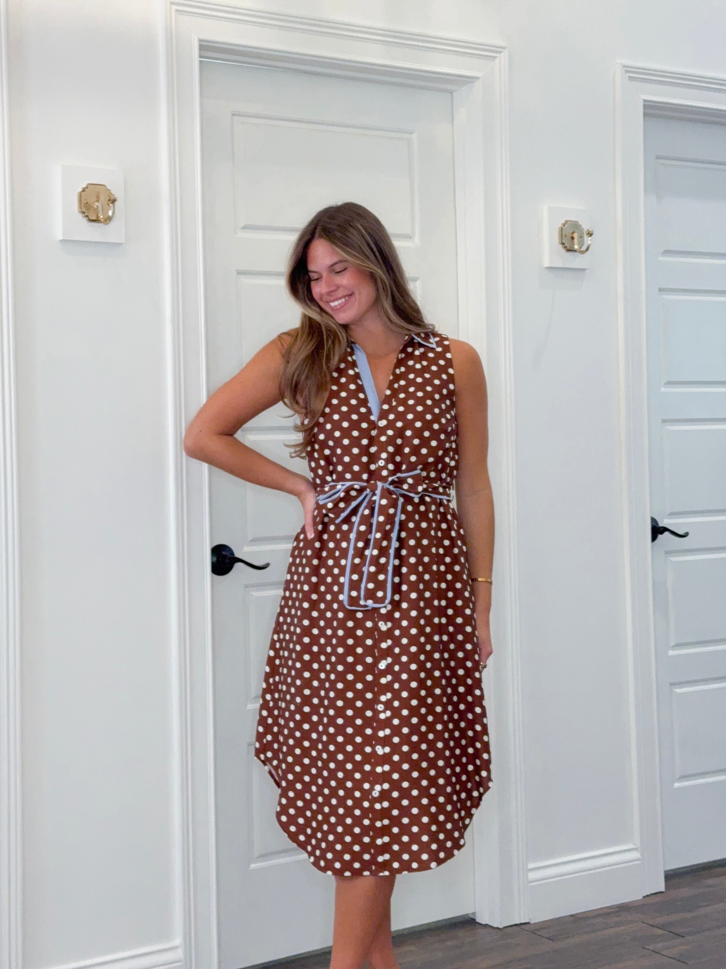 Embrace your playful side in this charming brown midi dress, adorned with crisp white polka dots that dance across the fabric. The sleeveless silhouette keeps things breezy and effortless, while delicate blue detailing adds a pop of personality. Classic button-down styling makes it easy to dress up or down—perfect for everything from casual brunches to weekend adventures. A timeless piece that brings vintage-inspired fun to your everyday wardrobe.