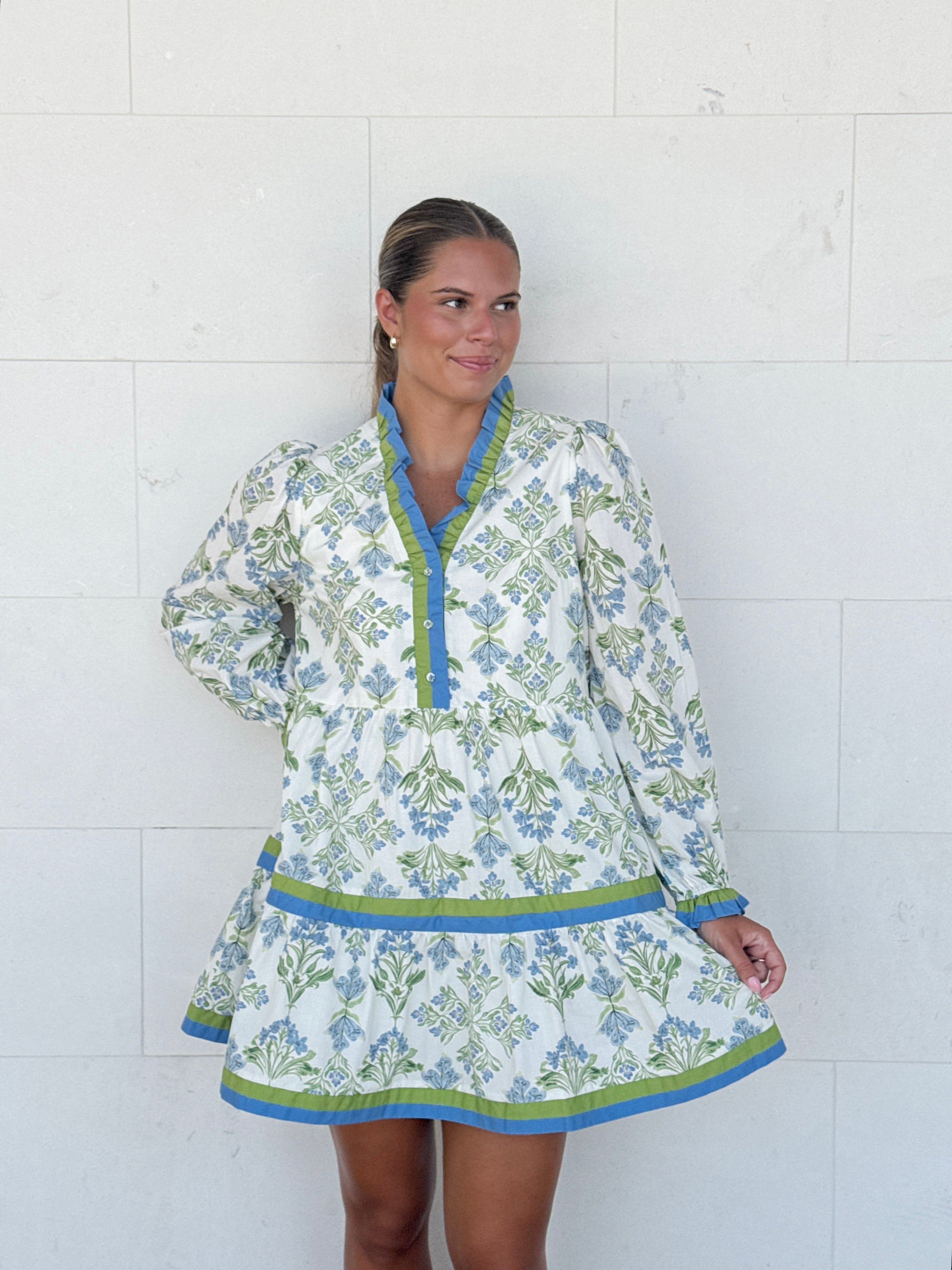 Step into a garden of charm with the Among The Wildflowers Dress. This cream dress, dotted with blue and green flowers, brings a fresh, playful vibe to your wardrobe. Its long sleeves and short length create a perfect balance of cozy and flirty, making it ideal for sunny days and breezy evenings alike. Embrace your wild side with a dress that’s as lively and lovely as a stroll through blooming wildflowers.